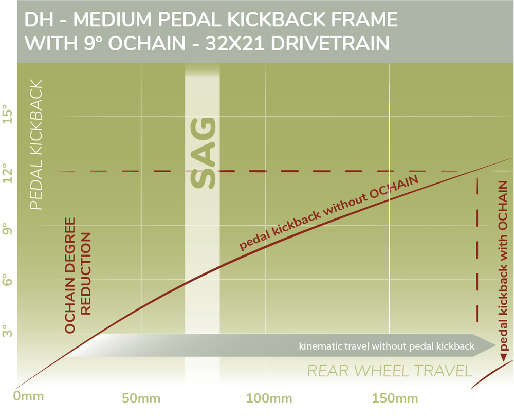 En « reculant », la roue arrière va donc tirer sur la chaîne. Or, à cause son inertie, des résistances du terrain et d’un éventuel freinage, la roue ne peut pas tourner en arrière pour absorber cet allongement. La tension de la chaîne va donc tirer sur les manivelles, de façon à les faire tourner en arrière pour allonger la chaîne et ainsi absorber cette variation de longueur : c’est le kick-back, qu’on caractérise en mesurant l’angle sur lequel se déplacent les manivelles. Cet effet dépend beaucoup de la position du brin tendu de la chaîne et donc du rapport utilisé. On peut ainsi avoir très peu de kick-back en milieu de cassette et beaucoup plus sur les plus grands pignons, a fortiori si on utilise un petit plateau.