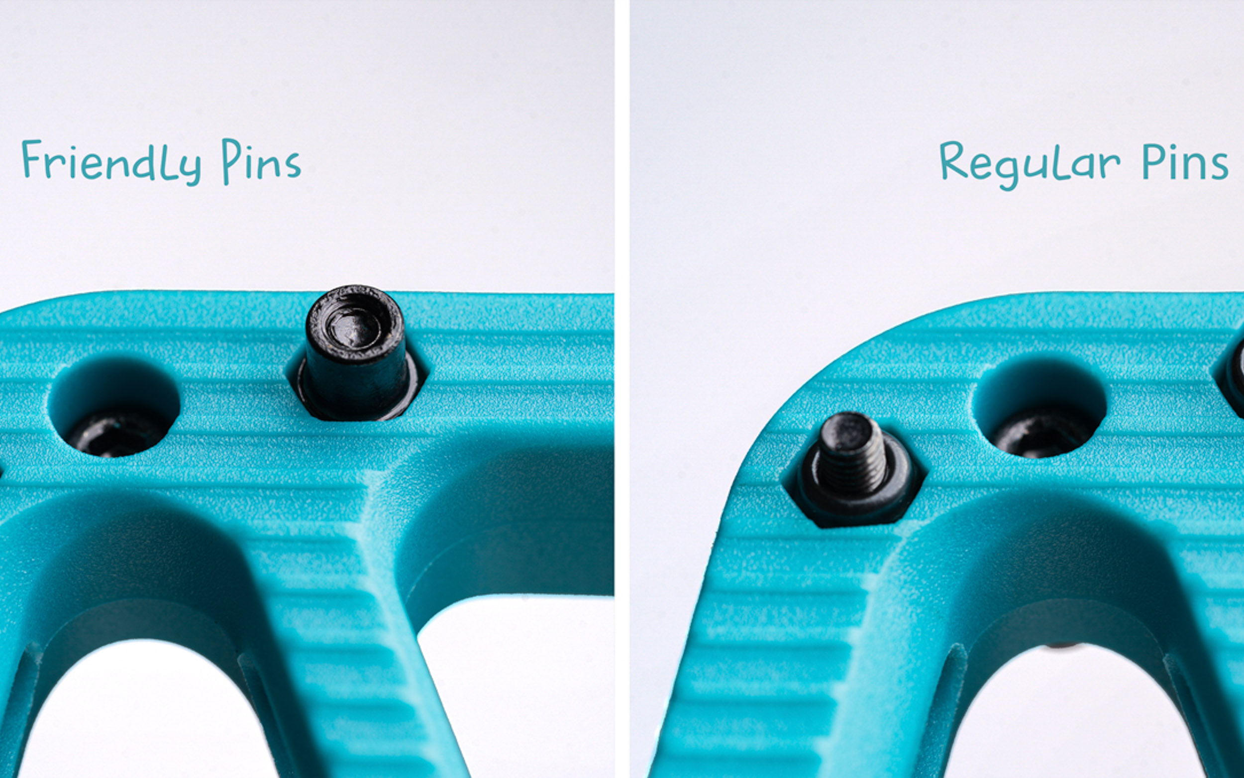 Côté accroche, ce sont 7 picots par face qui sont chargés d’assurer le maintien du pied. Il faut toutefois noter que, de série, les Small Composite sont équipées avec ce que la marque canadienne appelle des « Friendly Pins« , à savoir un écrou en aluminium recouvrant le picot sous forme de filetage tel que nous le connaissons. Il est toutefois possible d’interchanger ces « Friendly Pins » avec des picots plus classiques, également livrés avec les Small Composite. « Cette solution est idéale pour les enfants. Ces picots permettent d’augmenter l’adhérence de la pédale au fur et à mesure que votre chère tête blonde prend de l’assurance et de l’habileté », explique OneUp.