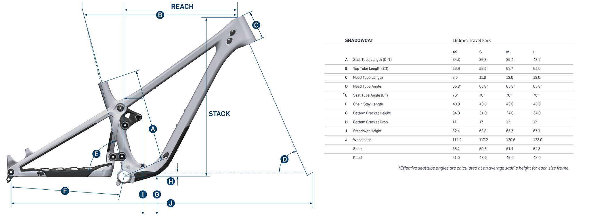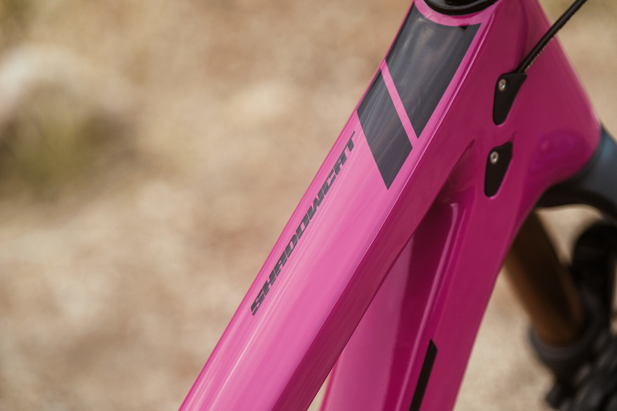 Côté géométrie, le Shadowcat repose sur un angle de direction à 65,8°, un angle de tube de selle à 76° et des bases de 430 mm. Le reach est lui fixé à 460 mm en taille M. Contrairement à d’autres vélos de la gamme comme le Firebird, il n’y a pas de flipchip pour ajuster la géométrie sur ce Shadowcat.