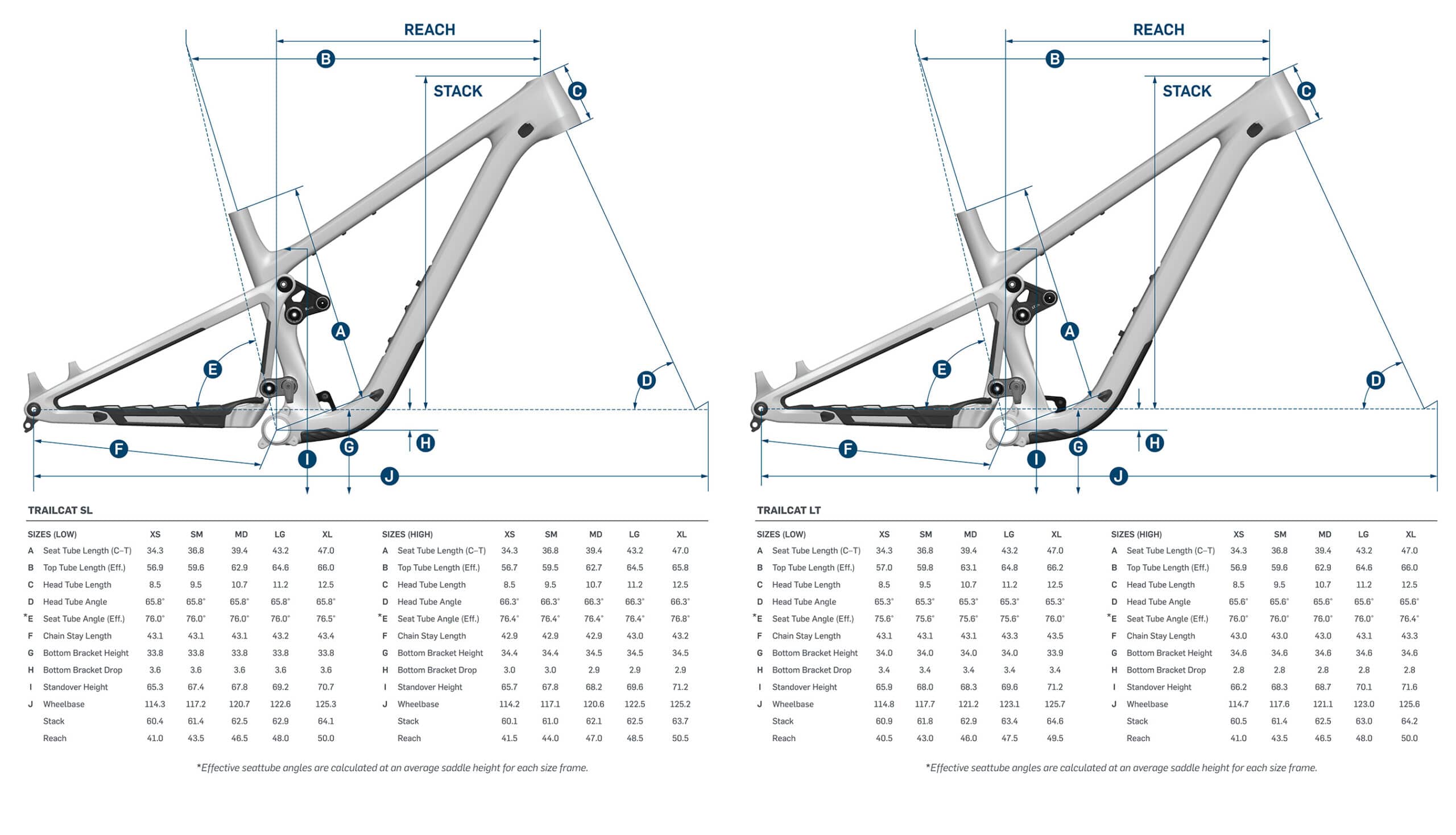 La géométrie de la version SL se caractérise, en taille M, par un reach de 465 mm, des bases de 431 mm, un angle de direction de 65,8° et un angle de tube de selle de 76°. Pour la version LT, en taille M aussi, le reach passe à 460 mm, les bases demeurent logiquement à 431 mm, l’angle de direction est de 65,3° et l’angle de tube de selle de 75,6°. L’ensemble de ces cotes s’entendent en position basse du flip-chip.