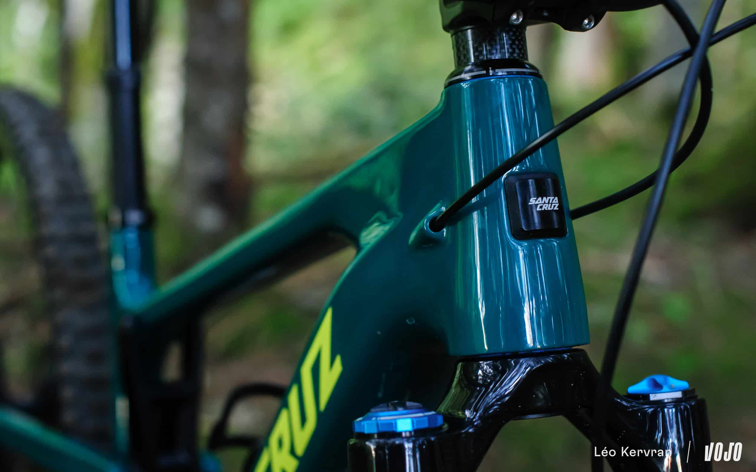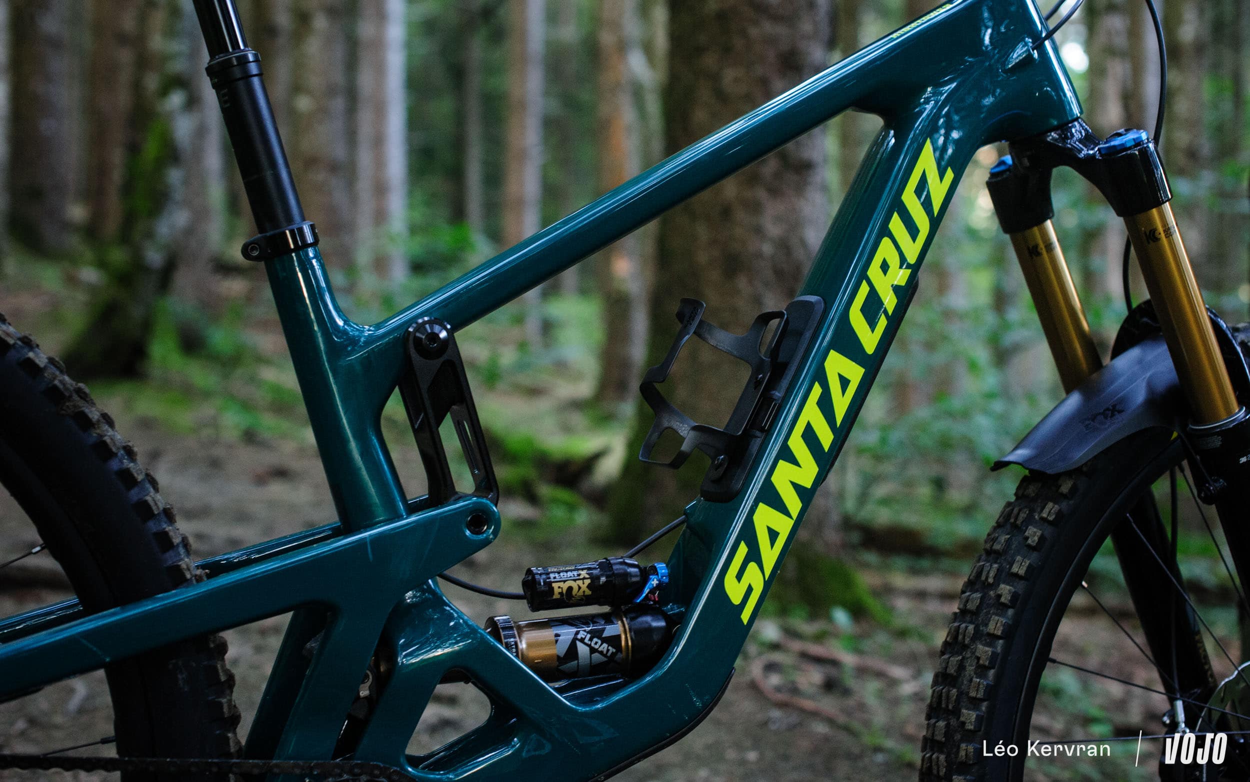 Avec le nouveau dessin de la suspension et du tube diagonal, la boîte à gants ne descend plus jusqu’au boîtier de pédalier. Comme sur le Bronson, elle s’arrête désormais au niveau de l’amortisseur mais Santa Cruz indique que le volume ne change pas : elle est moins longue qu’avant, certes, mais compense en étant plus large. Pour accompagner cette évolution, les pochettes ont été modifiées de la même façon.