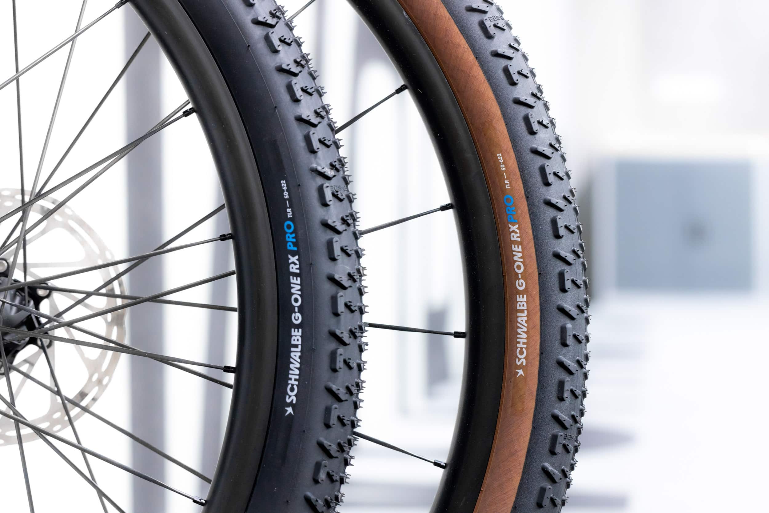Côté construction, Schwalbe a profité de la nouvelle organisation de la gamme pour revoir les gommes et carcasses de toute la famille G-One Pro. La carcasse Super Race devient Race Pro avec une meilleure protection contre les crevaisons (bande de tissu V-Guard de 25 mm de large sous la bande de roulement contre 20 mm auparavant et pli de carcasse qui remonte plus haut sur les flancs) tout en « améliorant les caractéristiques de roulement », indique la marque, tandis que la gomme Addix Race a été revue et doit notamment être plus rapide sur la bande de roulement, tout en gardant un composé plus tendre sur les côtés pour l’adhérence.