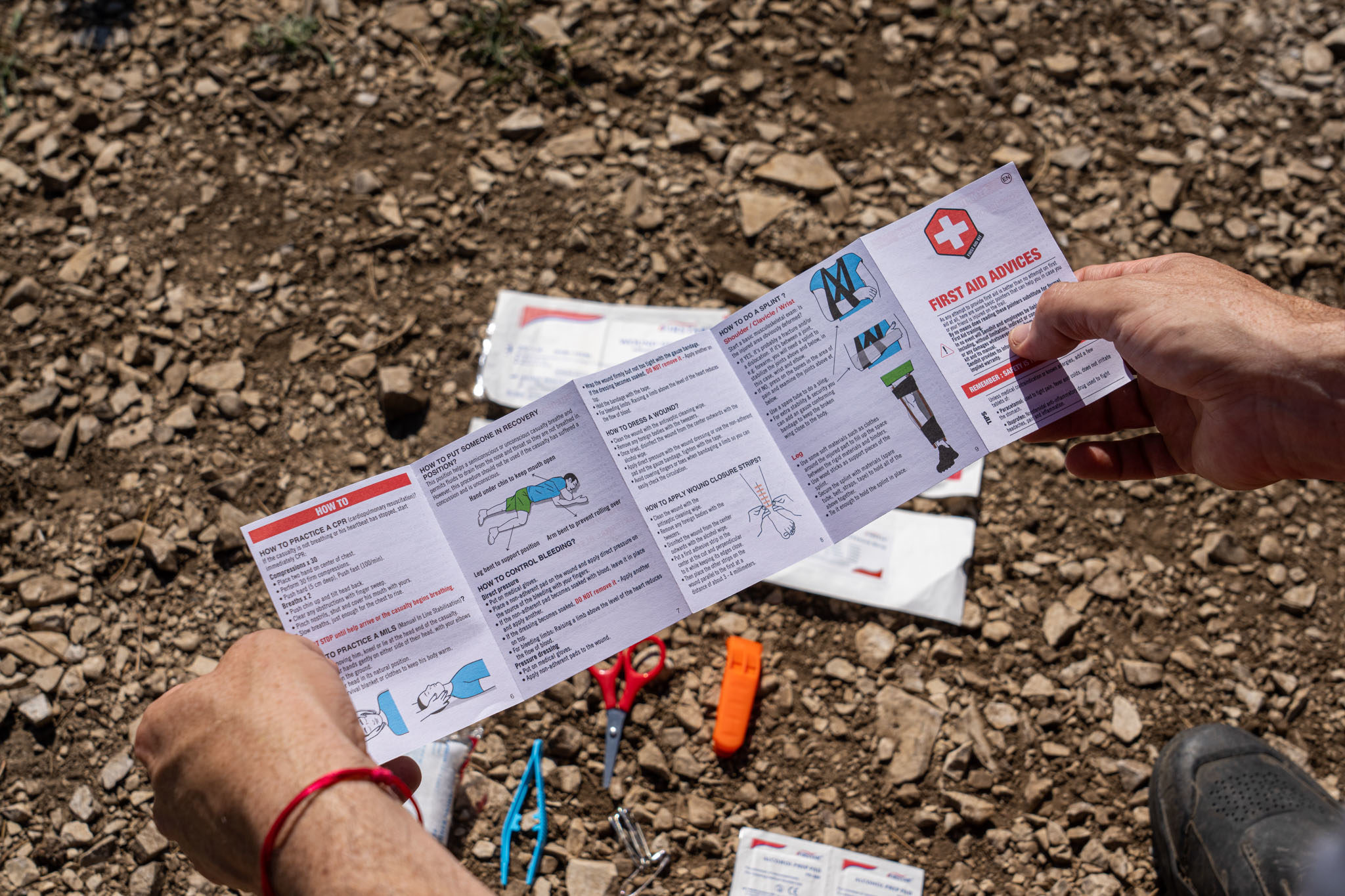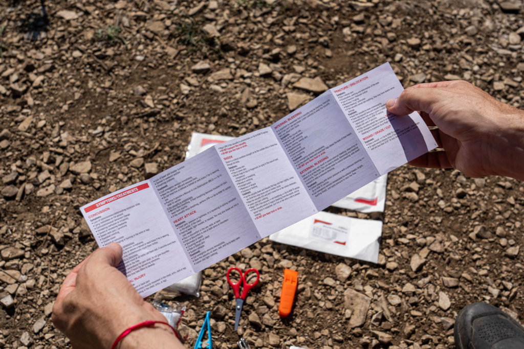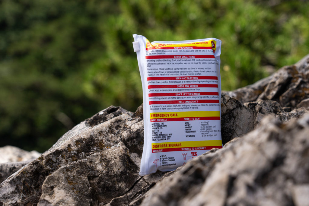 Les rappels les plus simples et importants sont imprimes directement sur la trousse, tandis que des instructions un peu plus poussées sur les traumatismes les plus courants en VTT sont regroupées sur un petit papier glissé dans le kit (disponible en 5 langues : français, anglais, allemand, espagnol et italien), avec les autres éléments.