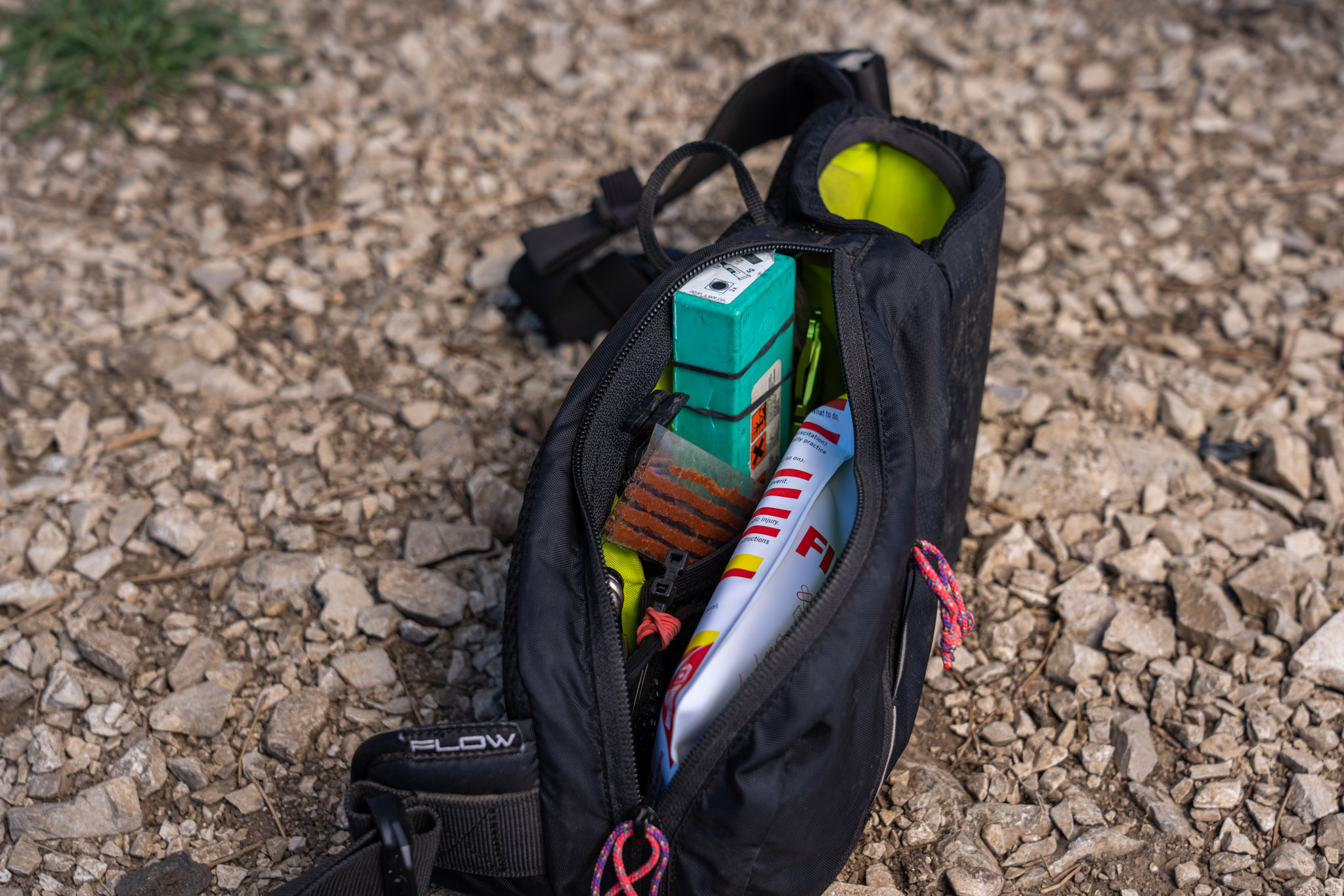 Son kit de premiers secours prend ainsi la forme d’une petite trousse étanche de 16 x 11 x 3 cm pour 100 g, un format qui reste conséquent (une chambre à air et demi environ) mais qui lui permet tout de même de rentrer dans la plupart des bananes ou petits sacs. Le stockage sur le vélo, particulièrement dans l’air du temps, a également été envisagé mais n’a finalement pas été retenu car jugé inadapté à ce genre d’accessoire.