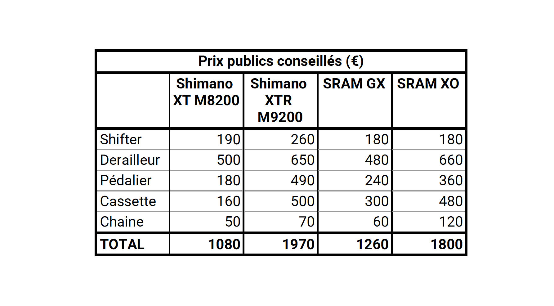 Si, sur le plan technique et au niveau du poids, le XT est assez proche du XTR, une grosse différence se marque au niveau du prix ! Une transmission XT est annoncée à 1080 € par Shimano contre… 1970 € pour le XTR, soit près du simple au double ! Le XT apparaît donc plus que jamais comme le choix malin pour qui n’est pas compétiteur ou inconditionnel du matériel haut de gamme pour sa passion. Par rapport à Sram, il se positionne aussi en dessous du GX Eagle AXS, notamment grâce à sa cassette et à son pédalier qui sont assez bon marché.