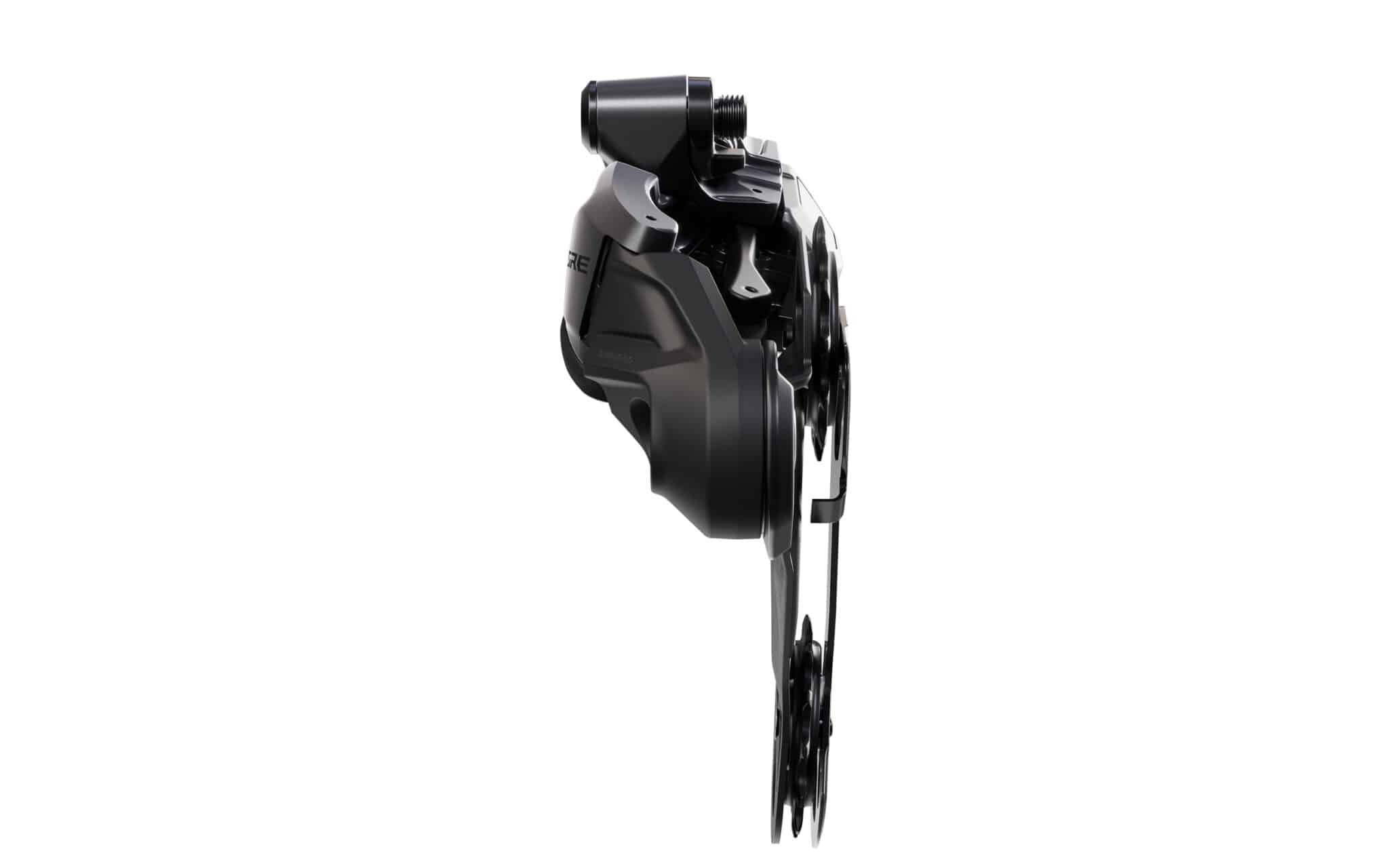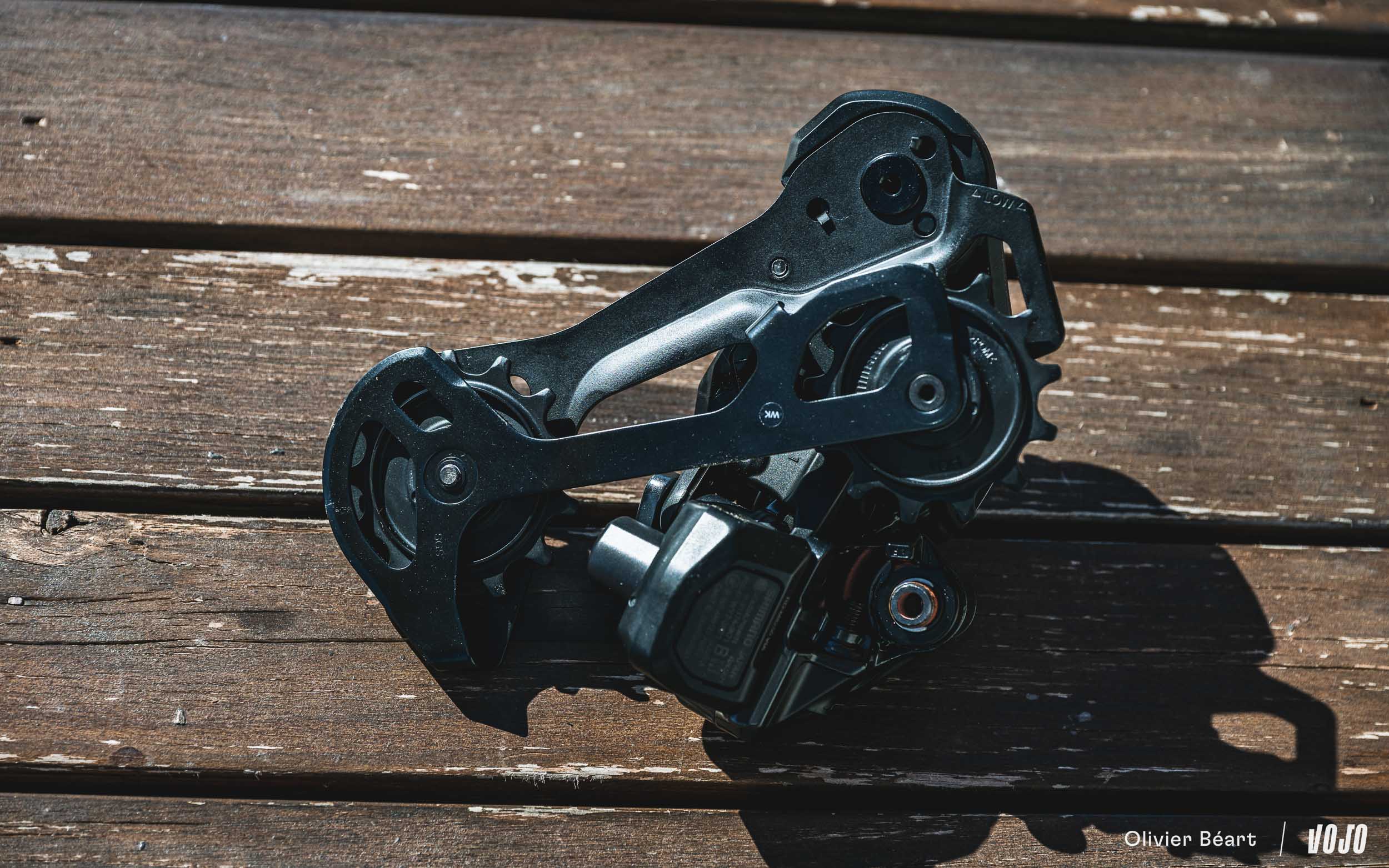 Le design du dérailleur avec le Shadow ES, la batterie amovible logée au centre, le nouveau double ressort pour une meilleure rétention de la chaîne sont tous au programme, mais la construction laisse place à plus d’acier, notamment pour la chape. Il n’existe que pour cassette 10-51, sans version à chape plus courte. Il y a par contre une version e-bike, compatible 12 vitesses ou 11 vitesses Linkglide. Il coûte 380 €, soit 120 € de moins que le XT.