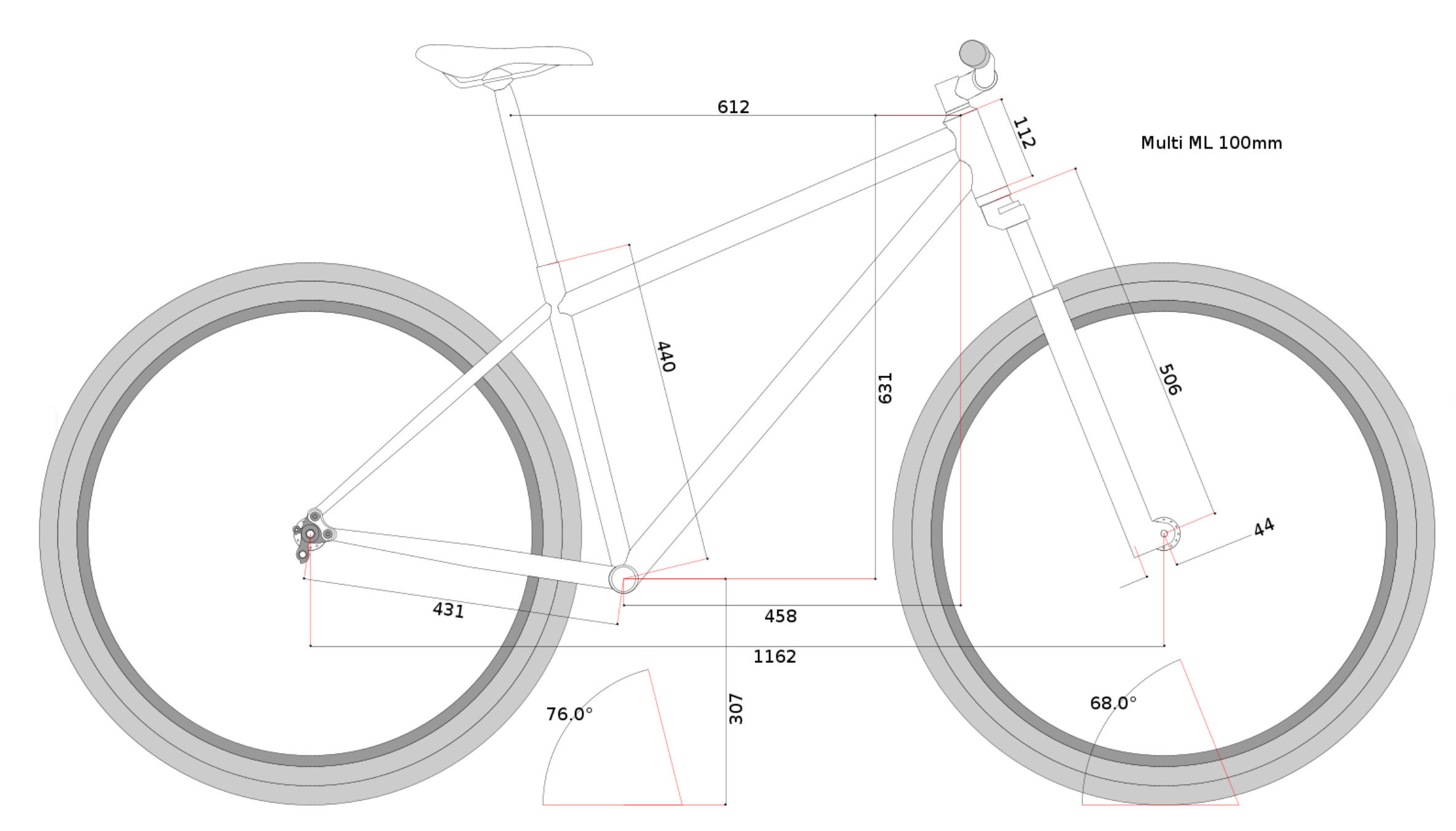 Côté géométrie, l’angle de direction affiche 68° et celui du tube de selle 76°, tandis que les bases s’arrêtent à 431 mm et le reach à 458 mm en taille ML.