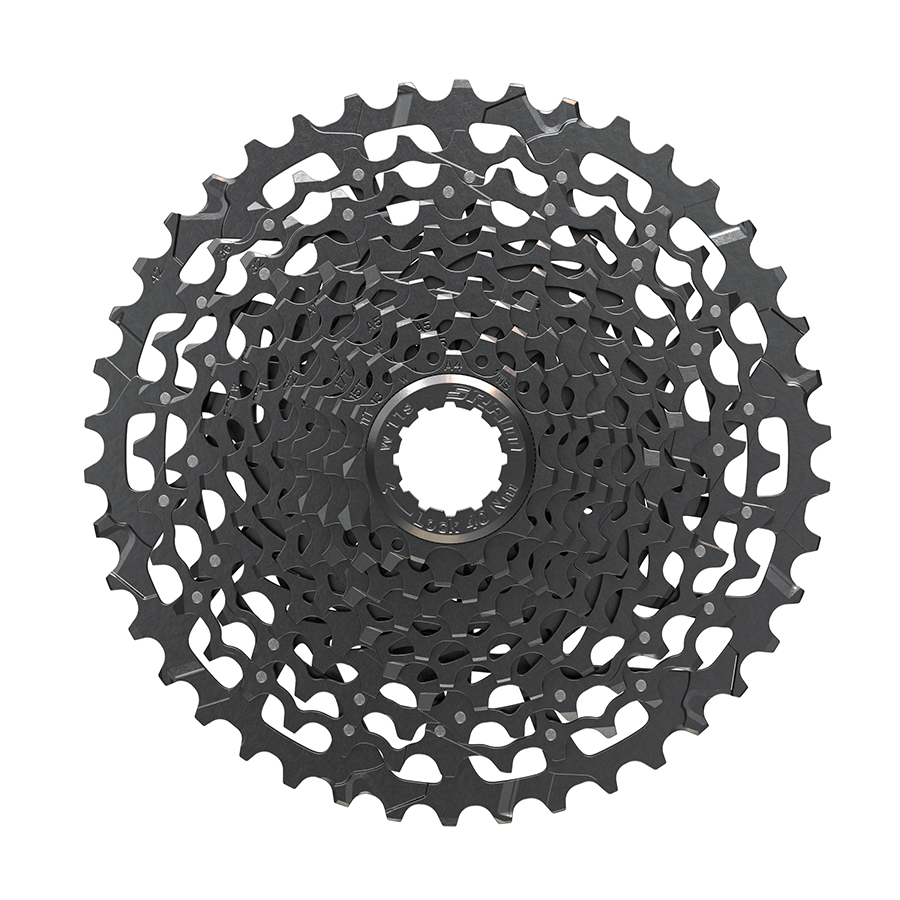 La cassette du groupe Sram NX, baptisée PG-1130, est une petite révolution dans le monde du 1×11 Sram : elle est compatible avec un corps de roue-libre type Shimano ! Plus besoin d’un corps XD spécfique avec le Sram NX… mais par contre, on perd le petit pignon de 10 dents dans l’affaire, puisqu’il s’agit d’une cassette 11/42, comme chez le rival nippon. Le poids apparaît aussi comme nettement plus élevé, avec 538g annoncés, soit un bon 200g de plus que la cassette GX !