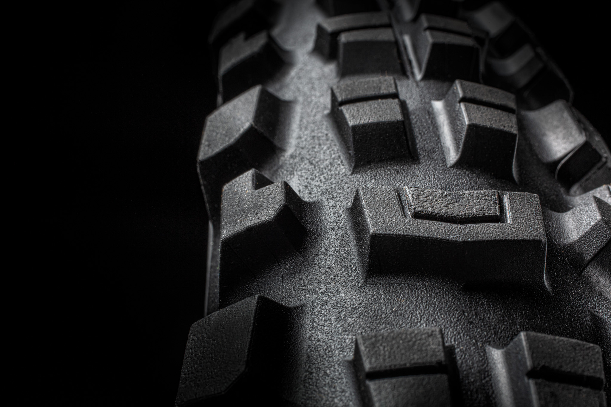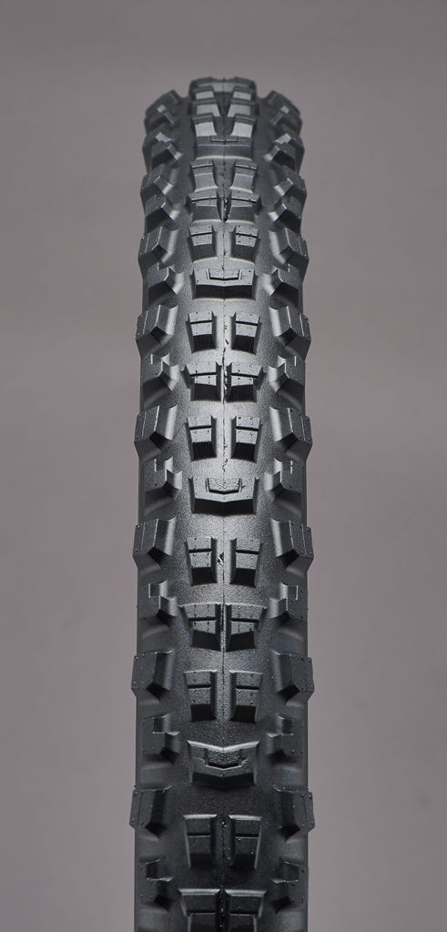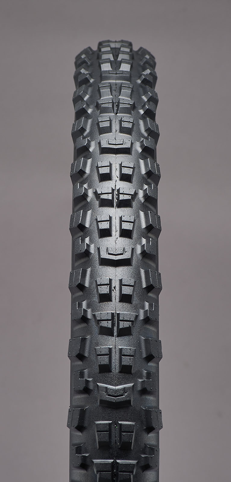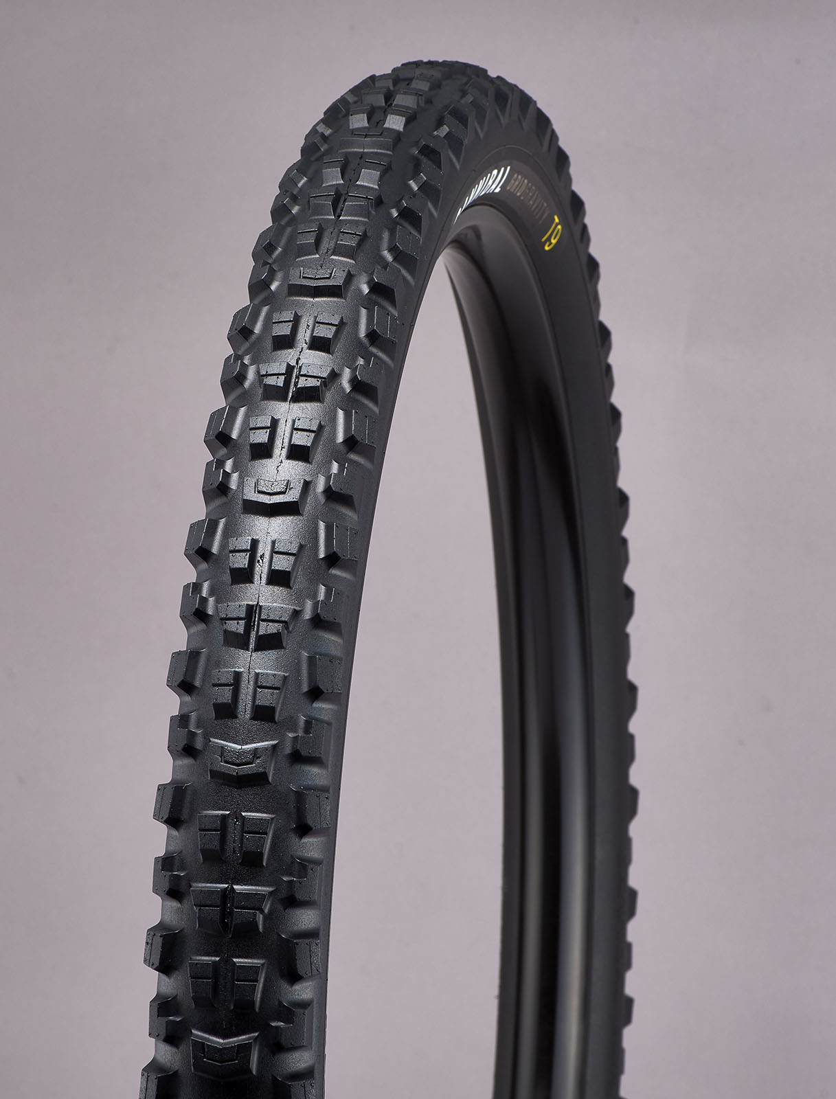 Développé avec les pilotes du Specialized Gravity, il adopte de gros pavés centraux fendus pour un bon contact avec le sol et des pavés latéraux en quinconce censés assurer une excellente stabilité en virage, même à haute vitesse. Contre toute attente, ces derniers ne sont pas fendus mais Specialized a dû juger que ce n’était pas nécessaire pour éviter l’effet « luge » avec ce placement et la gomme utilisée.