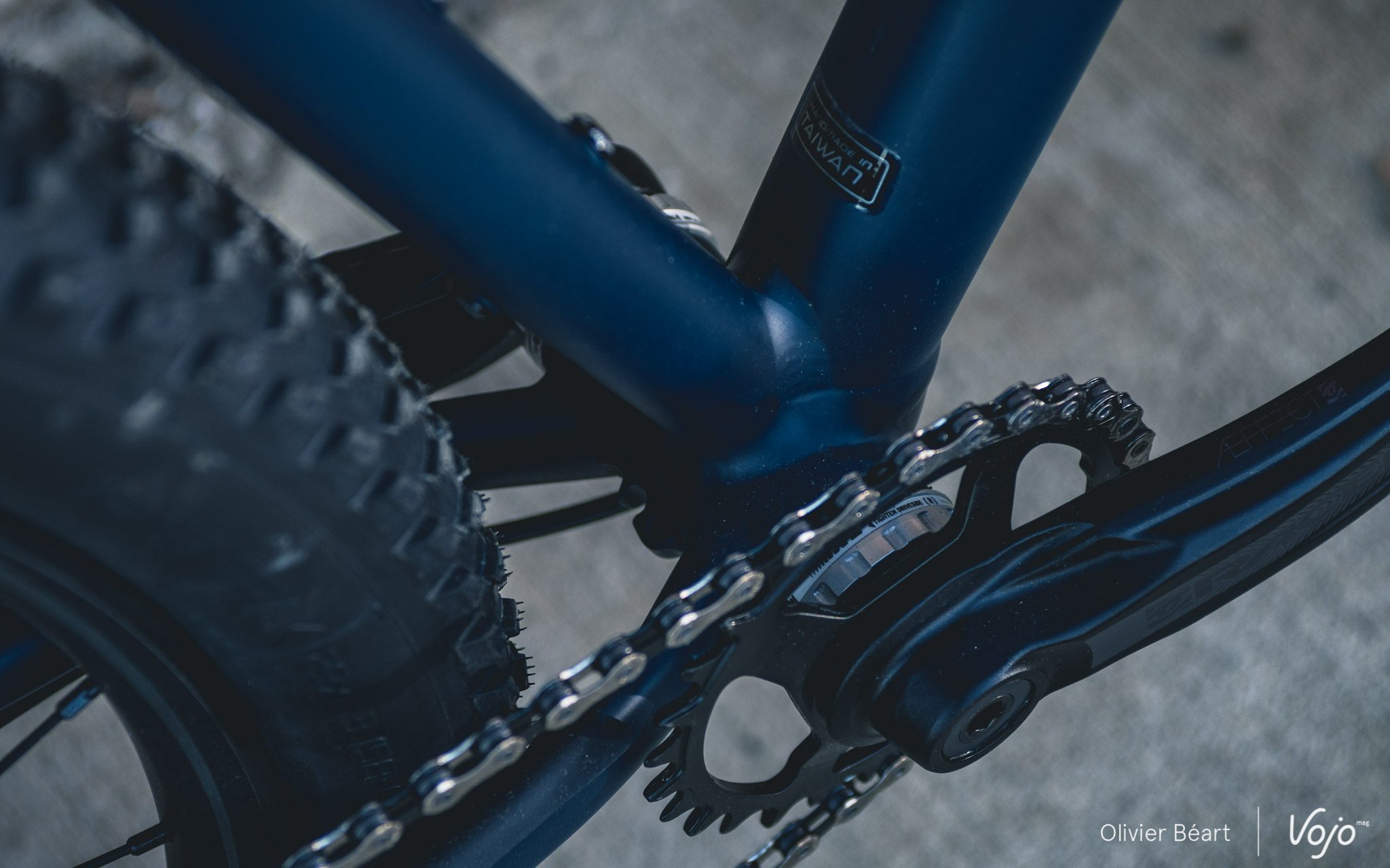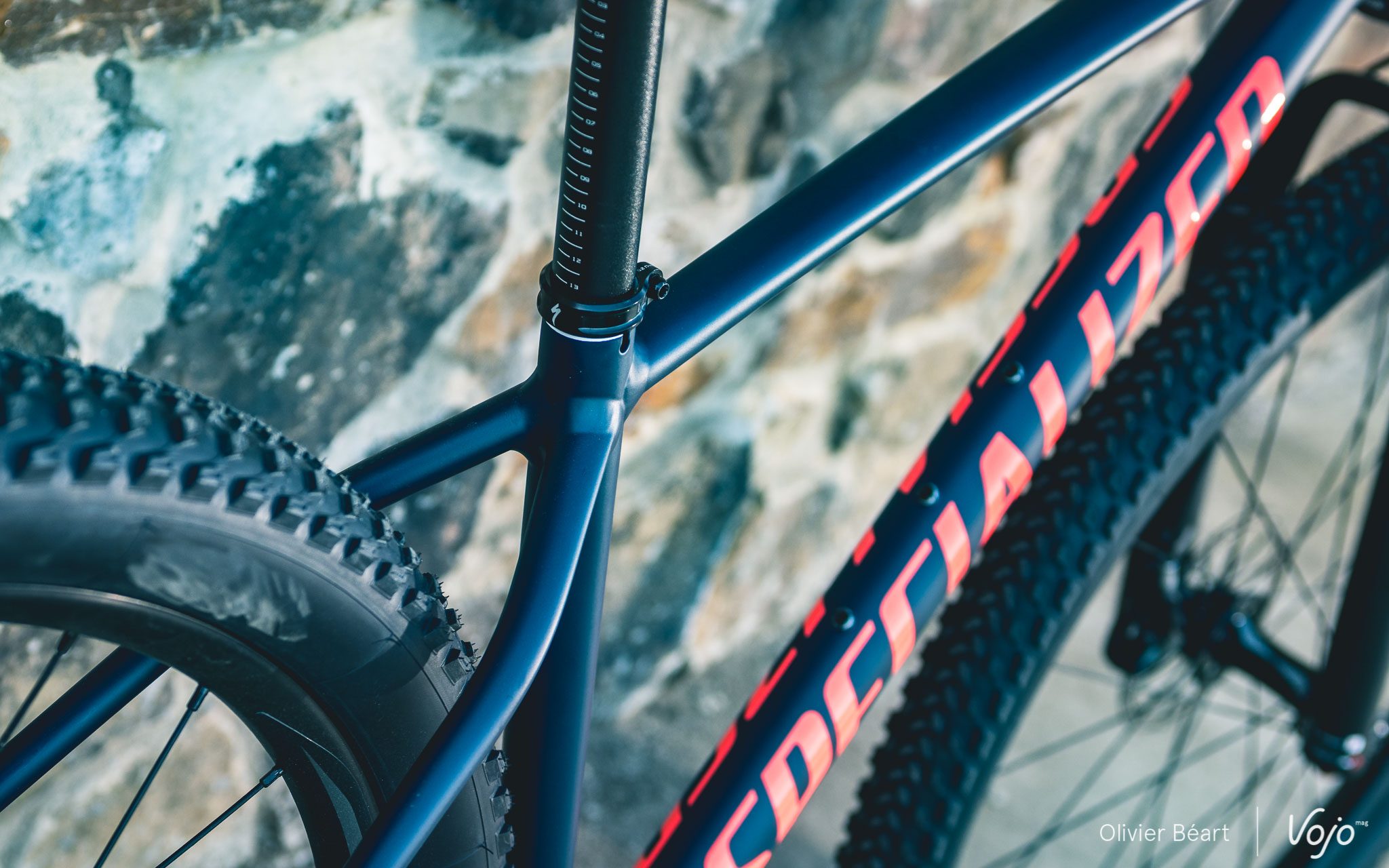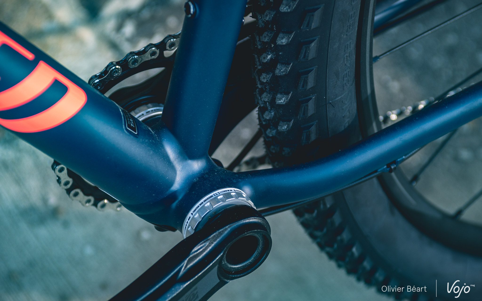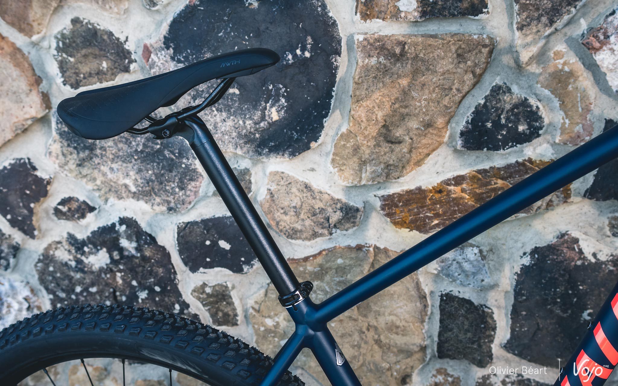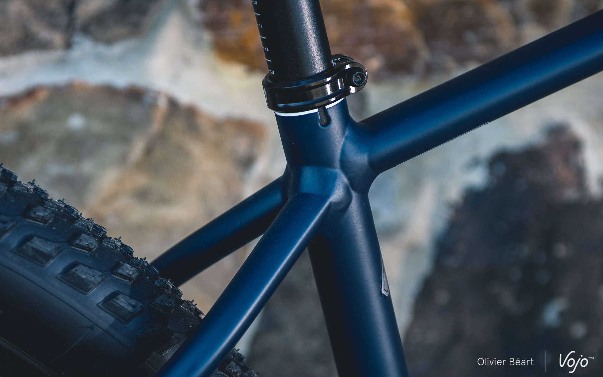 Mis à part le tube diagonal plus imposant, toutes les autres parties du cadre sont d’un diamètre exceptionnellement faible. C’est notamment le cas du tube supérieur, dont la section nous a semblé très inhabituelle. Et le résultat, très séduisant à l’oeil, sera intéressant à confronter à la réalité du terrain pour voir s’il réussit à apporter du confort.