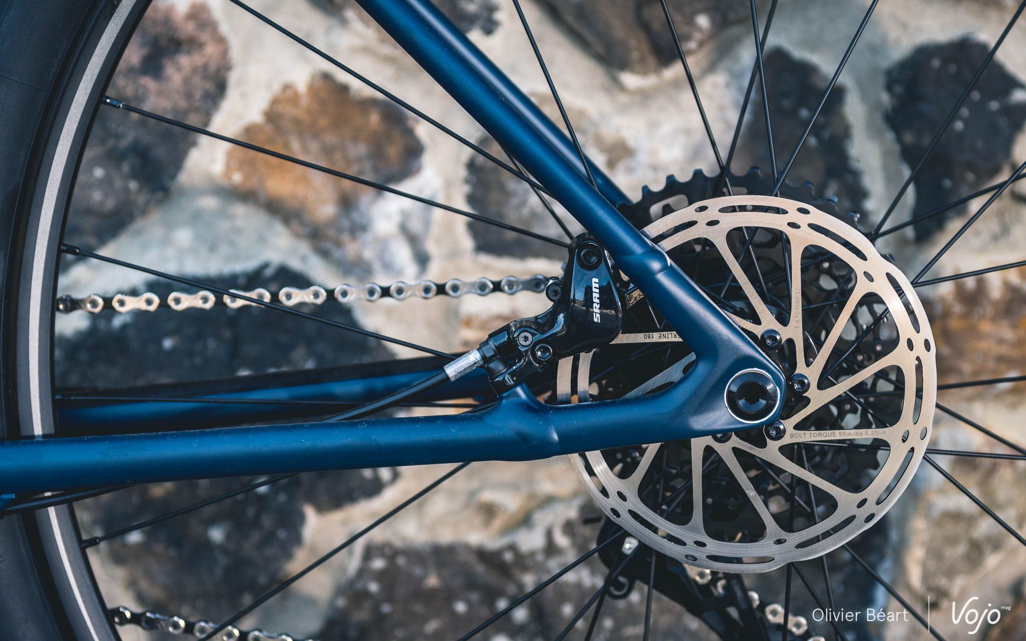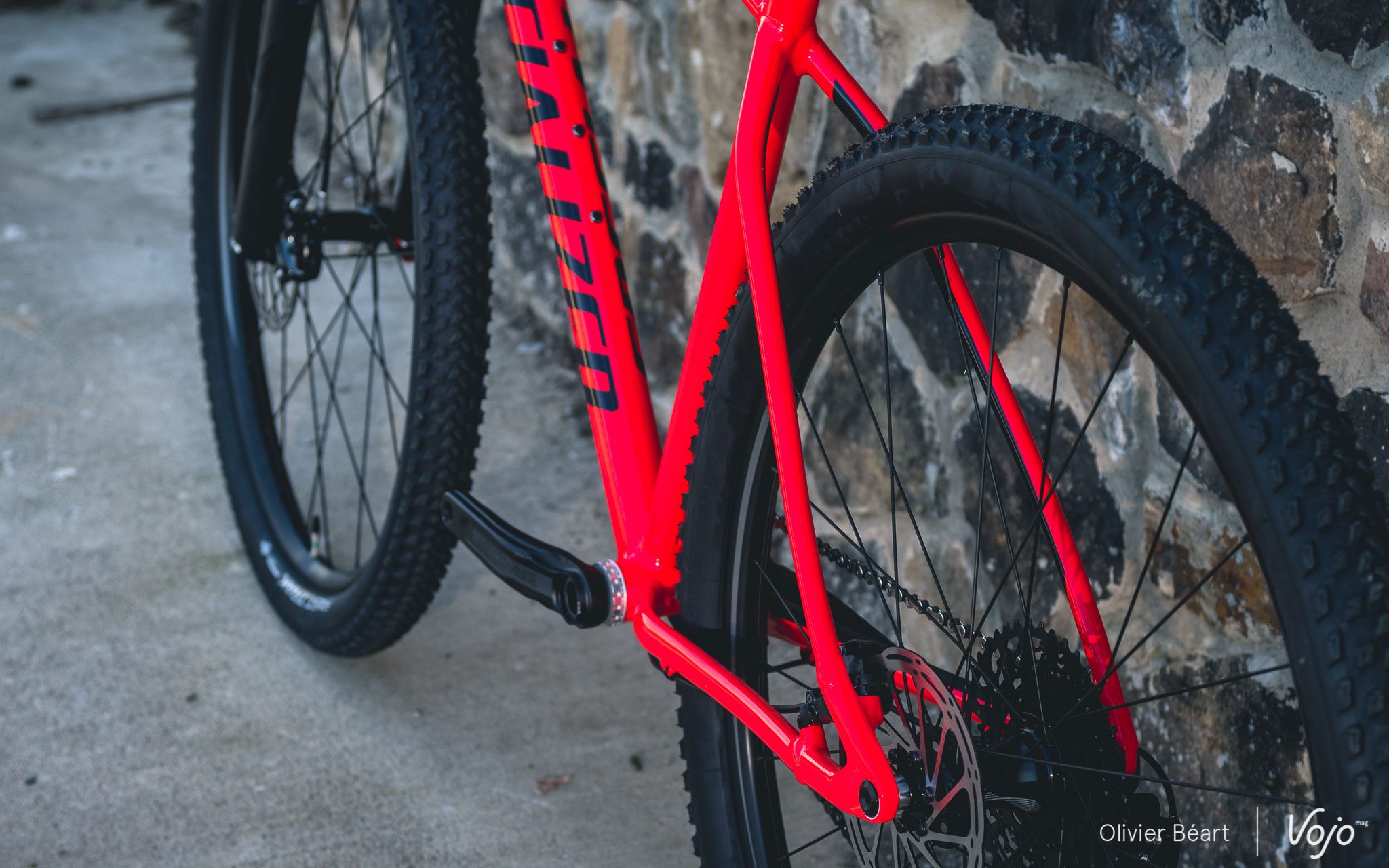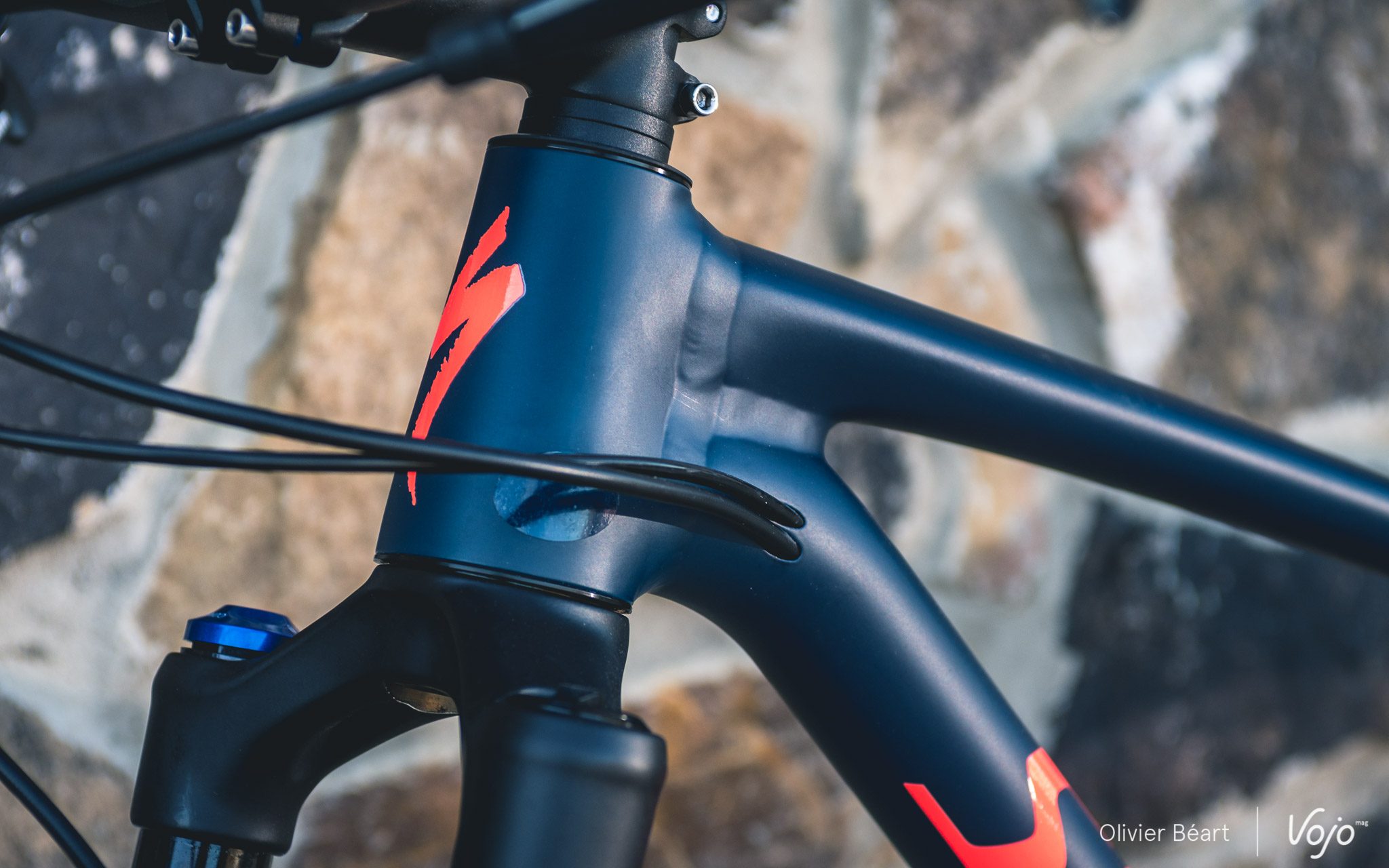 Le passage des gaines se fait en interne et la patte de disque PM est placée entre les bases et les haubans. L’axe arrière est en Boost 148 (mais le cadre n’est pas compatible 27,5+. Même si les haubans sont très larges, les bases sont trop étroites. Pour le Plus, Specialized a les Fuse et Ruze dans sa gamme).