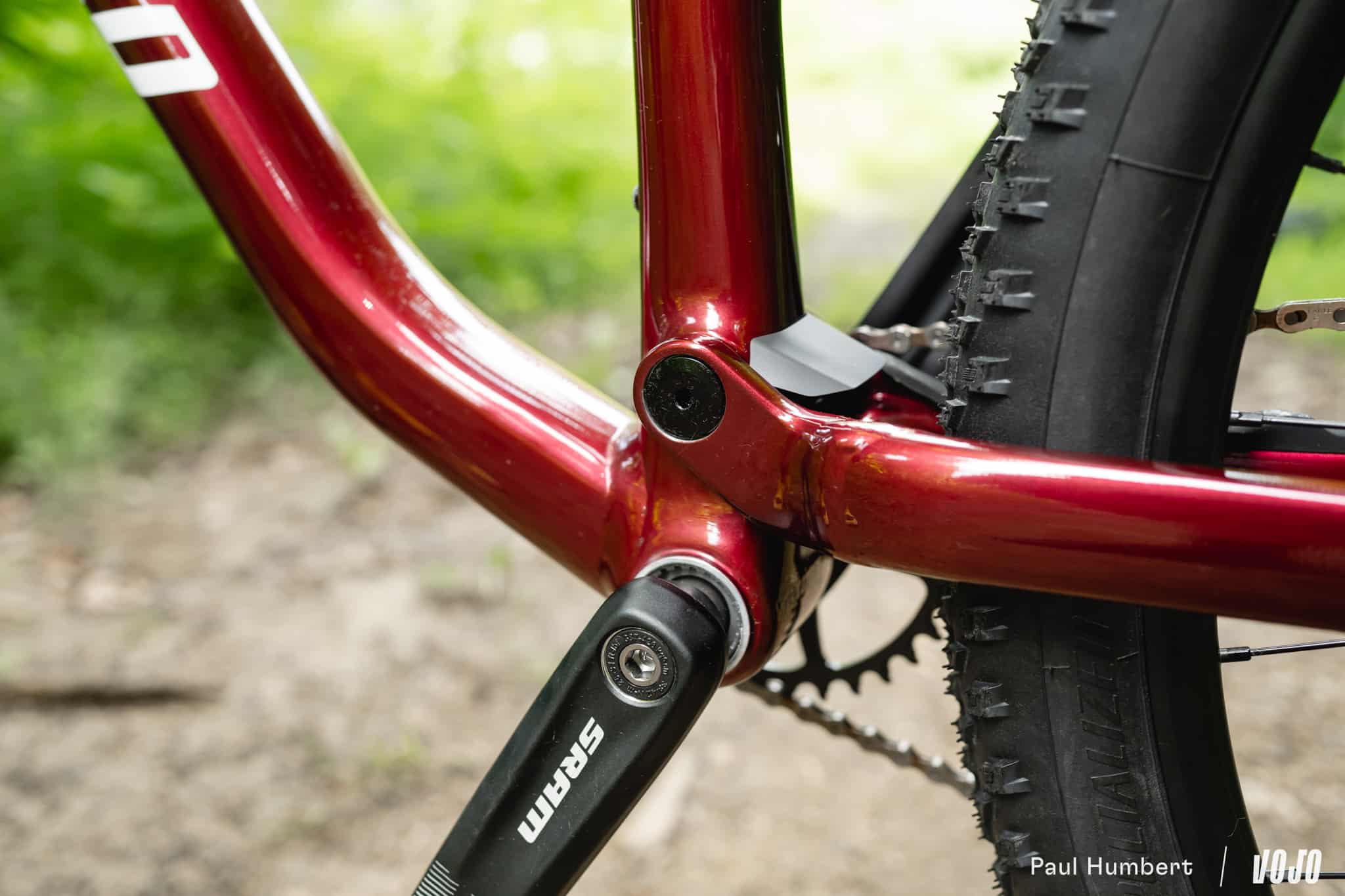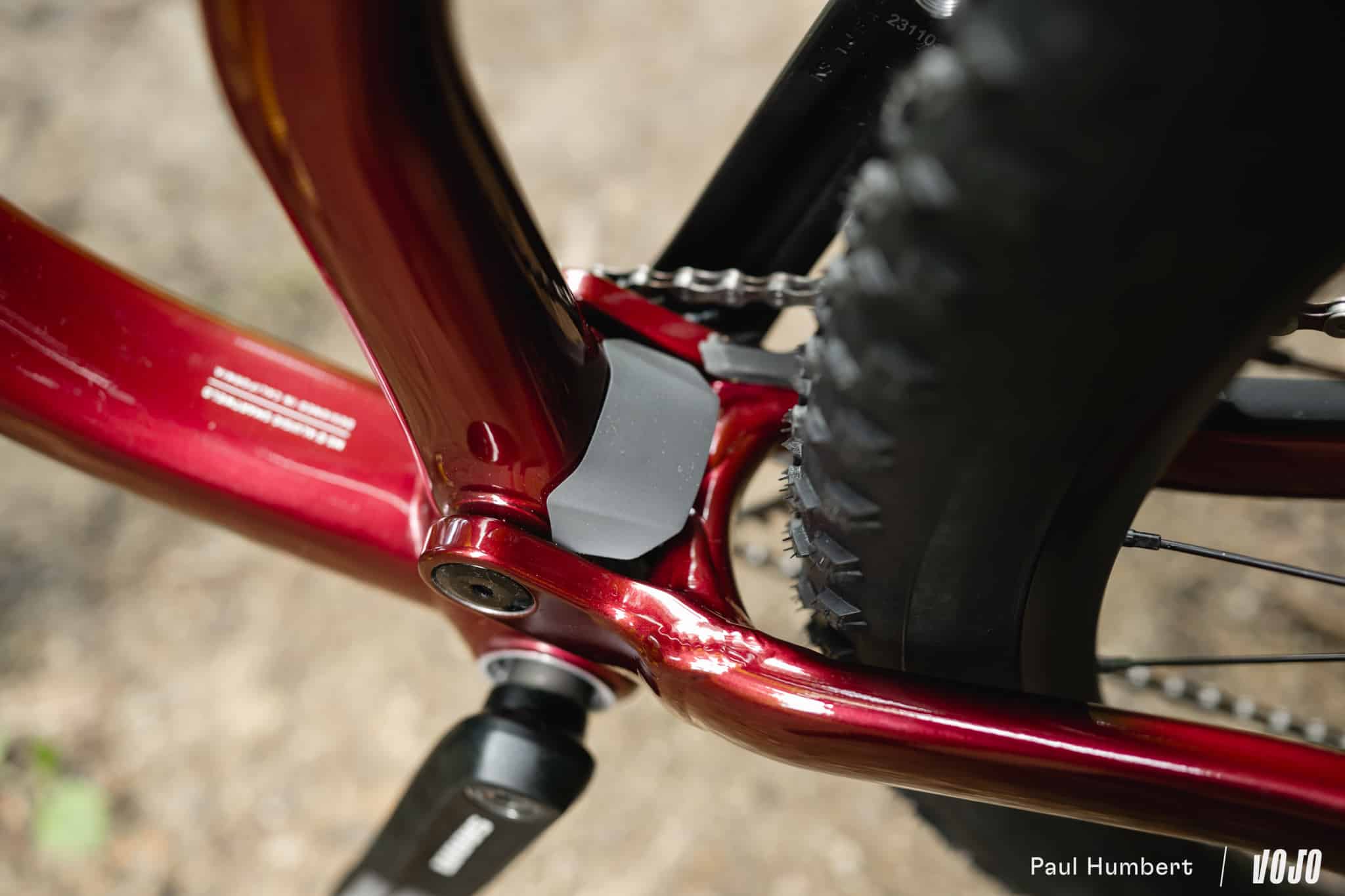 Le géométrie donne ainsi 66,5° à l’angle de direction, 75,5° pour l’angle de tube de selle, des bases de 437 mm et un reach de 445 mm en taille M, court si on le compare avec des vélos à plus grand débattement mais cohérent avec les aspirations sportives et XC de la machine. Comme sur l’Epic, on a également un petit flipchip à la fixation de l’amortisseur sur le yoke qui permet de descendre le boîtier de pédalier de 6 mm et de coucher les angles d’environ 0,5°.