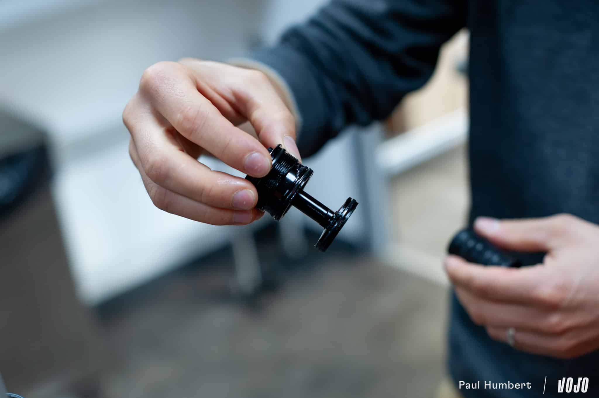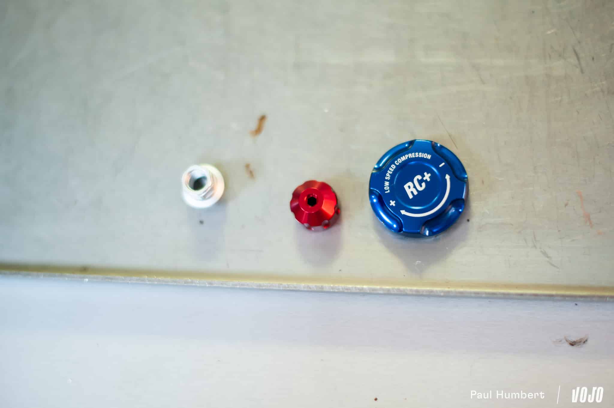 Côté air, les changements sont discrets : SR Suntour a conservé les grandes lignes de son ressort, qu’elle appelle Equalizer, et a simplement modifié le piston, qui est plus simple qu’auparavant. Les tokens, ces petites cales qui permettent de modifier le volume de la chambre et d’agir ainsi sur la progressivité en fin de course, restent les mêmes.