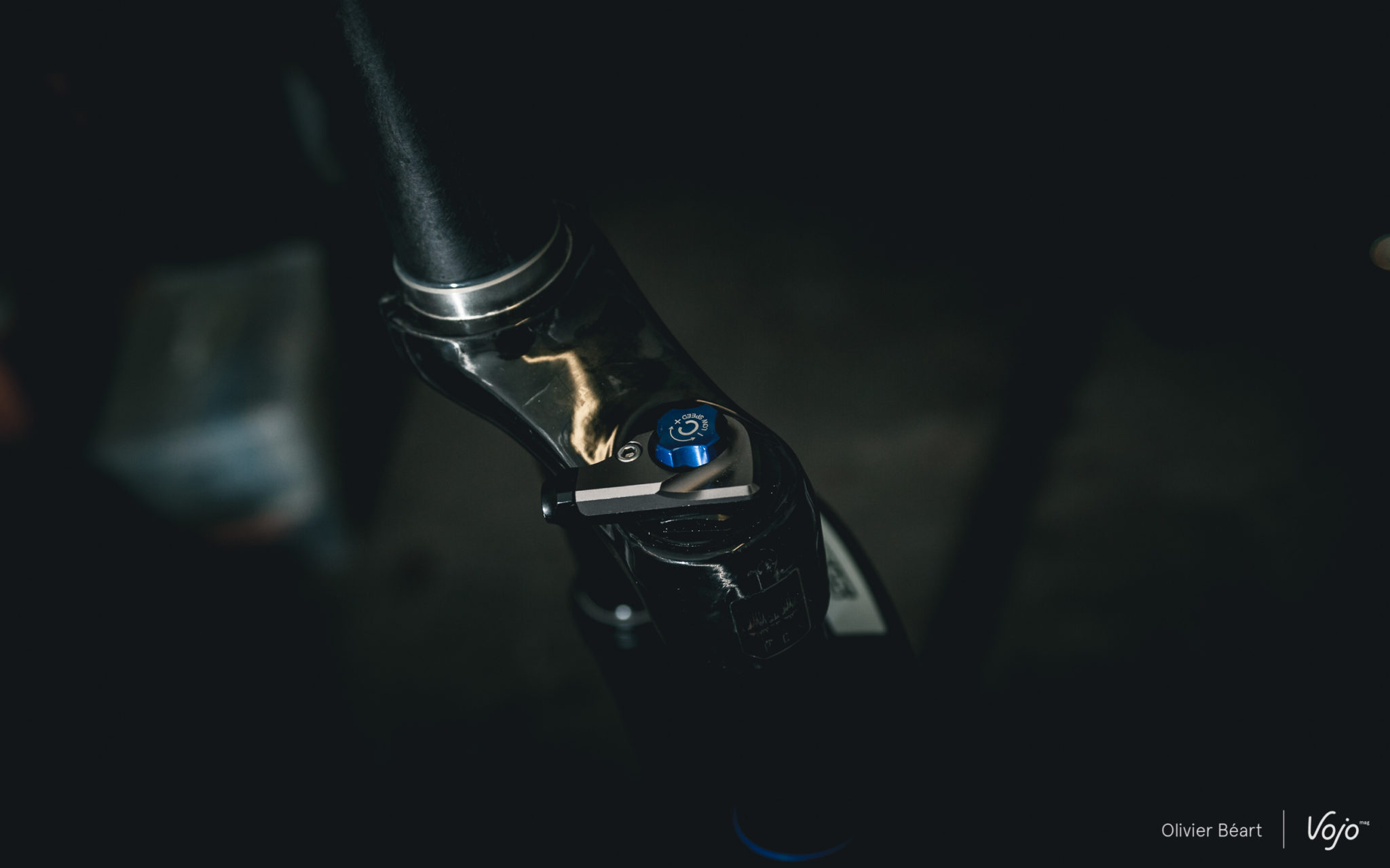 Les fourreaux en magnésium ont été entièrement redessinés pour gagner en poids et, d’après la marque, on se situe dans les mêmes eaux que l’ensemble en carbone qui équipe l’Axon 32 Werx qui était jusqu’ici le modèle le plus haut de gamme de la marque. On retrouve toujours l’axe rapide Q-Loc2 qui est sans doute, une fois qu’on en a compris le fonctionnement, un des plus efficaces du marché. Le déport est pour l’instant uniquement en 51mm, mais du 44mm devrait arriver par la suite. Elle est bien évidemment au format boost 15x110mm.