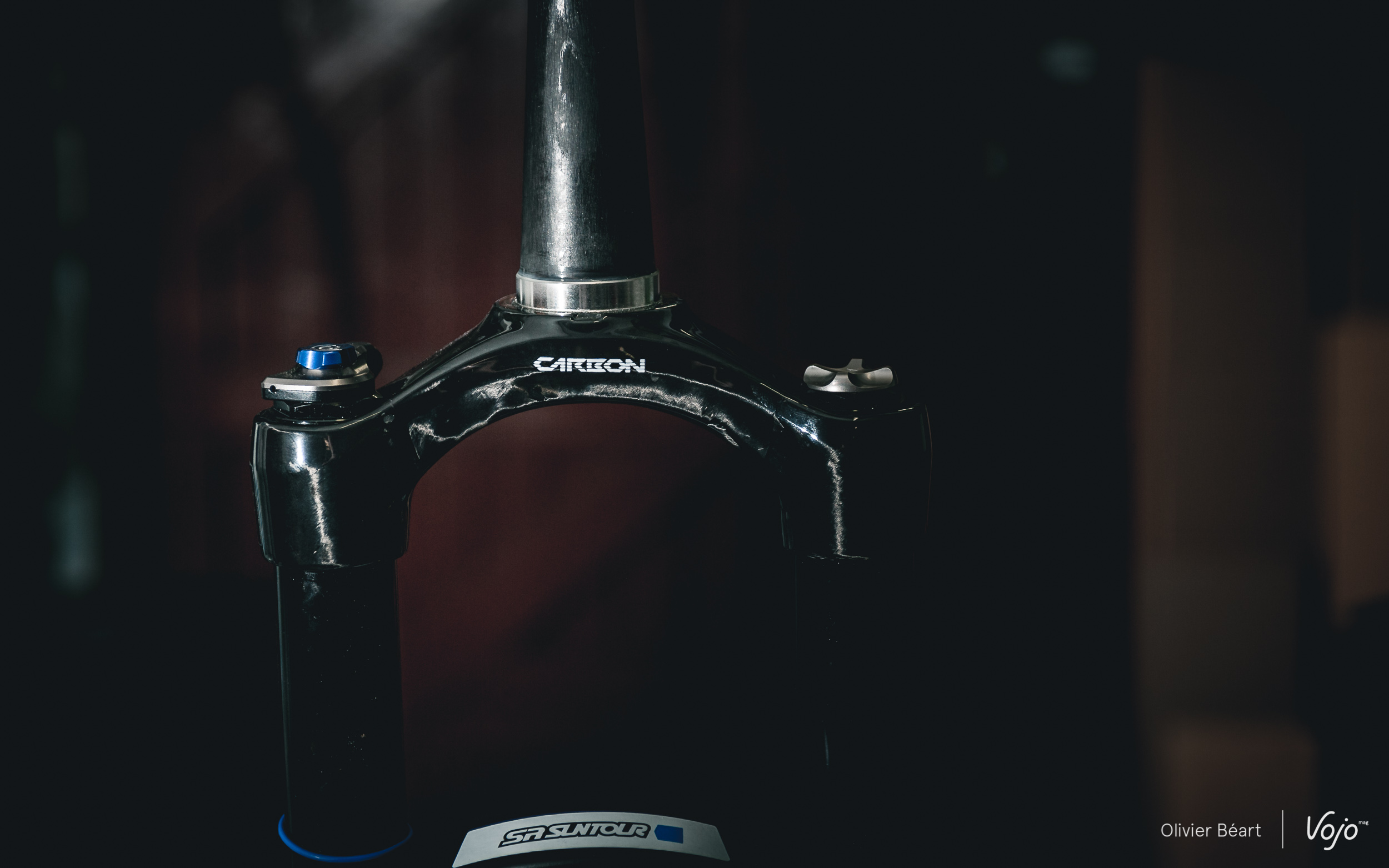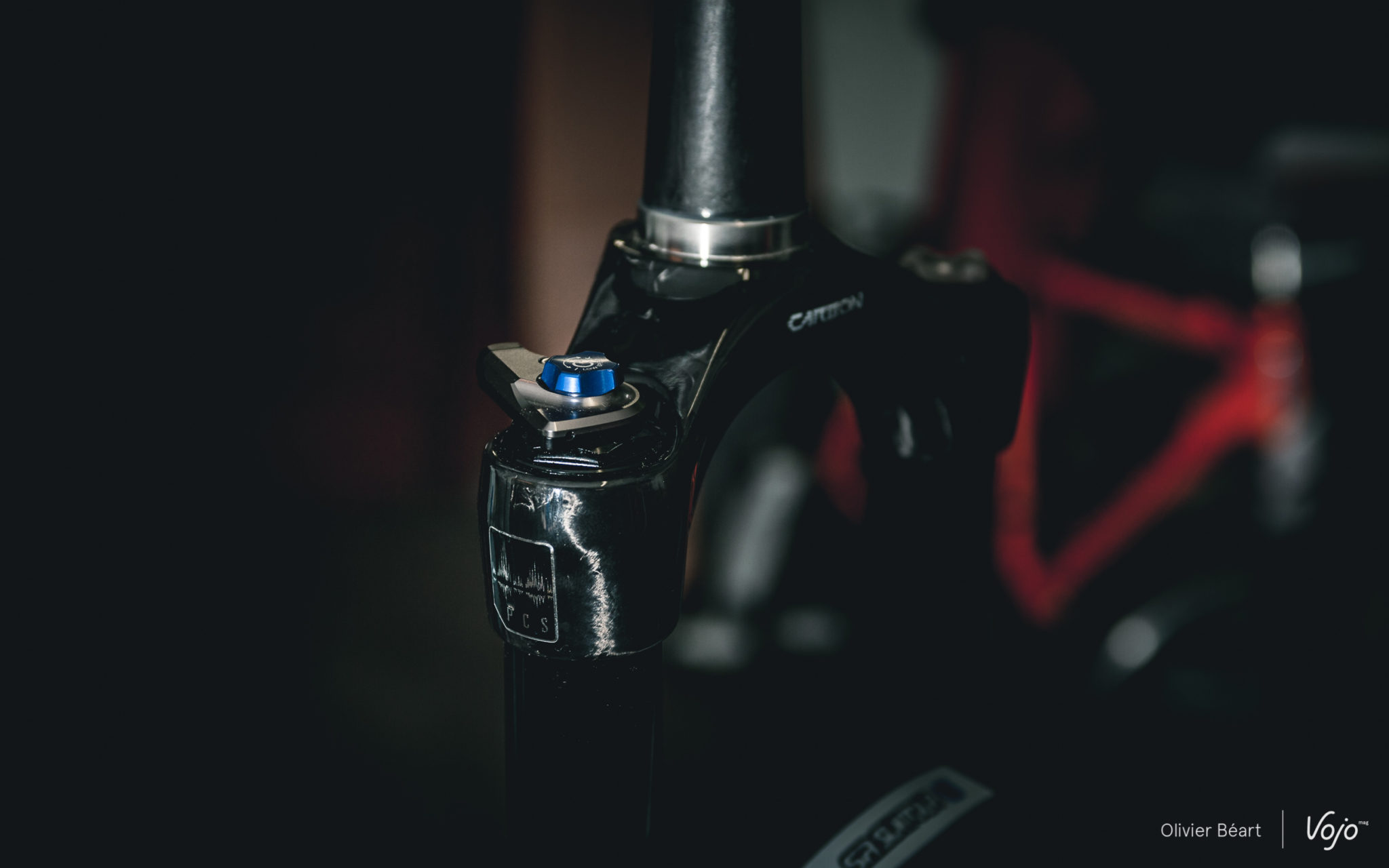 Si les fourreaux passent au magnésium, Suntour a conservé le carbone pour l’ensemble té-pivot. La finition est excellente et en plus du gain de poids, cela valorise clairement le produit.
