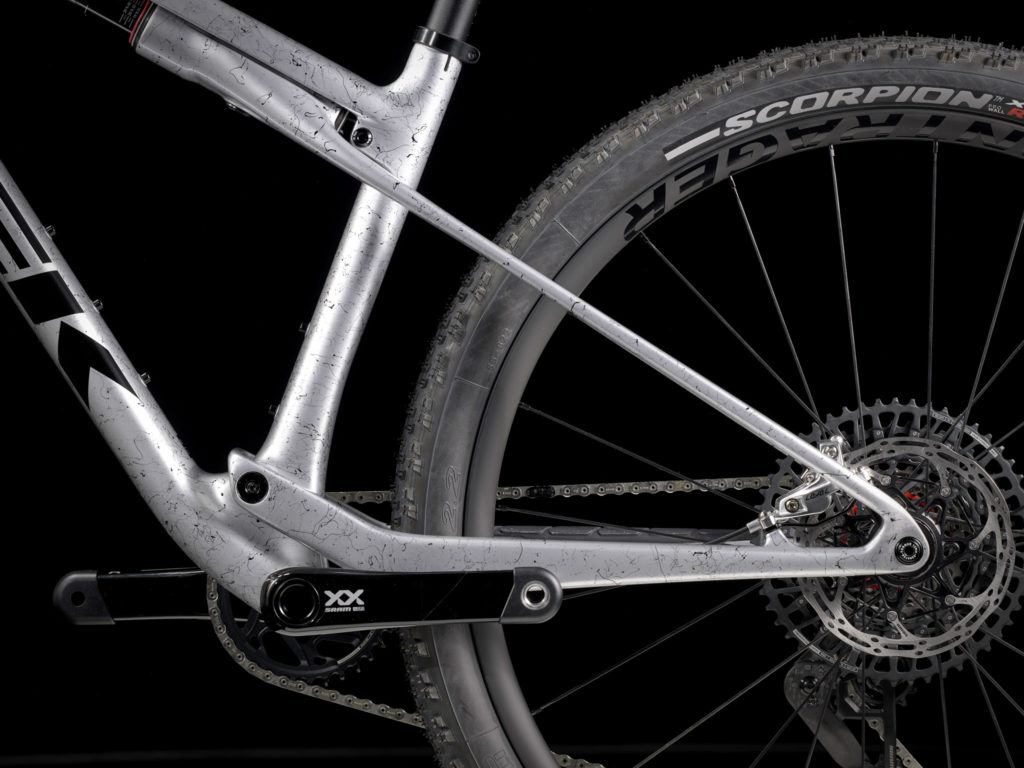 Côté géométrie il y a aussi du changement, même si Trek ne pousse pas les chose aussi loin que certaines marques. Le nouveau SuperCaliber affiche ainsi 67,5° d’angle de direction (- 1,5°), 74,5° d’angle de tube de selle (+ 0,5°) des bases de 435 mm (+ 5 mm), un reach de 465 mm en taille L (+ 10 mm) ou encore un boîtier de pédalier à – 46 mm (+ 7 mm). Par ailleurs, le dégagement pour les pneus est poussé à 2,4″, contre 2,2″ sur l’ancien modèle.