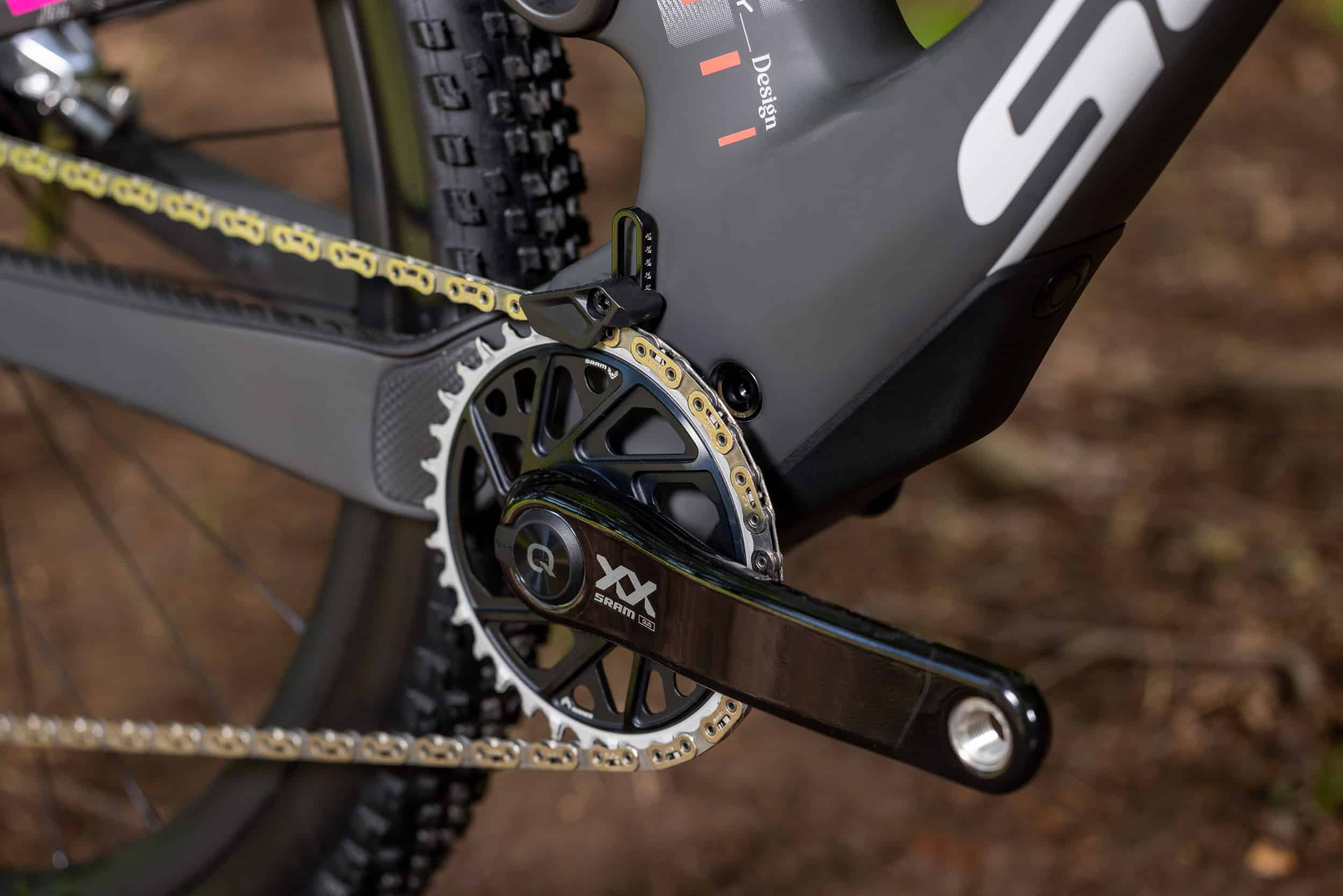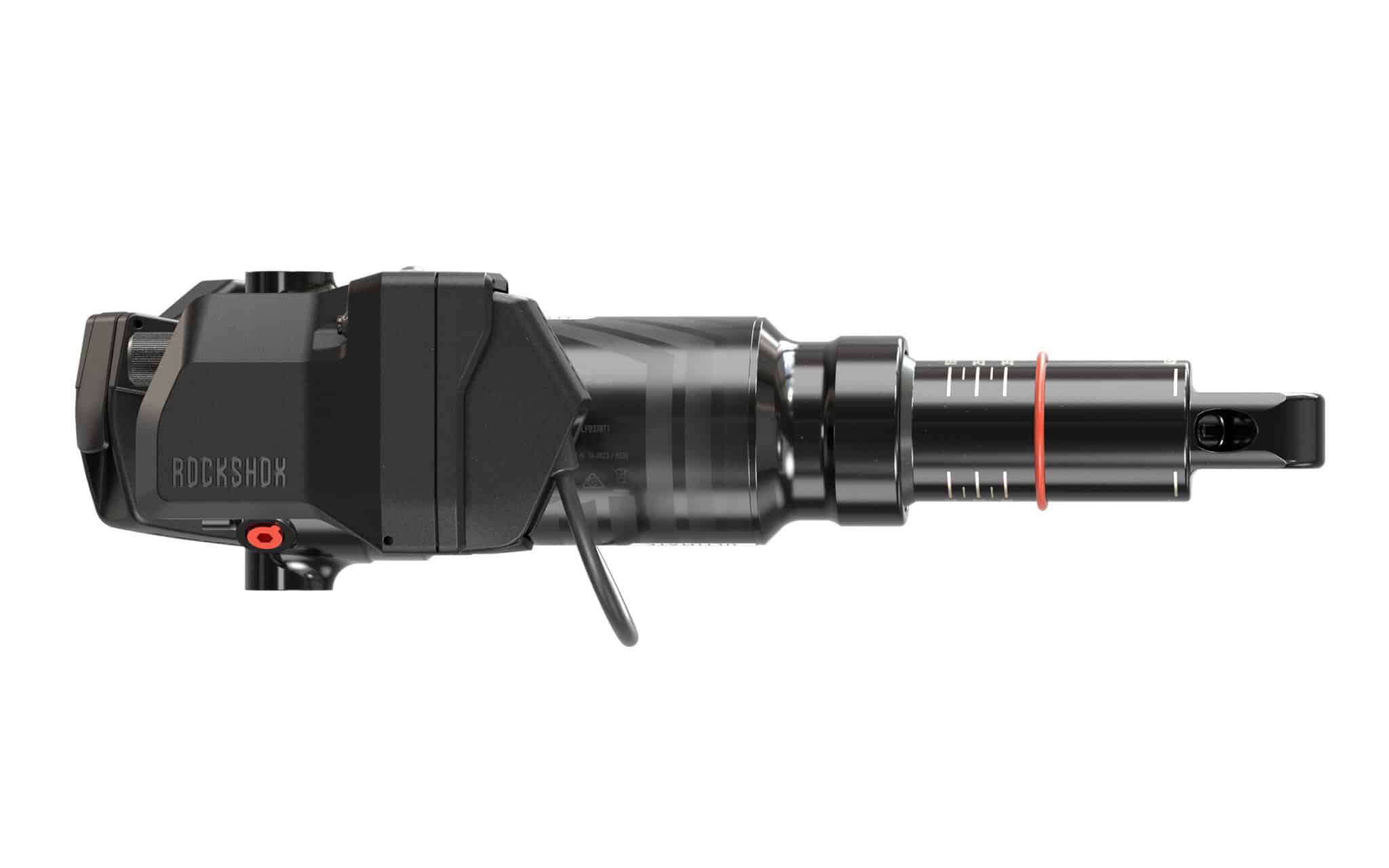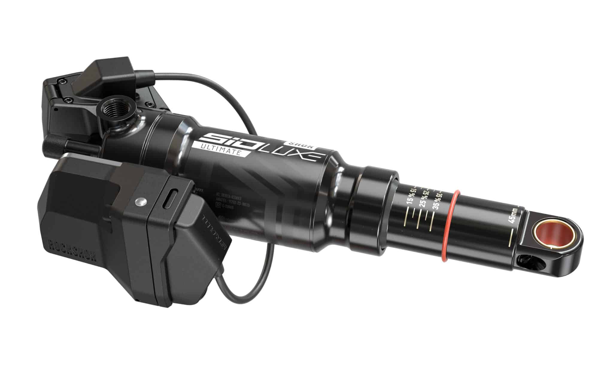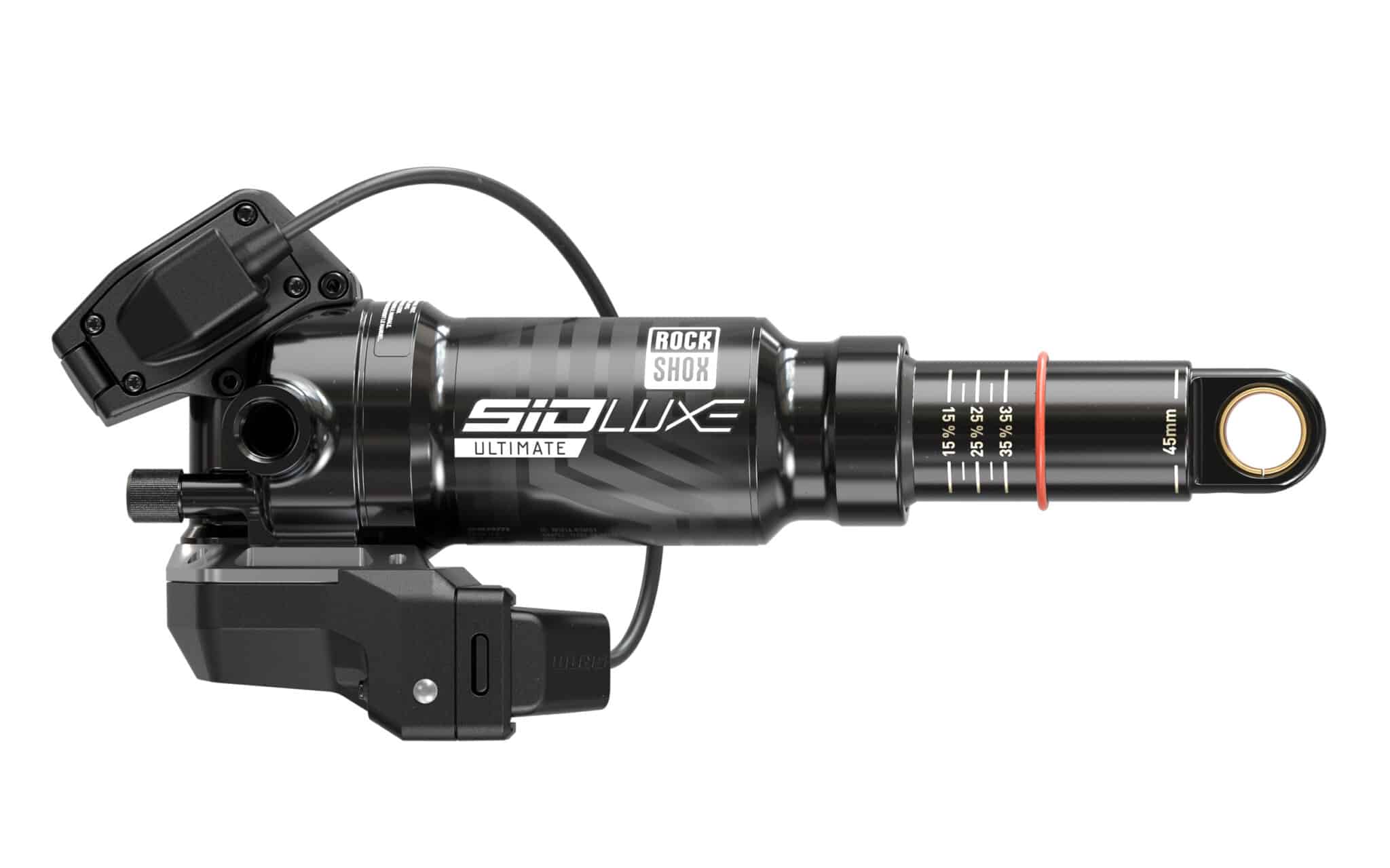 Du côté de RockShox, on propose un amortisseur SIDLuxe spécifique avec une fixation inférieure de type Trunion, une valve orientée vers le bas et un logement de batterie déporté afin d’être accessible sans démonter l’amortisseur (comme ce serait le cas avec le positionnement classique de la batterie AXS).