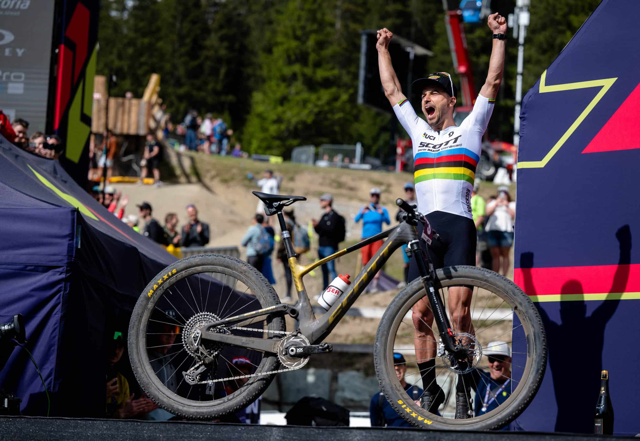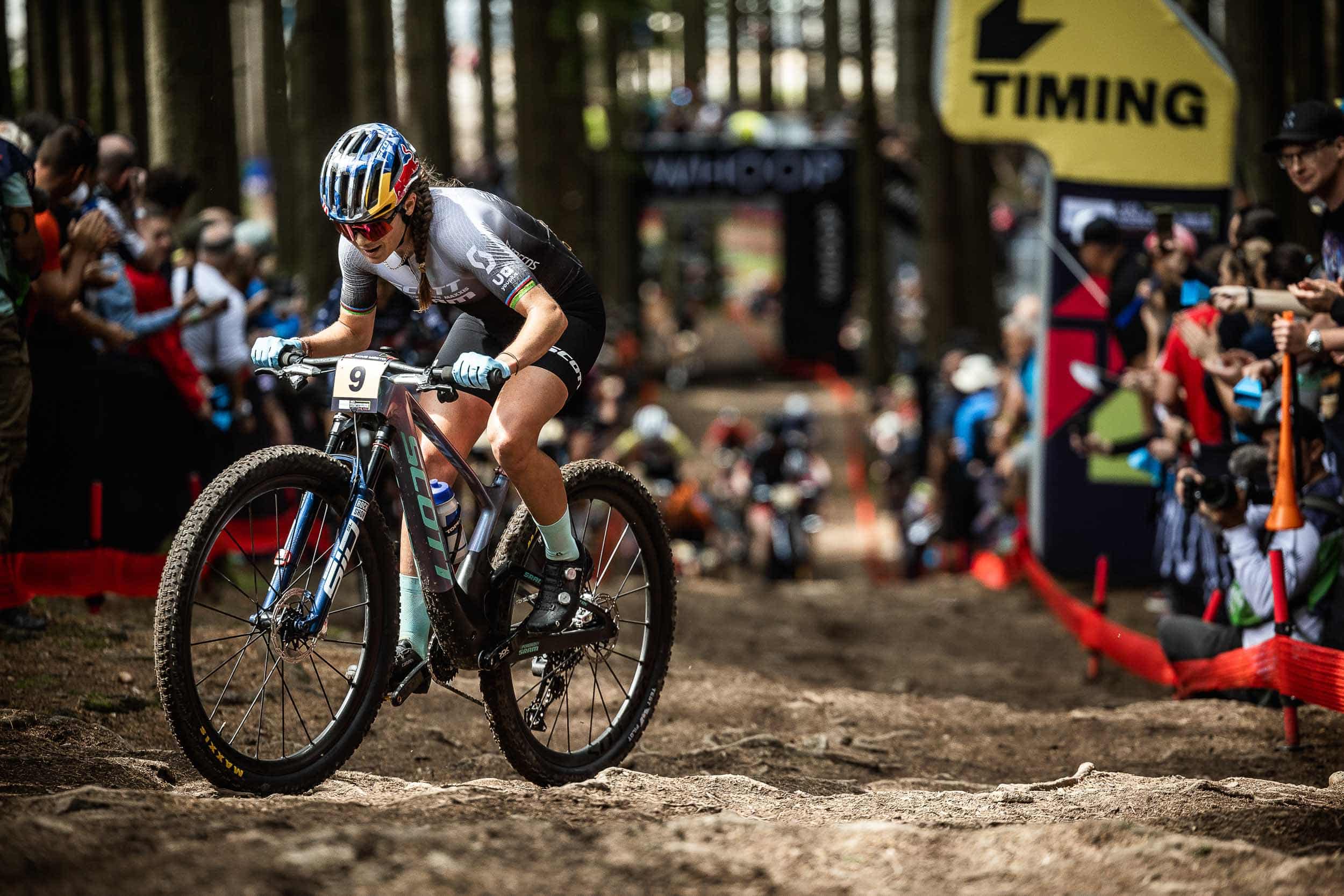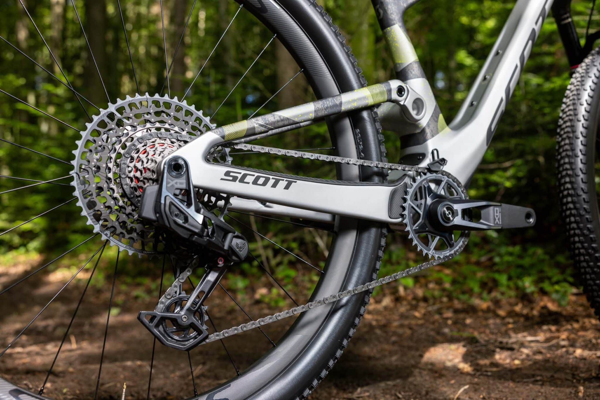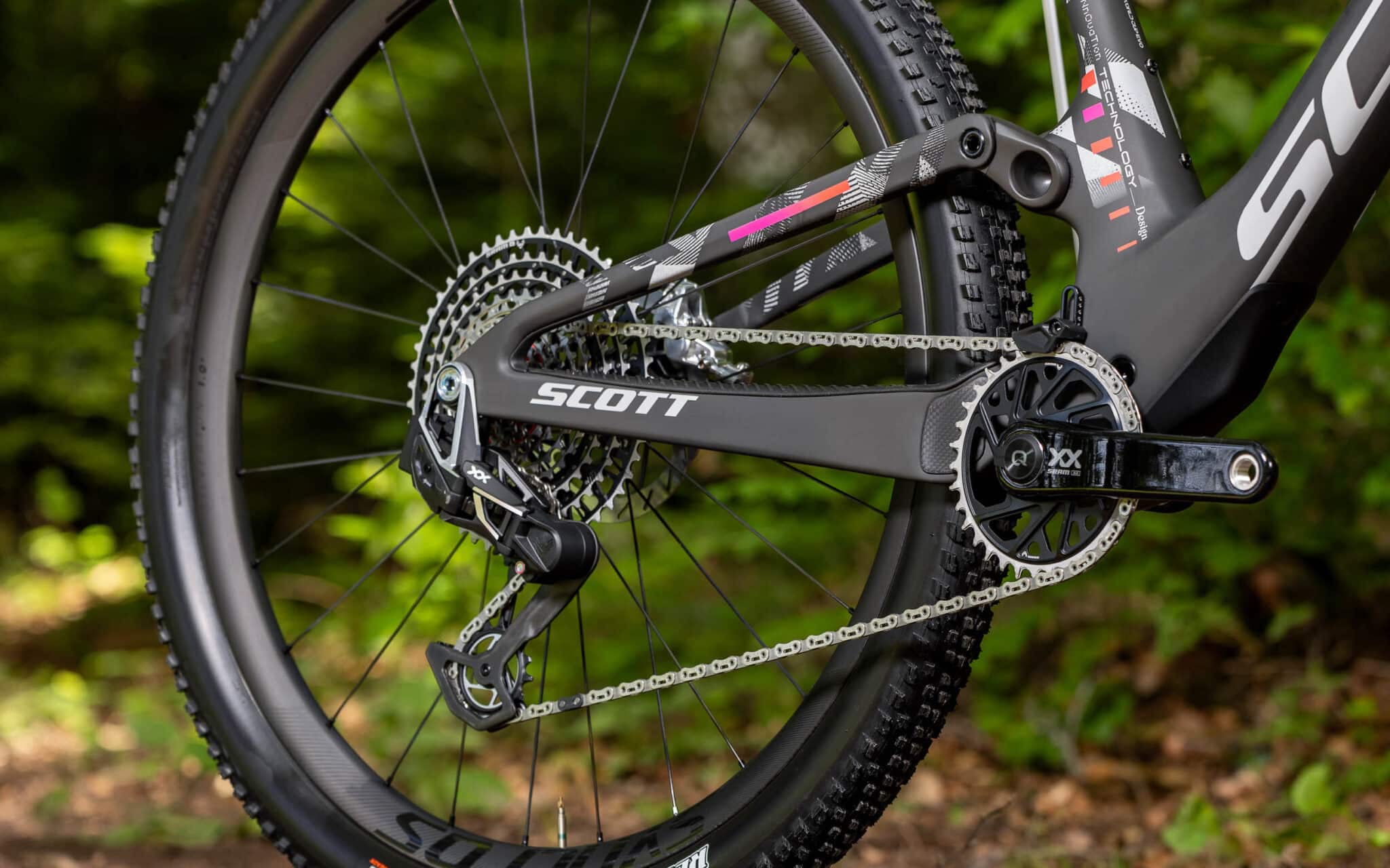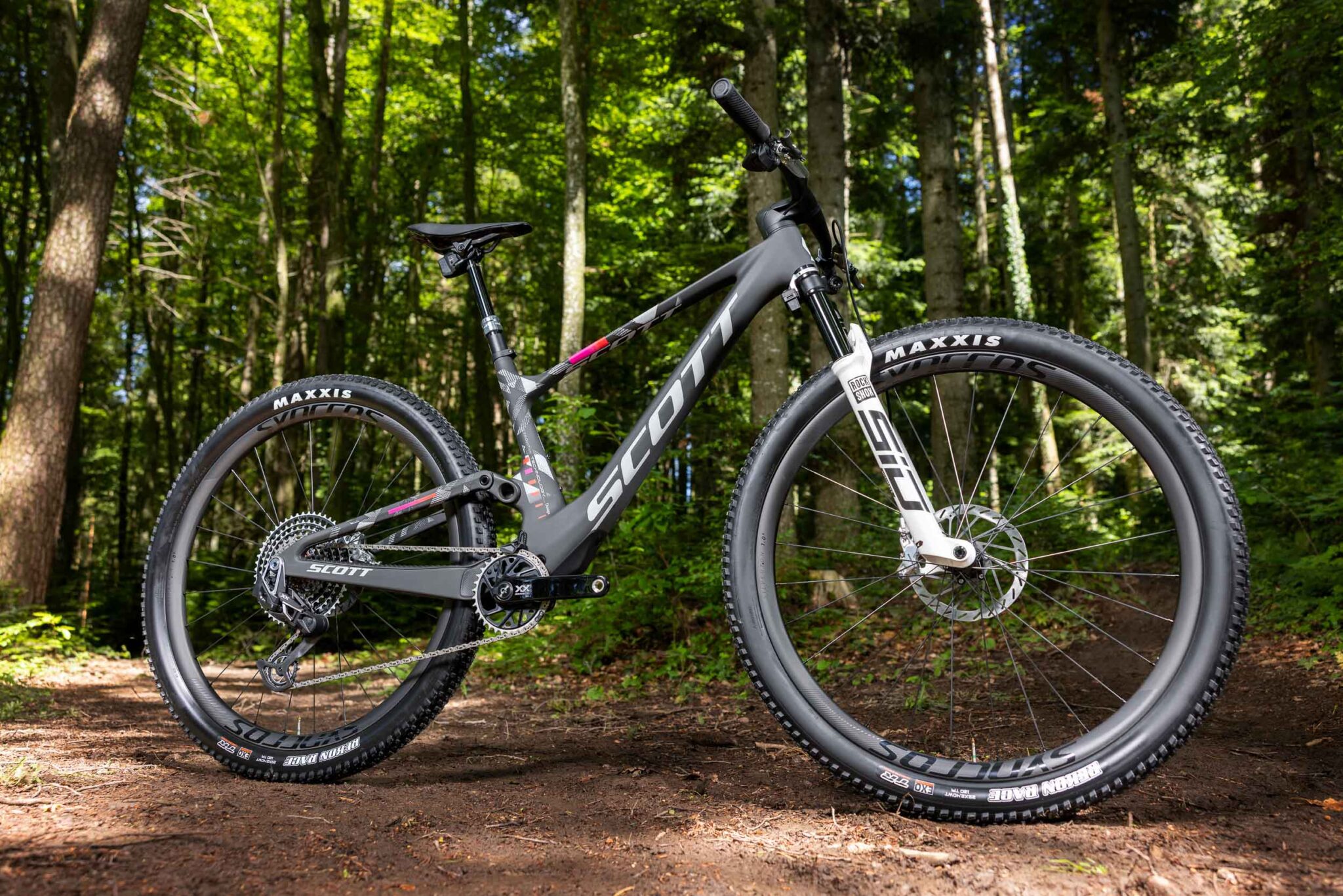 Plus haut de gamme, le Scott Spark RC World Cup Evo passe sur un cadre en fibres HMX (plus haut de gamme et plus légères), une transmission Sram XX T-Type et des roues carbone Syncros Silverton 1.0s.