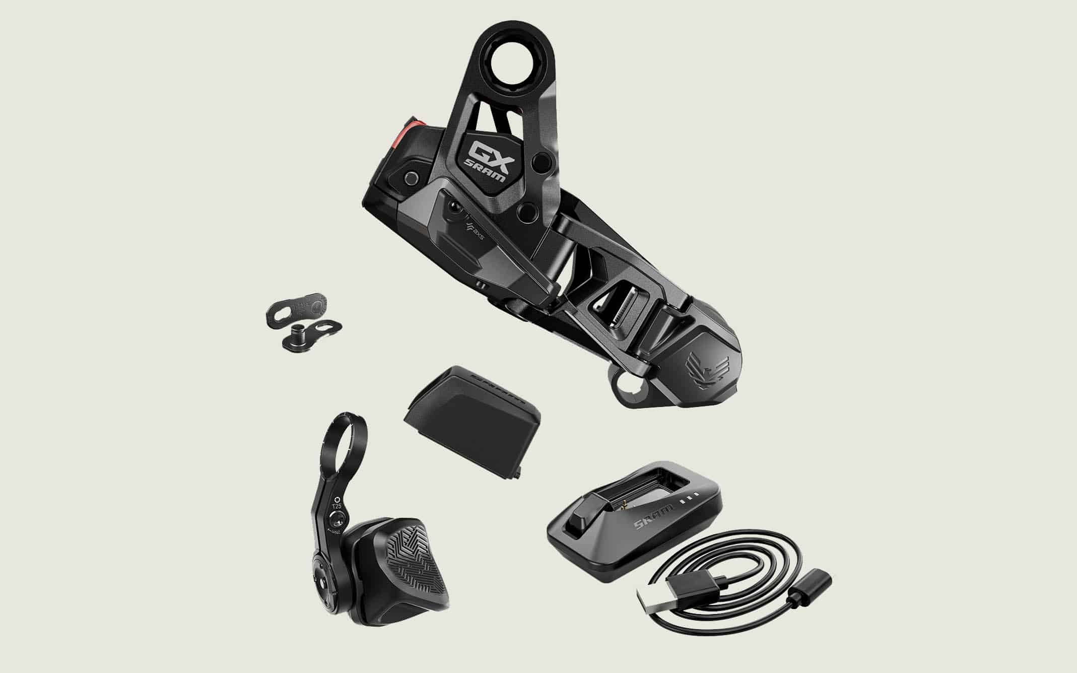 Concrètement, le kit se compose d’un corps de dérailleur GX AXS électronique sans fil avec sa batterie et le chargeur, d’un shifter AXS Pod et d’un maillon rapide pour remettre la chaîne en place facilement (la marque recommande un usage unique pour ses maillons rapides même si, en pratique, il est tout à fait possible de les réutiliser).