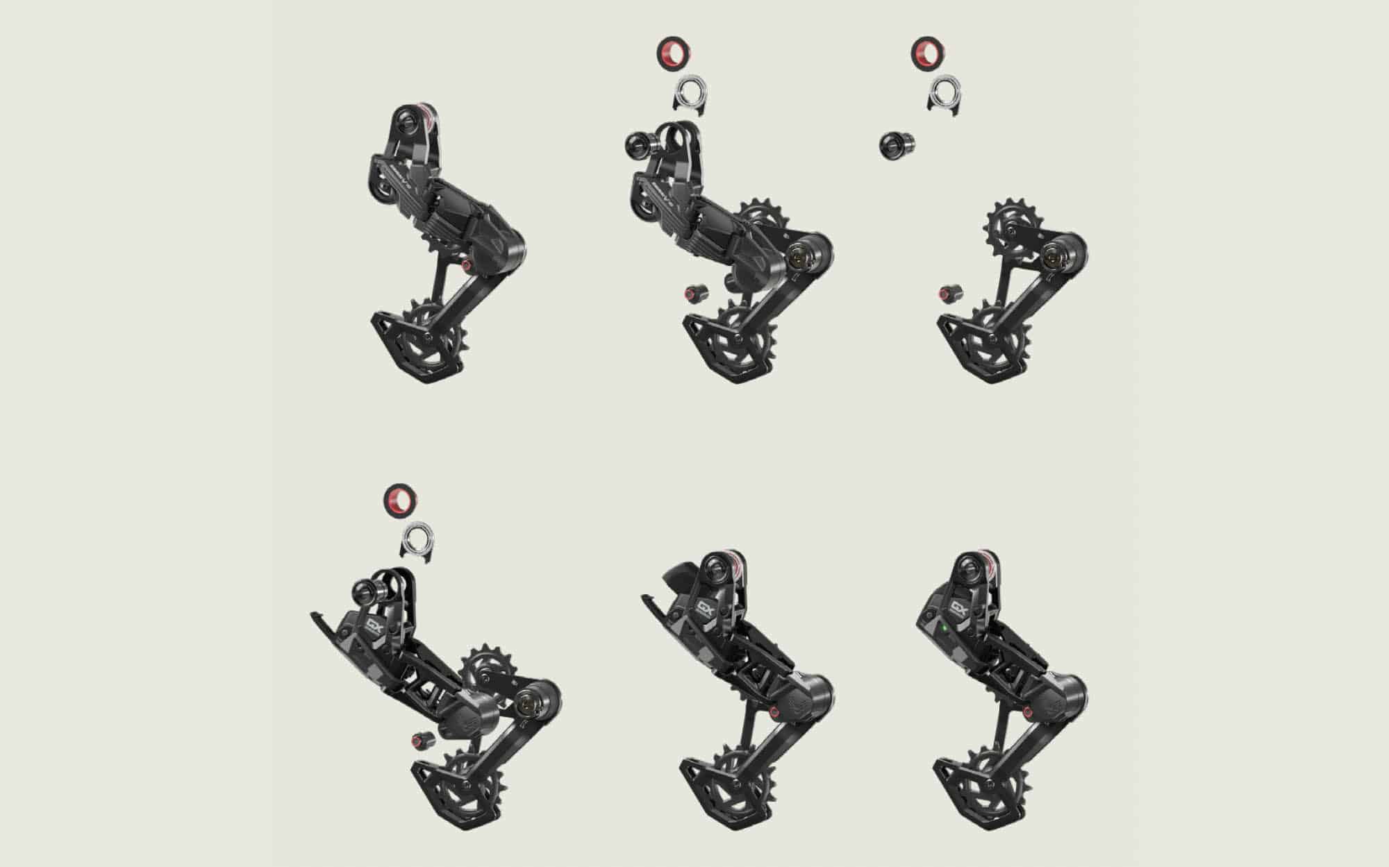 Depuis plusieurs années, RockShox (marque de suspensions du groupe Sram) offre la possibilité de mettre à jour sa fourche en conservant le châssis et en ne changeant que les pièces internes par celles de la dernière génération. Cette logique s’applique désormais aussi aux transmissions, puisqu’il sera possible de transformer une transmission mécanique à câble Sram 70 et 90 T-Type (voir notre test ici : Test nouveauté | Sram Eagle 90 & 70 : une transmission mécanique sans patte de dérailleur) vers la version AXS sans fil en ne changeant que quelques pièces.