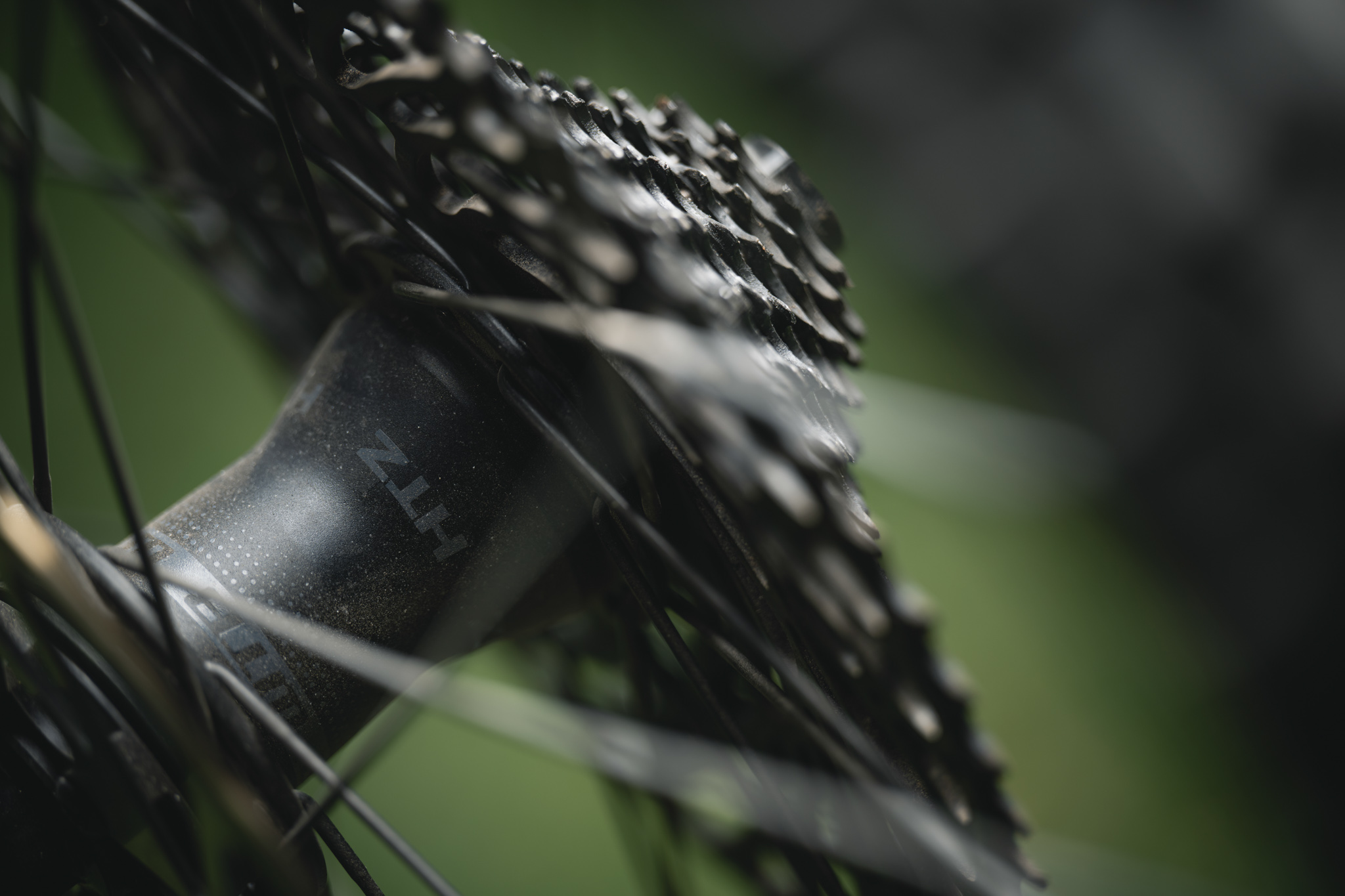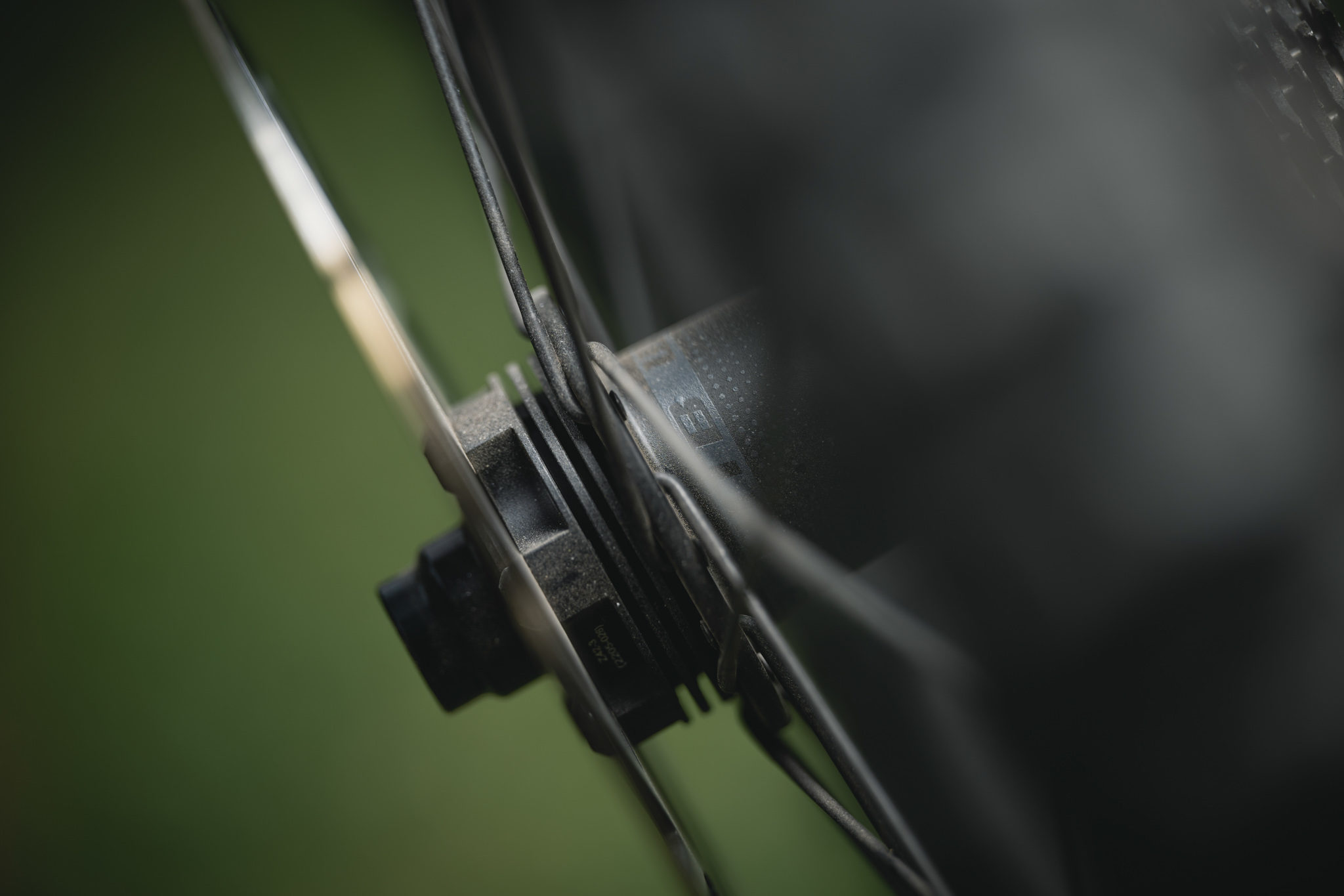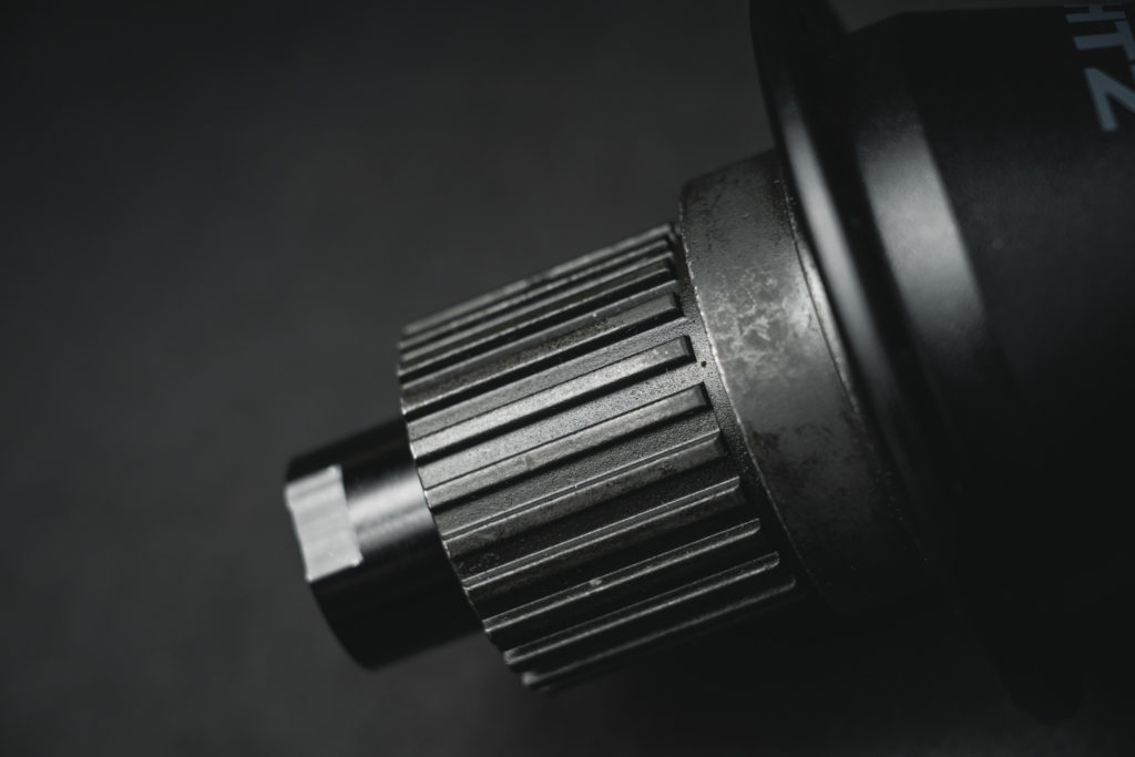 La liste des pièces adaptées ne s’arrête pas là puisque l’axe est lui aussi particulier : au format Boost à l’intérieur (12 mm de diamètre), il est surdimensionné à l’extérieur au niveau de la jonction entre le corps du moyeu en lui-même et le corps de roue libre. Une zone critique car c’est là où l’axe serait le plus susceptible de casser, du fait des forces de cisaillement qui s’y appliquent.
