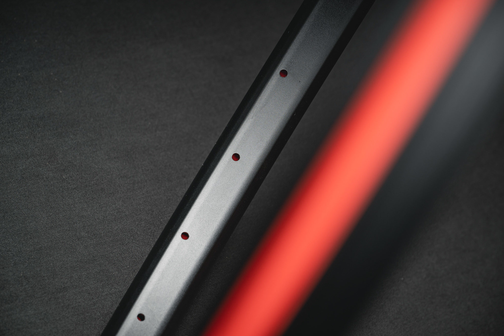 La base est donc connue et aussi bien à l’œil que par leur fiche technique, ces jantes inspirent confiance. Conçues pour résister aux pires usages, elles sont fabriquées en aluminium 6069 (plus solide) plutôt que 6061 et utilisent 20 % de matériau en plus que les jantes d’enduro classique de la marque. Quand on met les deux profils côte-à-côte (HTZ à droite ci-dessus), la comparaison est particulièrement impressionnante.