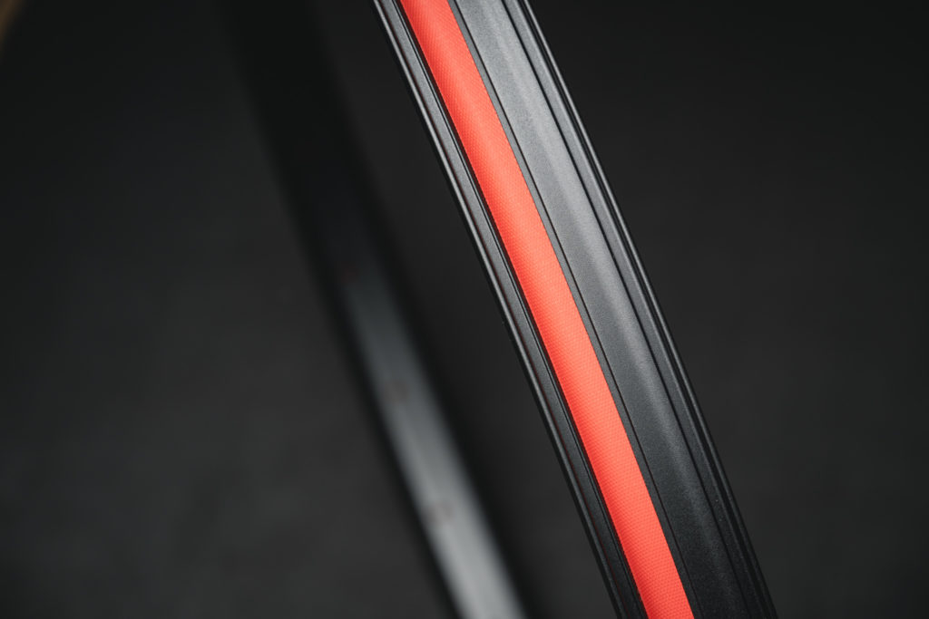 On retrouve également le « Solid strip » caractéristique des roues WTB, cette bande rouge qui vient recouvrir les trous par lesquels on insère les écrous de rayons. Pour une modique pénalité de 18 g par roue (autant dire rien du tout sur ce modèle), elle évite de percer le fond de jante lors d’une éventuelle casse de rayon. Il est tout à fait possible de rouler sans cette bande mais vu son influence sur le poids de la roue, cette manoeuvre n’a pas vraiment d’intérêt.