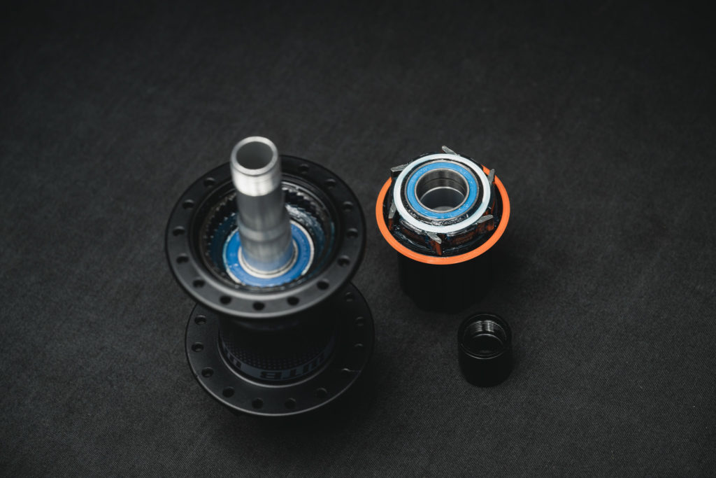 Le corps de roue libre est lui aussi en acier et bénéficie d’un traitement thermique pour augmenter encore sa solidité, ce qui s’avère notamment utile pour renforcer les cavités qui accueillent les cliquets selon la marque. En parlant de cliquets, ils sont au nombre de 6 et s’enclenchent tous en même temps. Forcément, le degré de liberté est plus élevé que sur un moyeu qui fonctionnerait avec deux groupes de 3 cliquets décalés (7,8° ici) mais cela permet de mieux répartir la charge… donc d’augmenter la durée de vie du corps de roue libre, très souvent mis à mal sur les e-bikes.