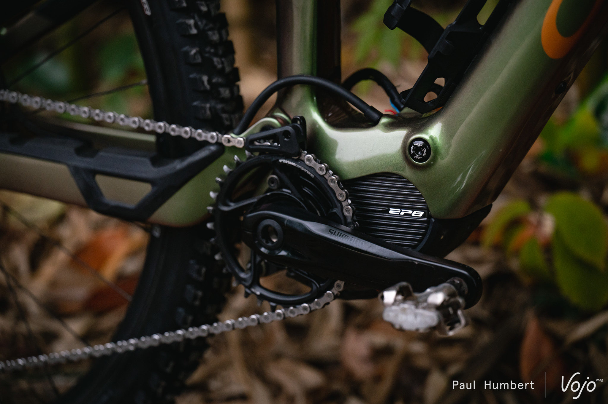 Si cet Orbea Rise conserve l’assistance EP8 RS, il bénéficie par contre de la nouvelle version de ce moteur (à savoir le EP801). Aucun changement n’est à signaler du côté de l’assistance ou de son ressenti, mais cet EP801 permet par contre le montage d’un groupe électronique Shimano Di2, bénéficiant de la technologie Linkglide (promesse d’une transmission plus durable et plus souple) et même de l’« AutoShift », un système de passage automatique des rapports que l’on vous présentait récemment juste ici : https://dev.vojomag.com/news/le-shimano-di2-de-retour-en-mode-auto-mais-que-pour-le-bike/. Cette nouvelle transmission électronique de chez Shimano ne sera malheureusement pas compatible avec les Rise première génération car ce dérailleur Di2 nécessite un port de branchement supplémentaire au niveau du moteur, uniquement présent sur cet EP801.