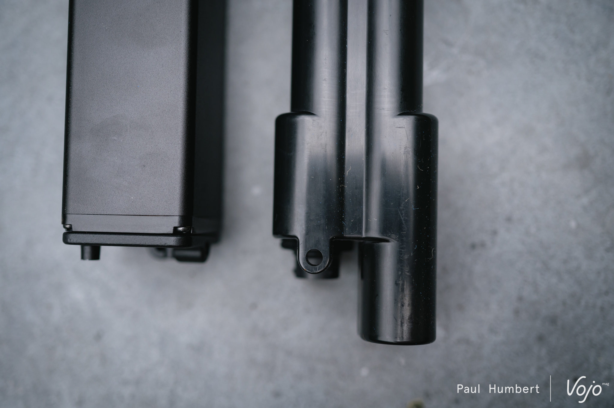 La plus petite des deux a été redessinée et optimisée par la marque espagnole afin de permettre un gain de poids (non-négligeable) de 300 g. Exit la cage en aluminium, le plastique a été préféré et le positionnement des cellules a été amélioré. Les points de fixation de cette batterie sont désormais intégrés à la batterie, ce qui permet de mieux la positionner et d’obtenir une meilleure répartition du poids sur le cadre – la batterie « descendant » plus bas près du moteur -, et donc un comportement encore plus naturel.