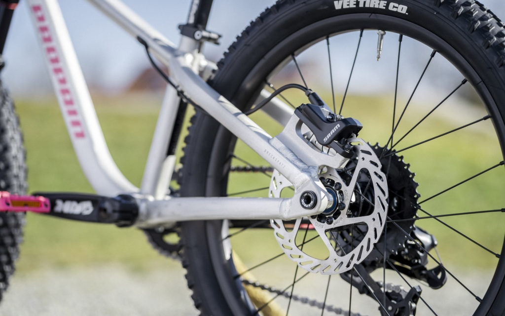Le Barney est un cadre en aluminium, équipé de freins à disques et de pneus gros volume de chez Vee Tire, qui affiche un poids de 7,8 kg. Propain explique que « pour un vélo de cette taille, les pneus de grand volume offrent un amortissement beaucoup plus efficace qu’une fourche ou un amortisseur et permettent un gain de poids et d’adhérence notable ».