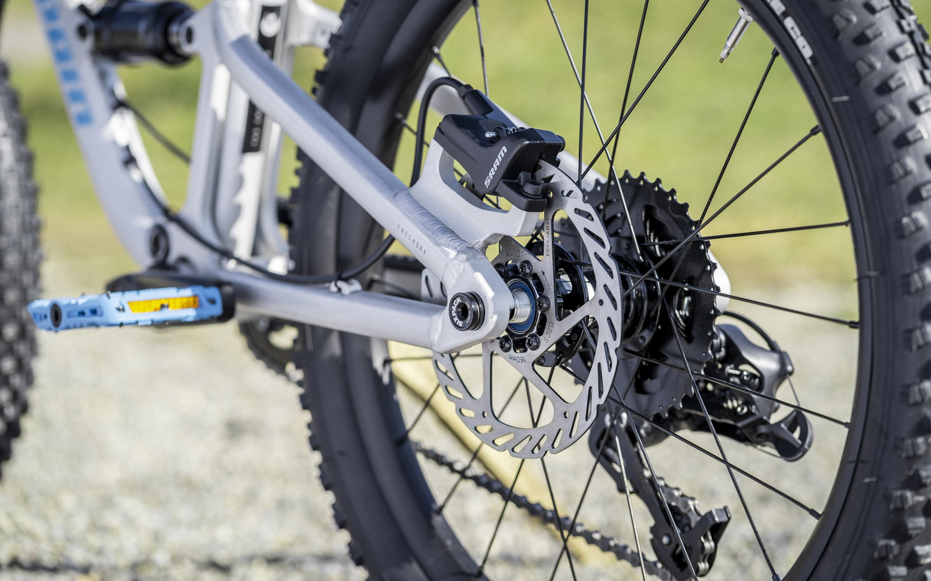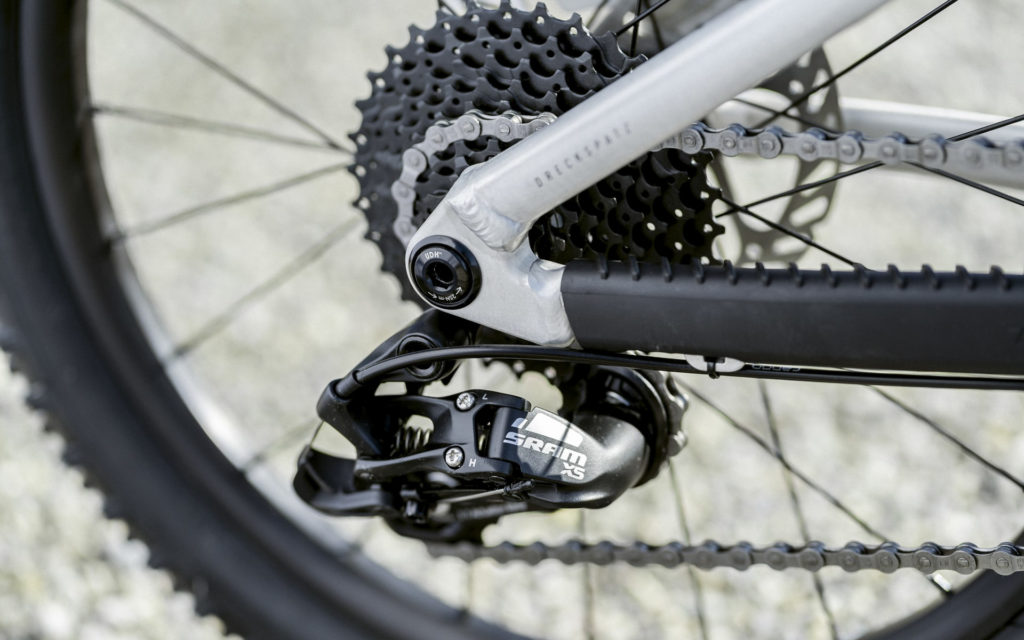 Le Frechdax est un cadre en aluminium sur lequel on retrouve un passage interne des gaines ainsi qu’une patte de dérailleur universelle (Sram UDH)… Comme le vélo des grands !