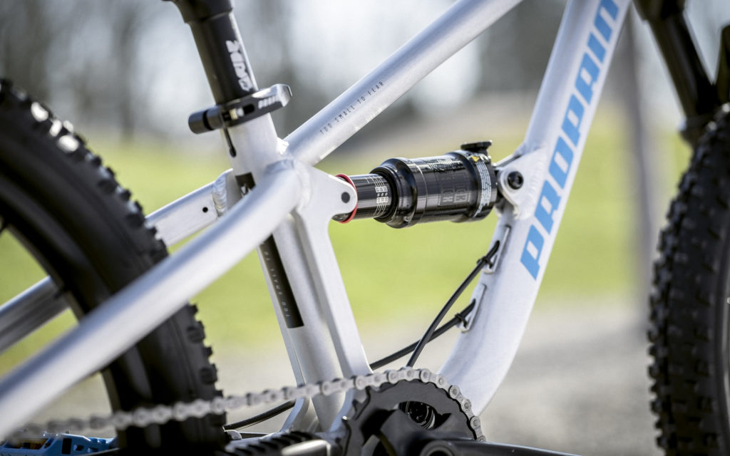 Ce modèle de 20″ est équipé d’une fourche de 80 mm de débattement qui se veut spécifique selon Propain : la marque précise qu’elle est adaptée pour les enfants (et leur plus faible poids) et dispose en ce sens d’un té renforcé en carbone ainsi que d’une chambre à air et d’un ressort négatif adaptés. À l’arrière, c’est un amortisseur RockShox spécialement réglé pour l’occasion qui équipe ce modèle afin d’offrir le confort nécessaire à ces pilotes pesant entre 20 et 40 kg. Celui-ci offre, quant à lui, 90 mm de débattement à cette plateforme tout-suspendue.