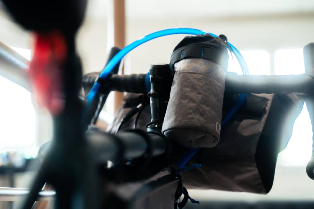 Pour finir sur l’avant du vélo, CamelBak propose également un vide poche/porte-bidon prévu pour se fixer dans le coin entre le cintre et la potence, offrant un petit stockage facilement accessible. Cet accessoire est le seul de la gamme M.U.L.E On-Bike non certifié IPX5 (logique au vu de son système de fermeture avec un simple cordon).
