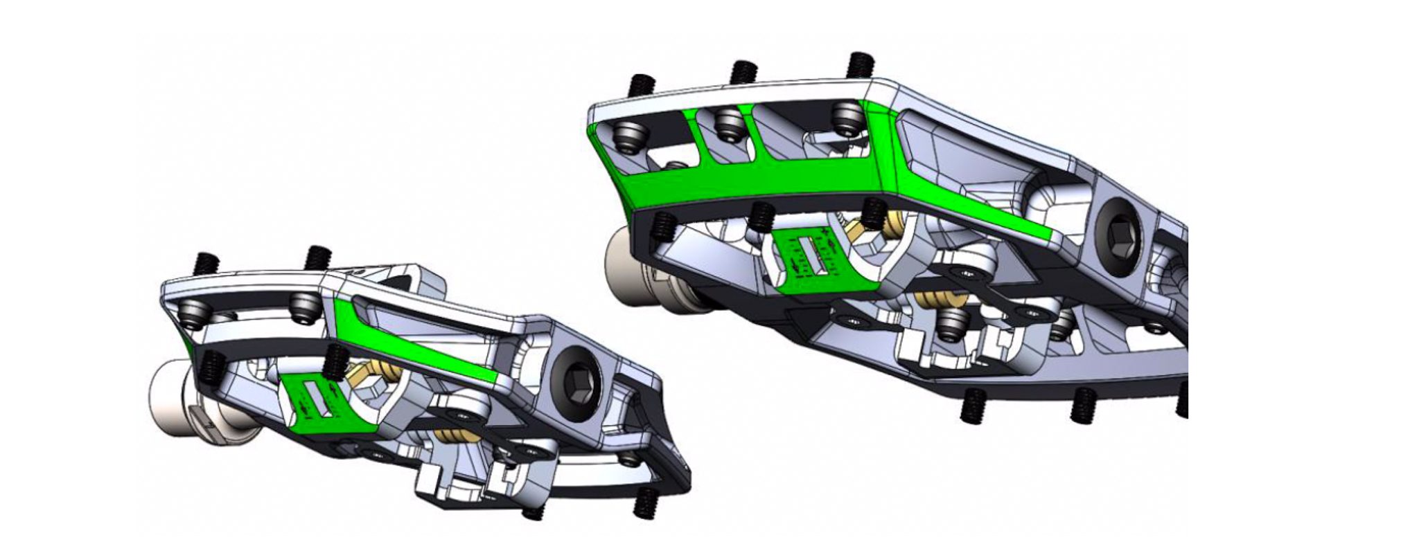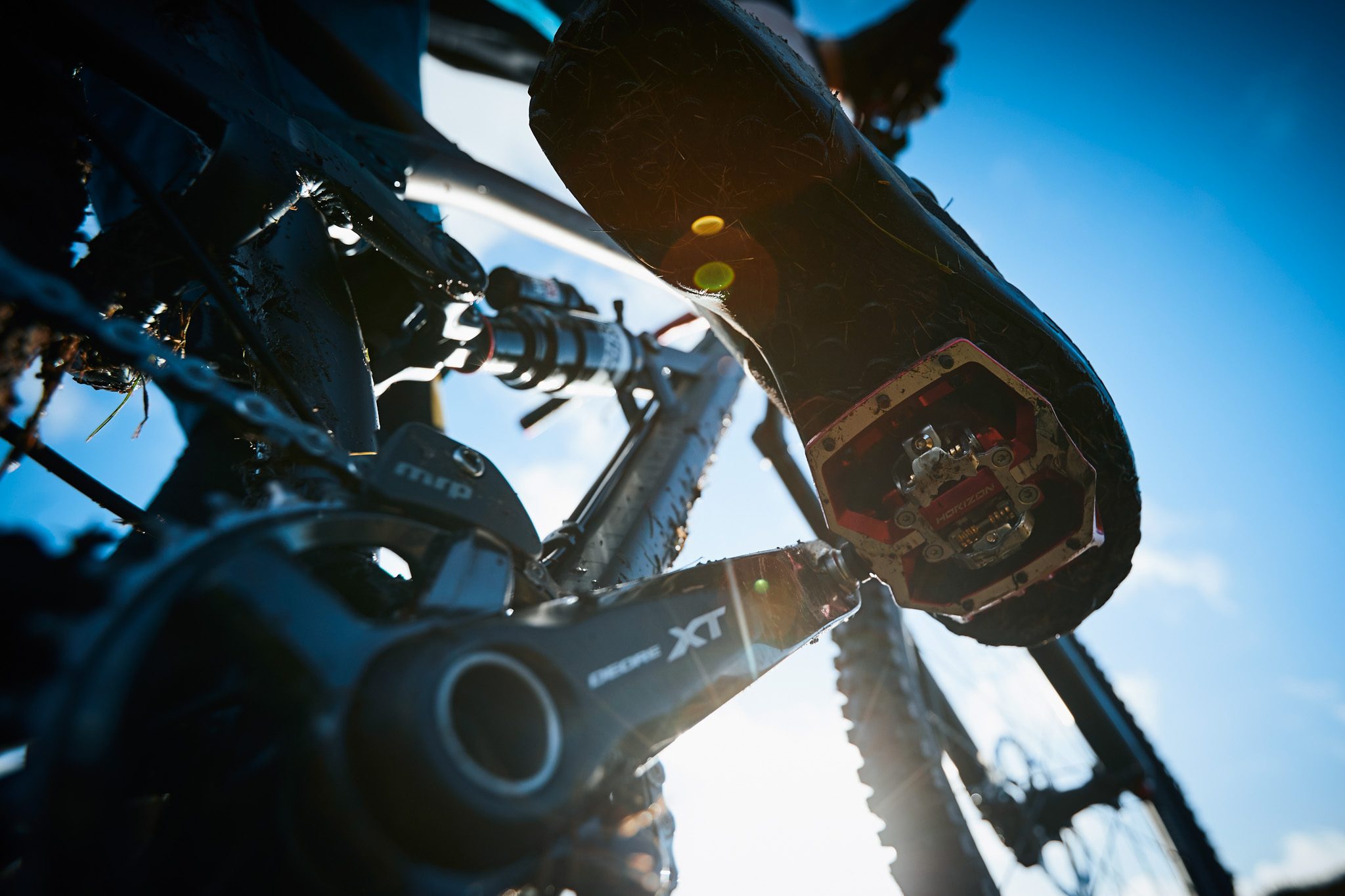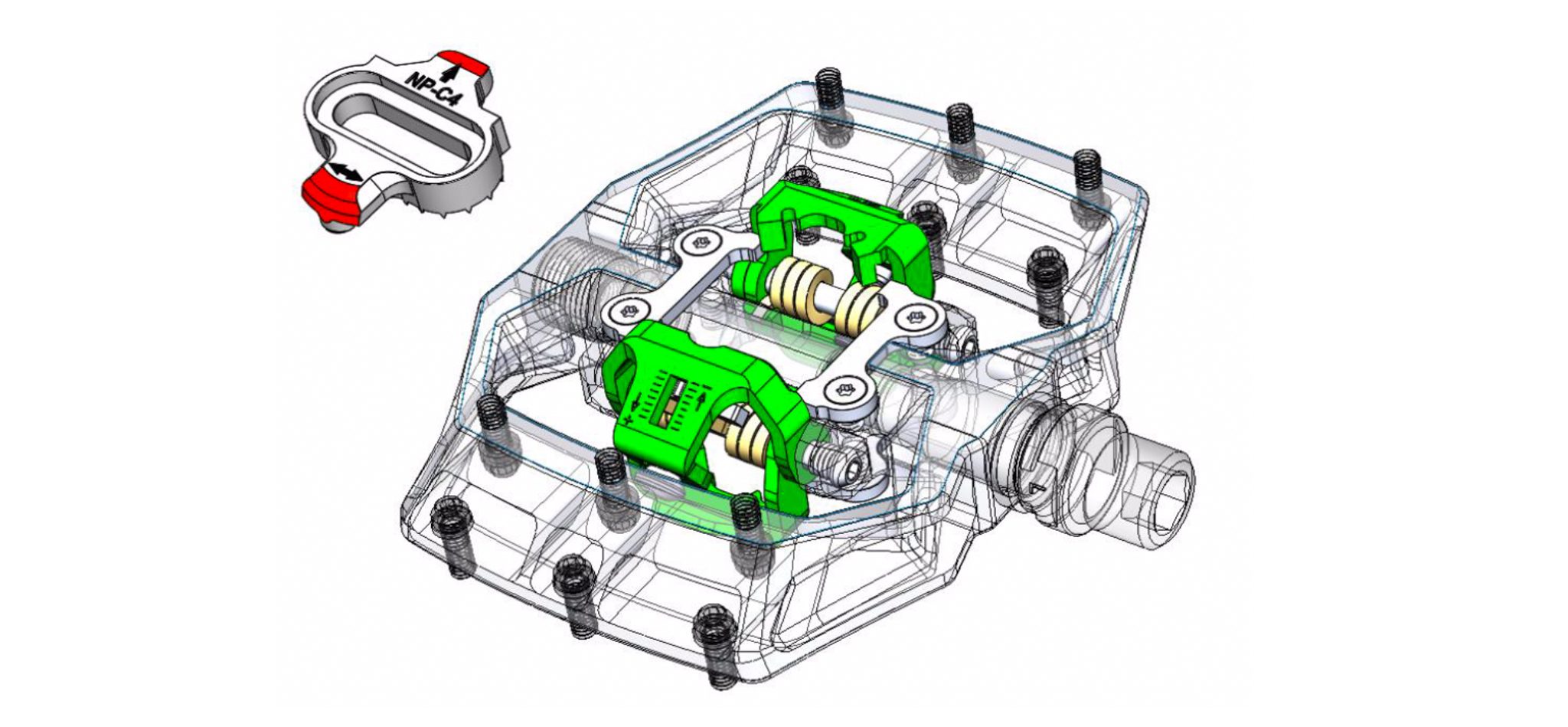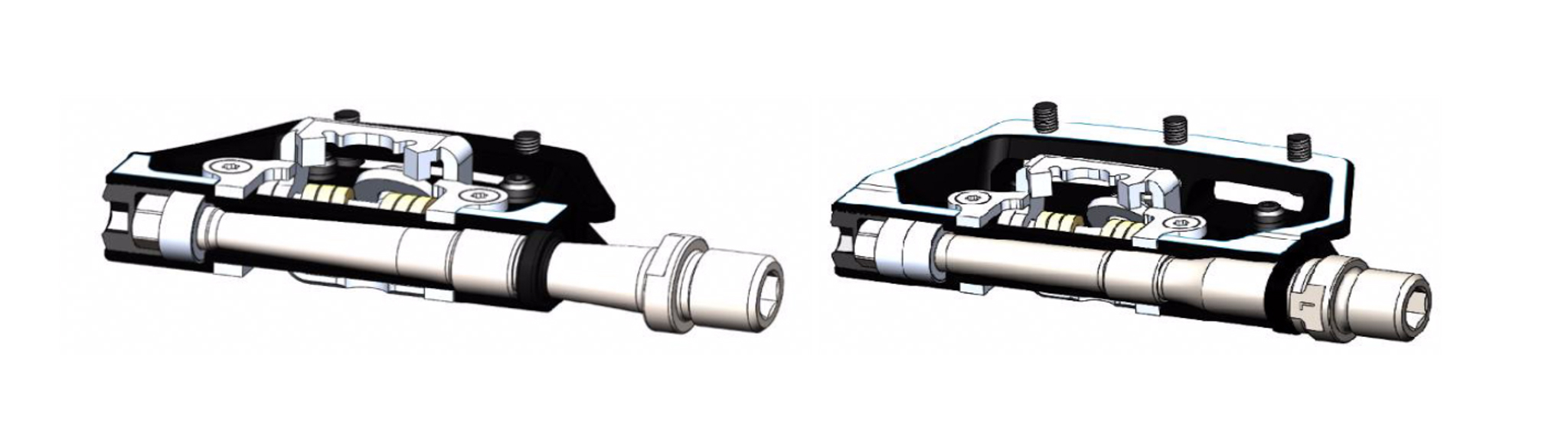 L’axe des deux modèles protège les roulements et des bagues complètent le système. La cage des pédales est construite à partir d’aluminium 6061 et les pédales (CL et CS) ont un Q factor de 55mm, de manière à rester compatibles avec les axes arrière de 142, 148 et 150mm de large. La forme de la cage est travaillée de manière à protéger le mécanisme d’enclenchement, à convenir au plus grand nombre de chaussures et à ne pas apporter d’obstacle lors de l’enclenchement du mécanisme.