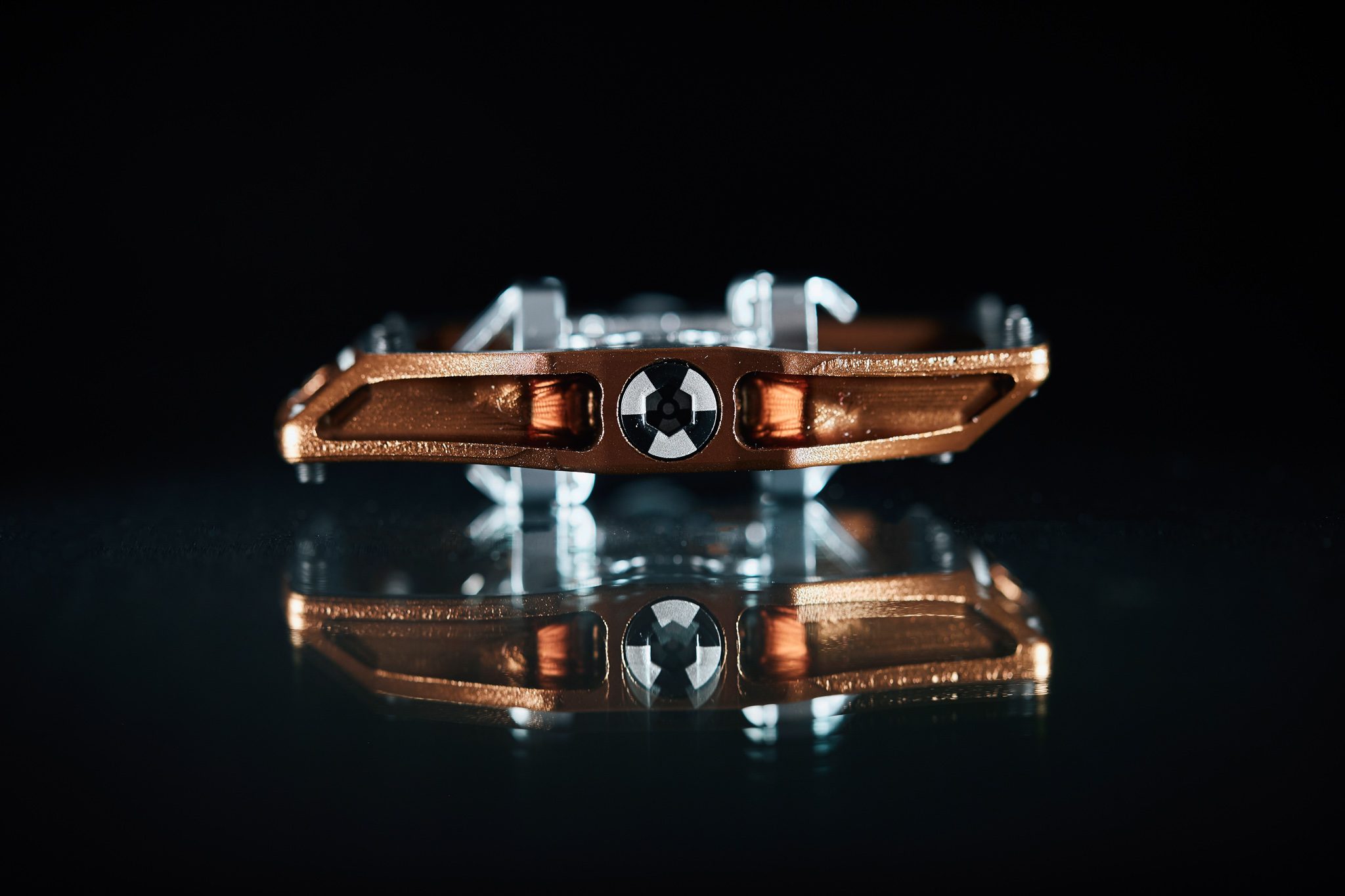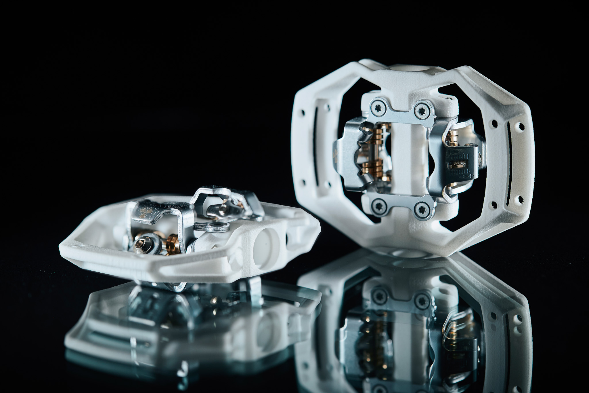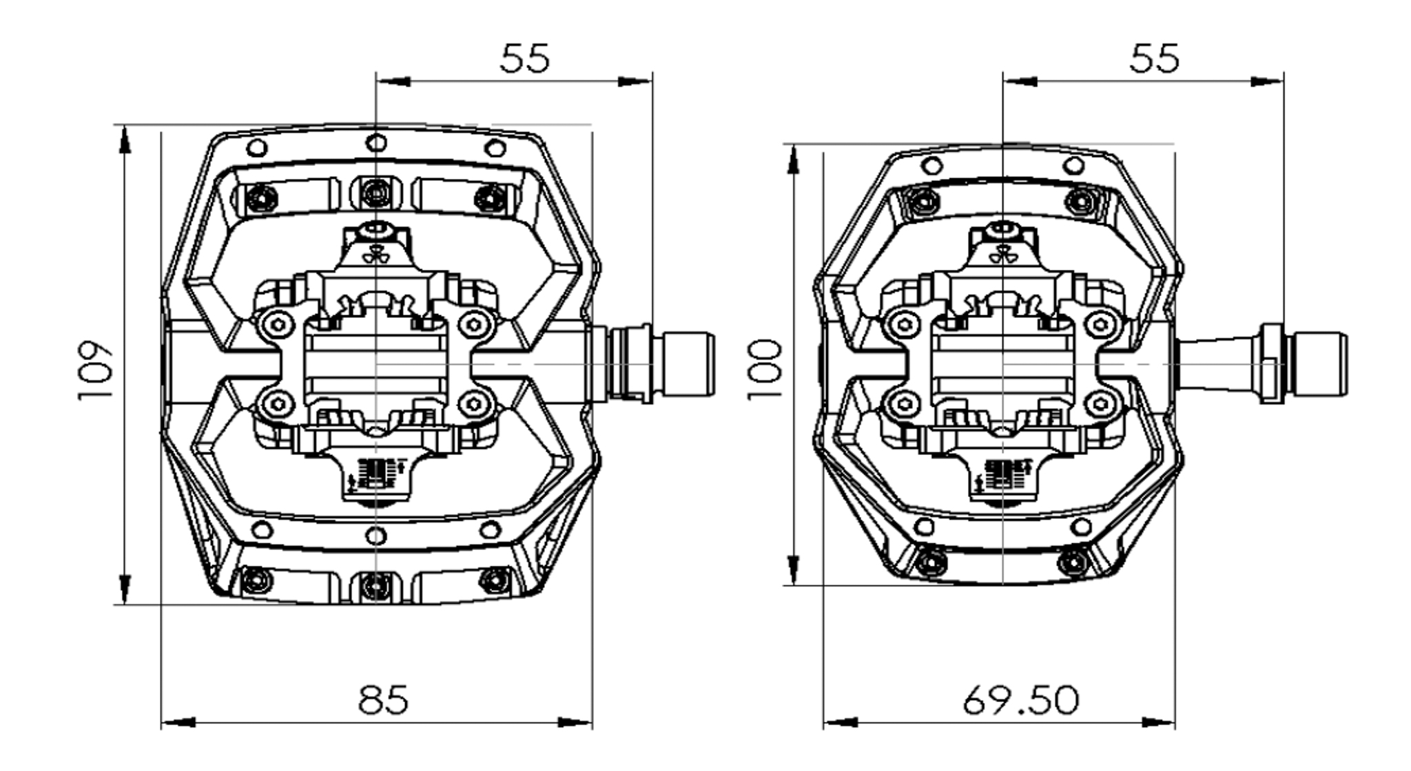 L’axe des deux modèles protège les roulements et des bagues complètent le système. La cage des pédales est construite à partir d’aluminium 6061 et les pédales (CL et CS) ont un Q factor de 55mm, de manière à rester compatibles avec les axes arrière de 142, 148 et 150mm de large. La forme de la cage est travaillée de manière à protéger le mécanisme d’enclenchement, à convenir au plus grand nombre de chaussures et à ne pas apporter d’obstacle lors de l’enclenchement du mécanisme.