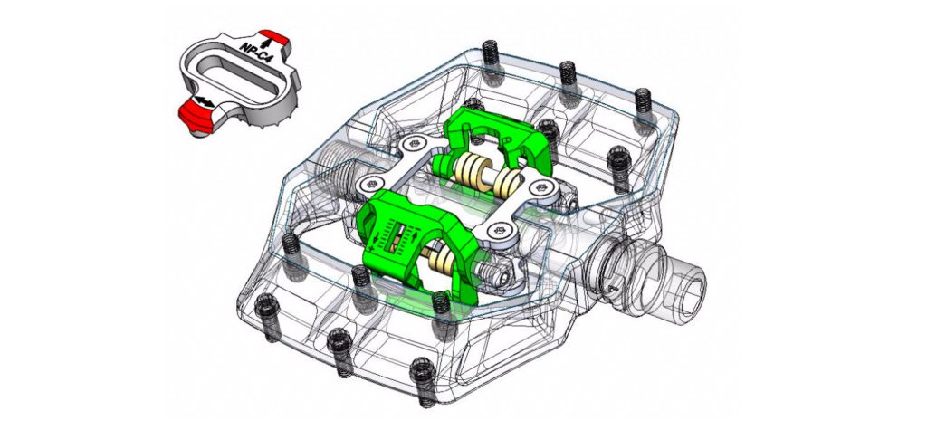 Le mécanisme ressemble à celui de Shimano (et le mécanisme est d’ailleurs compatible SPD même si la cale est propre à Nukeproof) et on retrouve un ressort sur les deux côtés de la mâchoire. Il est possible de « clipser » en avant, en arrière et par dessus.