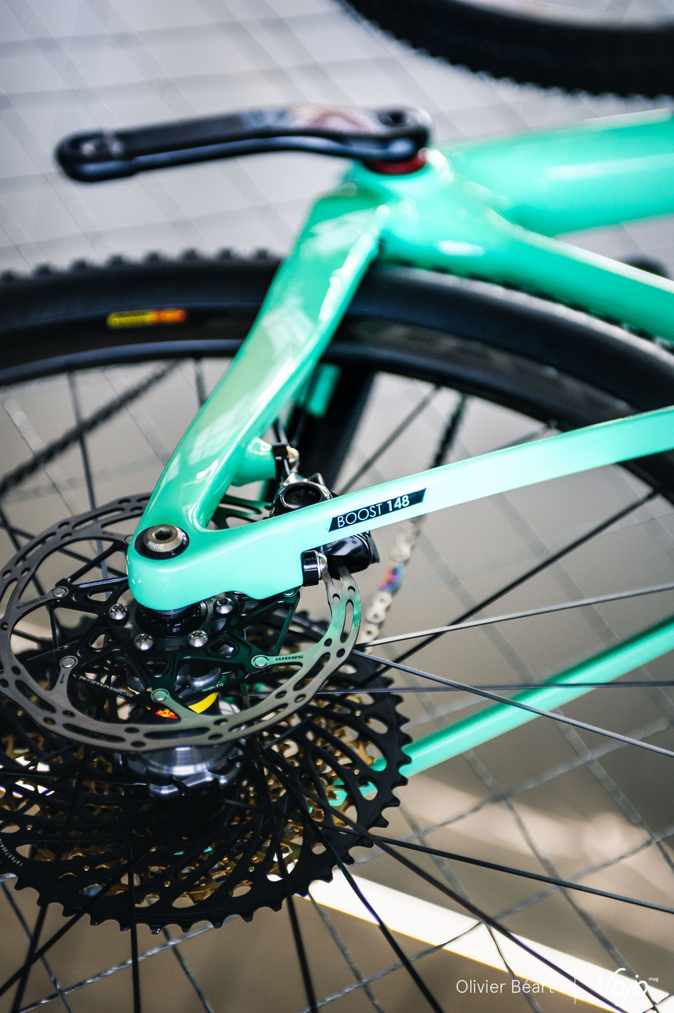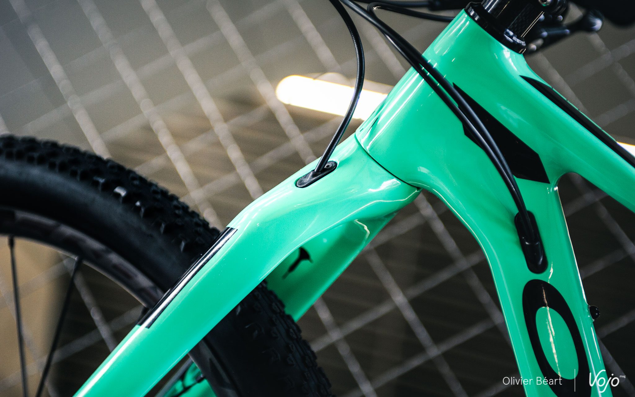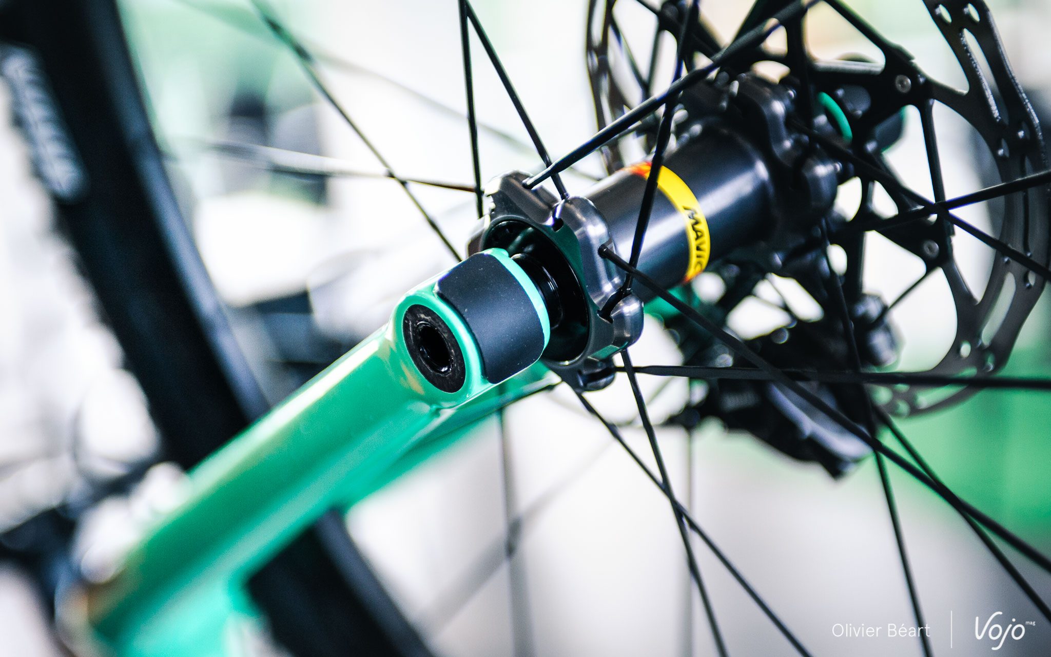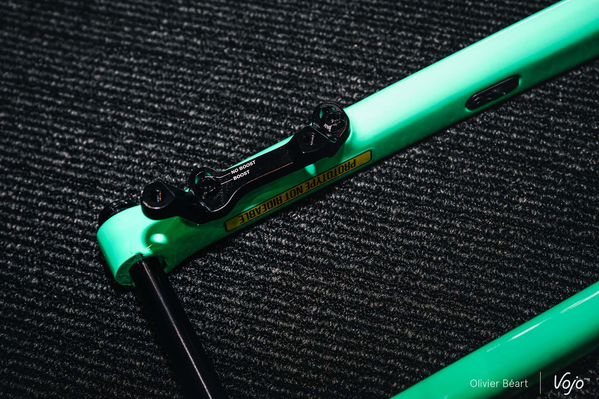 Il y a bien sûr le poids (580g), mais aussi sa multi-compatibilité en roues Boost/non Boost avec un adaptateur malin pour l’étrier de frein qu’on peut déplacer latéralement, ainsi que pour les roues de 27,5+ et 29″. Elle pourra aussi être peinte dans le cadre du programme de personnalisation MyO, qui est étendu du vtt à la route et qui permettra de choisir la finition de son cadre, ainsi que de sa fourche assortie quand il s’agit du modèle rigide comme ici.