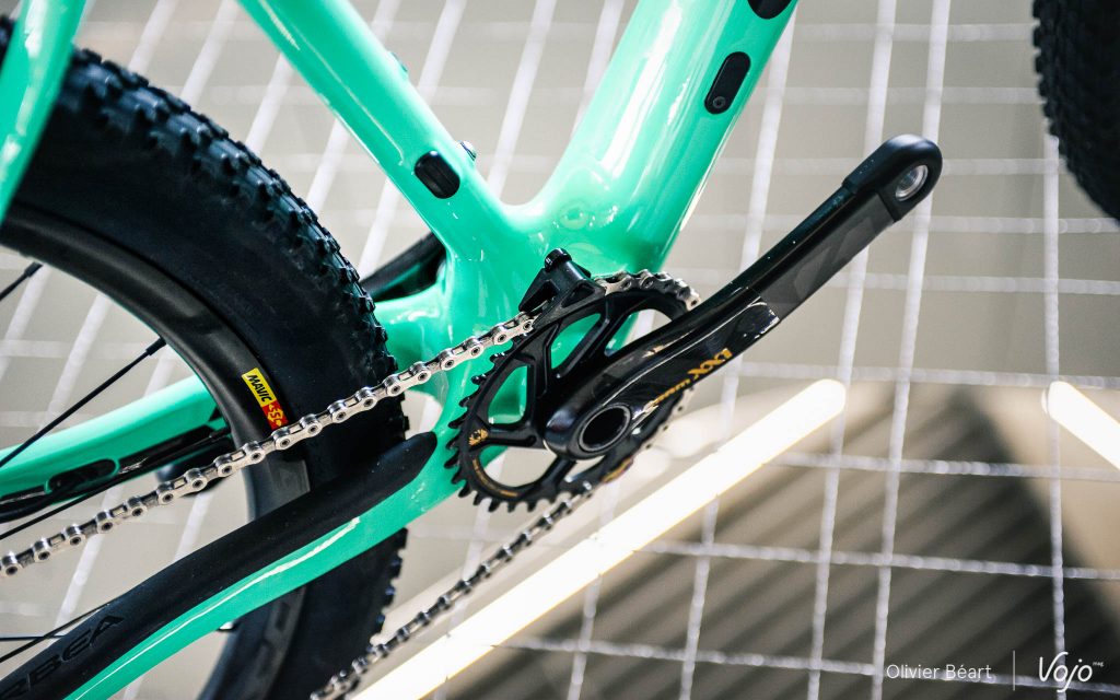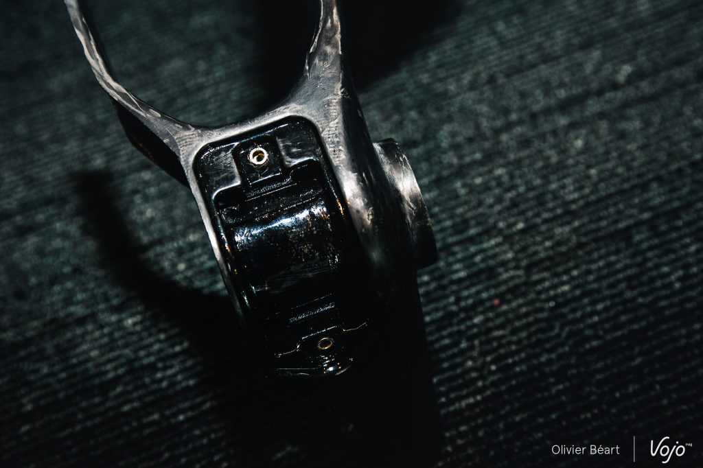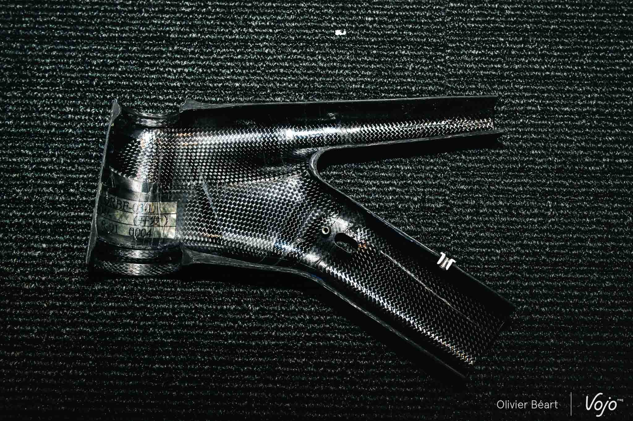 Un gros travail a été fait sur la construction du cadre, qui utilise des fibres Toray T700, T800 et M40J comme sur les haut de gamme route. La construction vise aussi à éliminer tout surplus de matière avec des feuilles de carbone découpées au laser et un moulage sur base EPS permettant un compactage parfait des fibres, comme sur la plupart des cadres carbone haut de gamme contemporains. Il n’y a plus non plus le moindre insert en aluminium sur le vélo, dont le cadre affiche un poids de 920g en taille M.