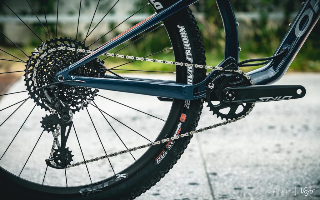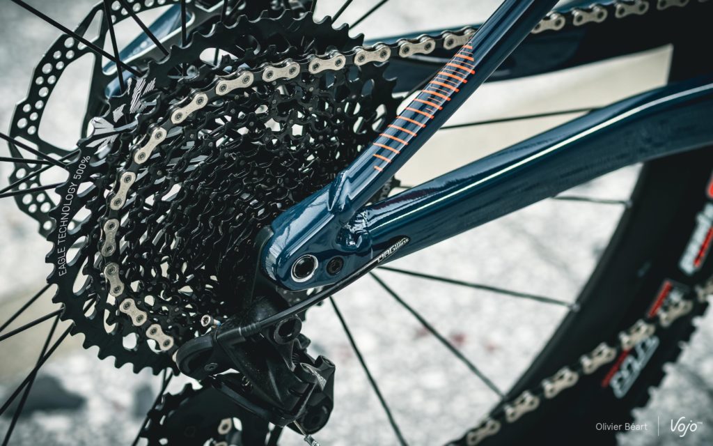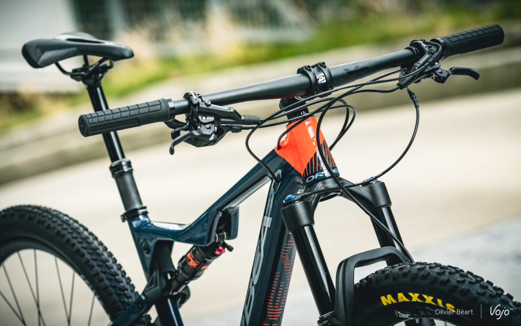 Le Orbea Oiz H10, ici photographié, propose une tige de selle télescopique d’origine, des pneus de bonne section (2.35″ à l’avant d’origine) et, comme ses deux petits frères en alu, une configuration en 120mm de débattement au niveau des suspensions. Il semble que le modèle intermédiaire, le H20, puisse être ramené en configuration 100mm à l’achat. En effet, Orbea propose à ses clients, comme à son habitude désormais, un programme de personnalisation poussé !