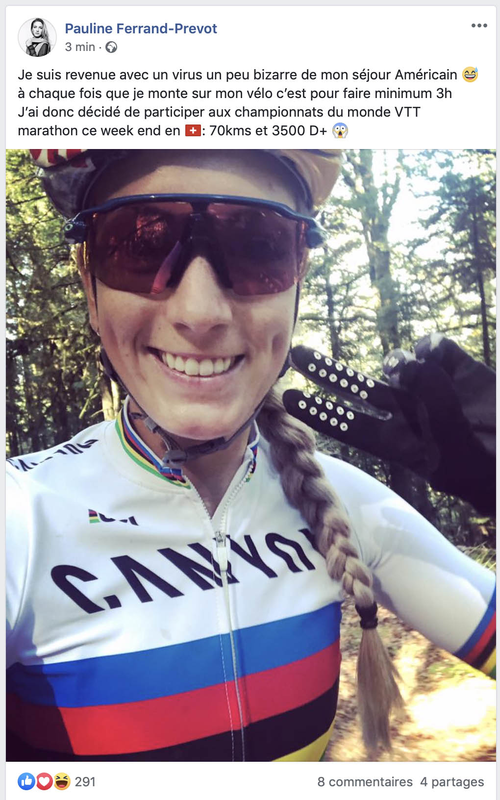 Pauline Ferrand-Prevot commence en faisant presque peur à ses fans : « Je suis revenue avec un virus un peu bizarre de mon séjour américain », explique-t-elle sur les réseaux sociaux. Mais on est vite rassurés : « A chaque fois que je monte sur mon vélo, c’est pour faire minimum 3h. J’ai donc décidé de participer aux championnats du monde VTT marathon ce week-end en Suisse : 70km et 3500m de D+ » !