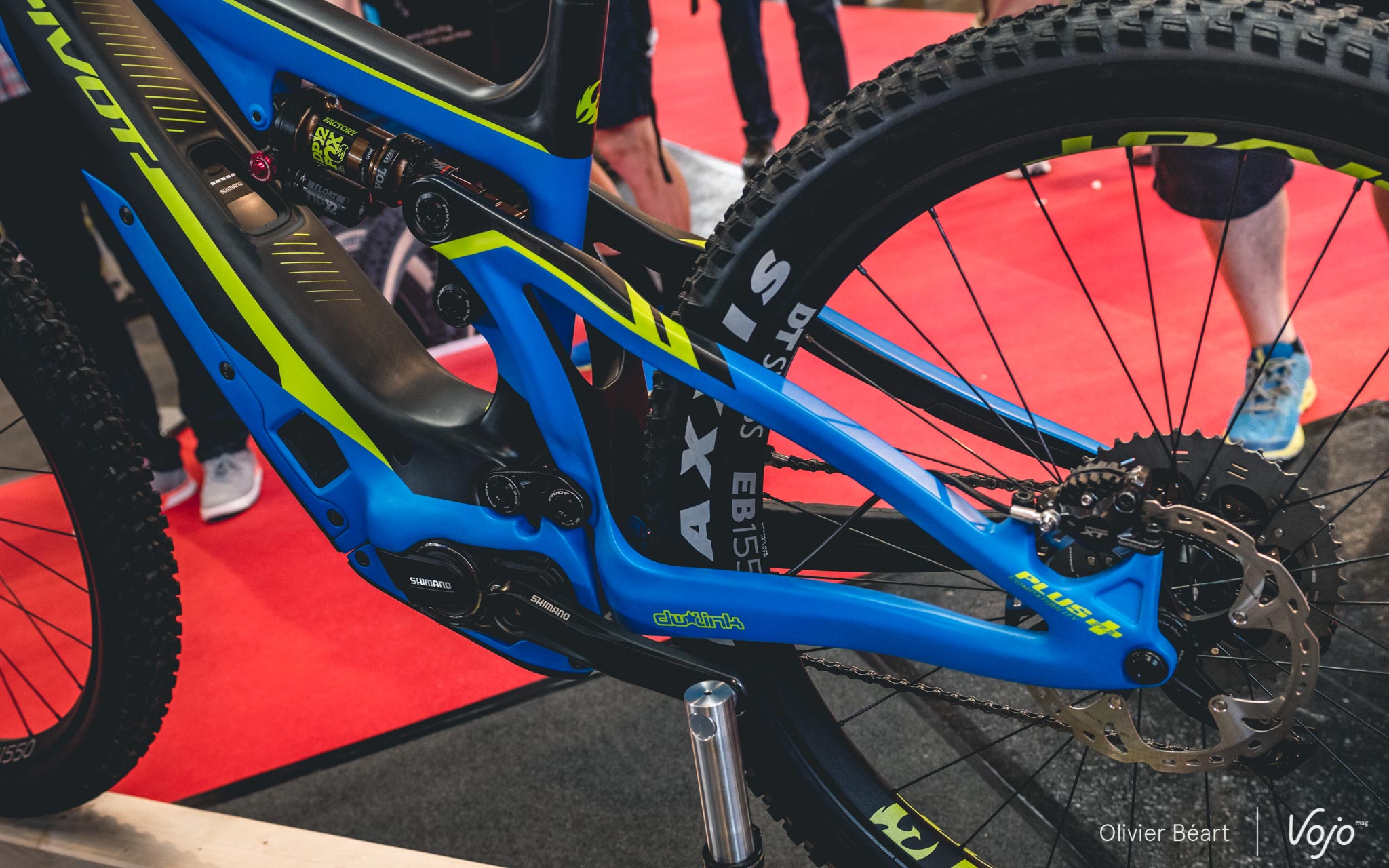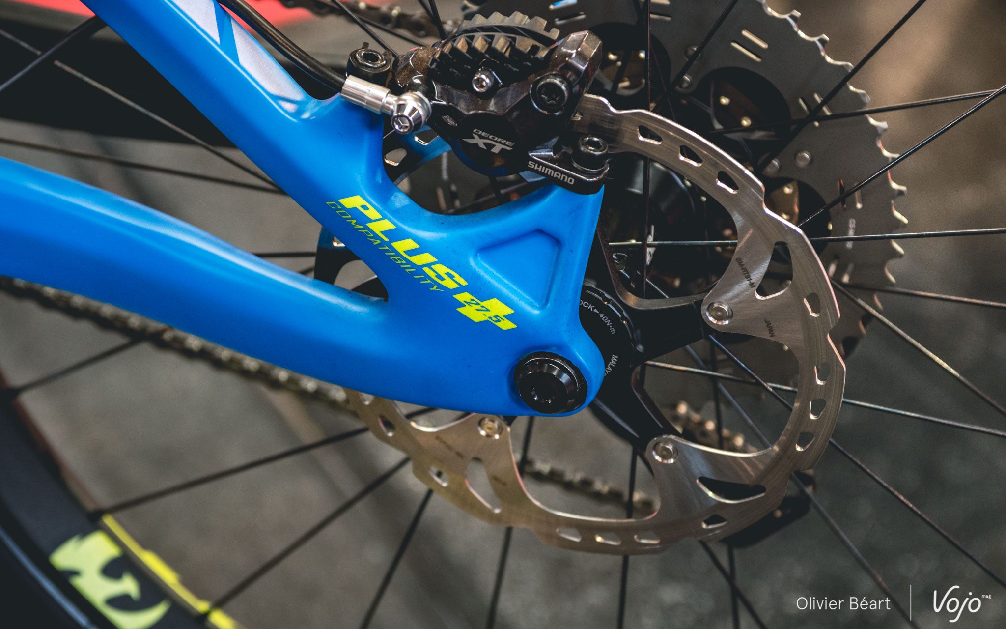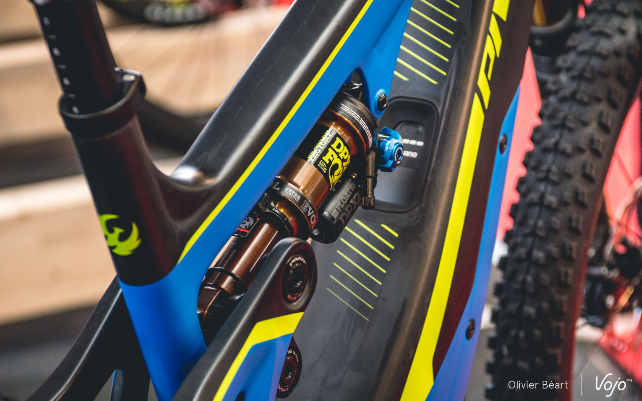 Très proche du Pivot Switchblade, sa suspension DW-Link offre un peu plus de débattement à l’arrière (140mm contre 135), mais surtout des bases très courtes de 437mm, ce qui est assez exceptionnel pour un vtt électrique en pneus Plus. A l’avant, la fourche est en 160mm.