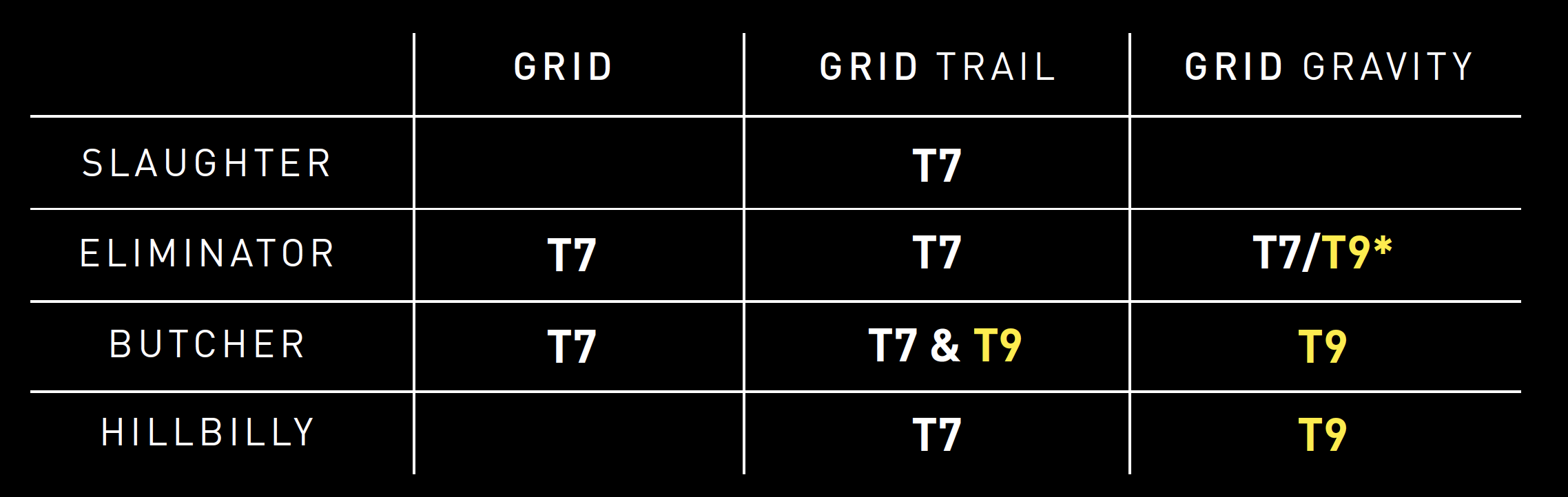 Pour les tarifs c’est plutôt simple puisqu’à chaque carcasse est associée un prix, qui reste le même peu importe la gomme (T7 ou T9), le dessin des crampons ou la taille et la section. Les Slaughter, Eliminator, Butcher et HillBilly sont donc affichés à 49,90 € en carcasse Grid, 59,90 € en Grid Trail et 69,90 € en Grid Gravity. Selon la carcasse choisie, ces pneus sont disponibles en 2,3″ ou 2,6″ de section (ou les deux), en 27,5″ comme en 29″.