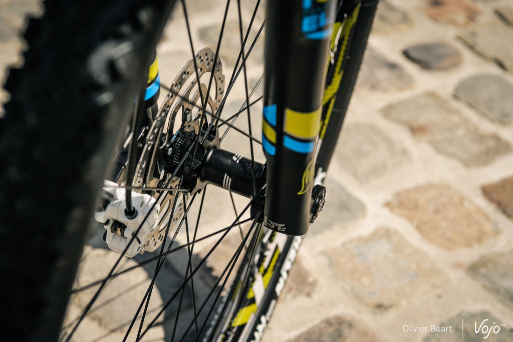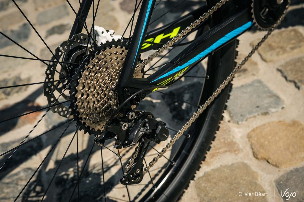 La partie avant du cadre est également revue, tout comme la géométrie avec un reach allongé, mais l’angle de direction est plus droit (70°) que sur l’Ultimate afin de garder un comportement un peu plus accessible que sur le grand frère, résolument axé compétition à haut niveau. On remarque aussi un nouveau passage intégré des câbles et gaines, entièrement guidé.