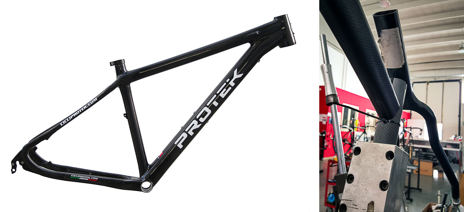 A la base, Protek est un artisan qui produit encore une partie de ses cadres en Italie, comme le montrent les photos ci-dessus, prises lors de la visite des gars du Ravito sur-place. « Mais ils ne savent en sortir que 400 par an de leur usine, alors que la demande est nettement plus grande. Ils n’avaient ni la possibilité, ni l’envie de faire de gros volumes directement eux-mêmes. Antonio Carotta, le fondateur, a donc décidé d’agrandir sa gamme avec des cadres provenant d’Asie. Mais on sent qu’il reste un vrai manuel, un technicien et même les cadres Protek asiatiques sont modifiés plus ou moins profondément par rapport à leurs équivalents génériques. Ils sont également peints et décorés en Italie, ce qui permet de choisir sa couleur quasiment sans limite ». Voyons les deux premiers modèles un peu plus en détails.