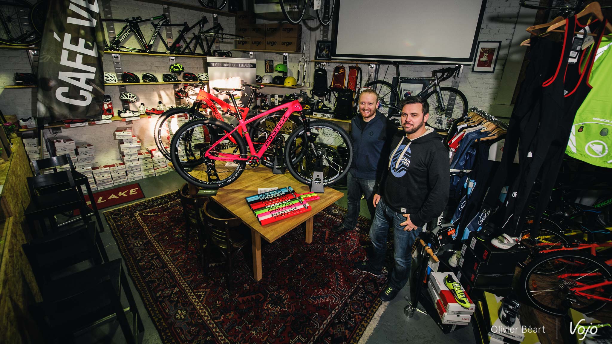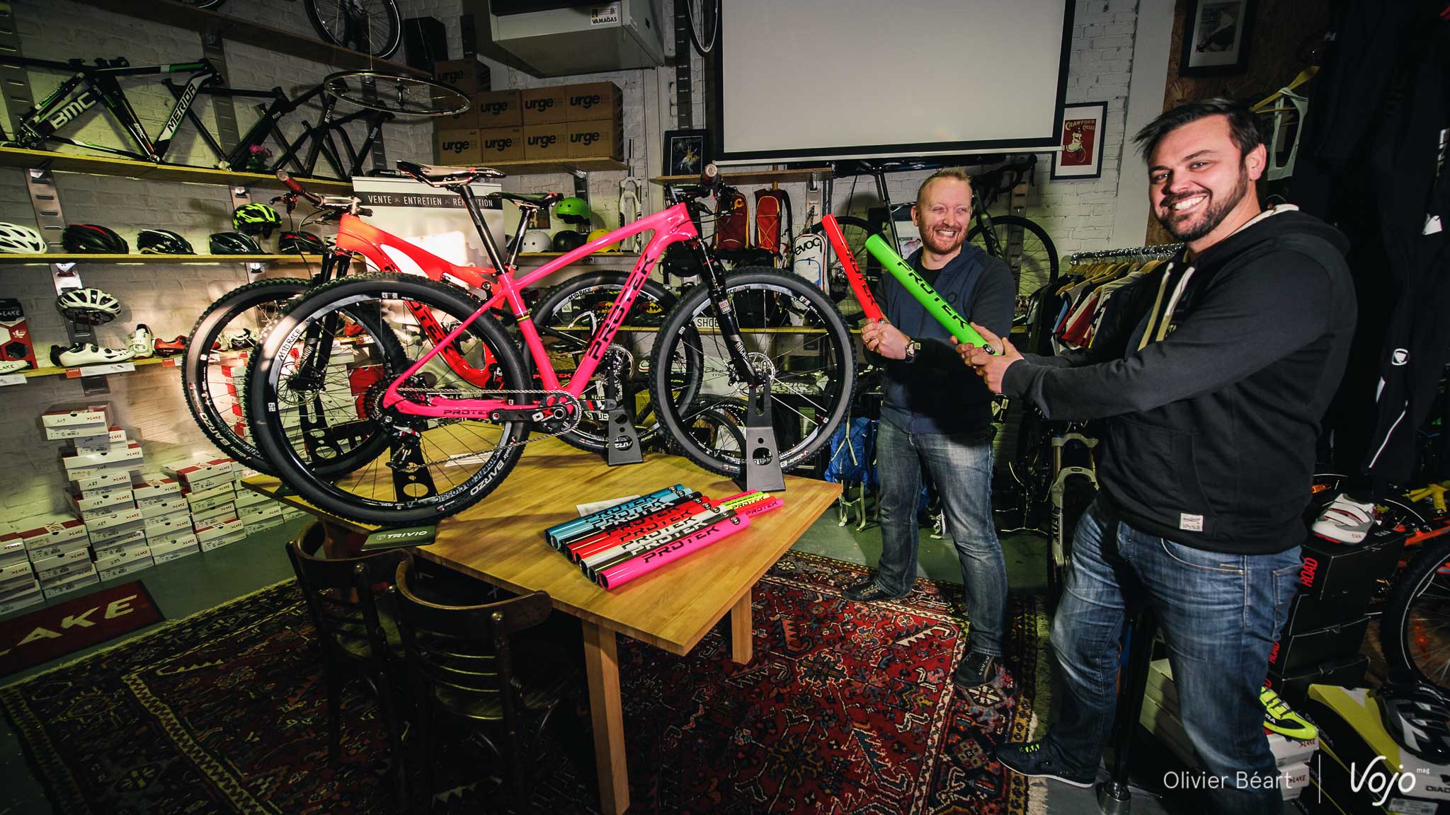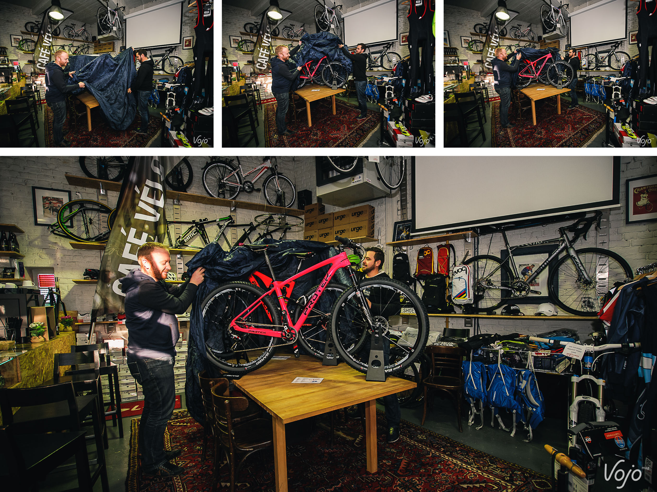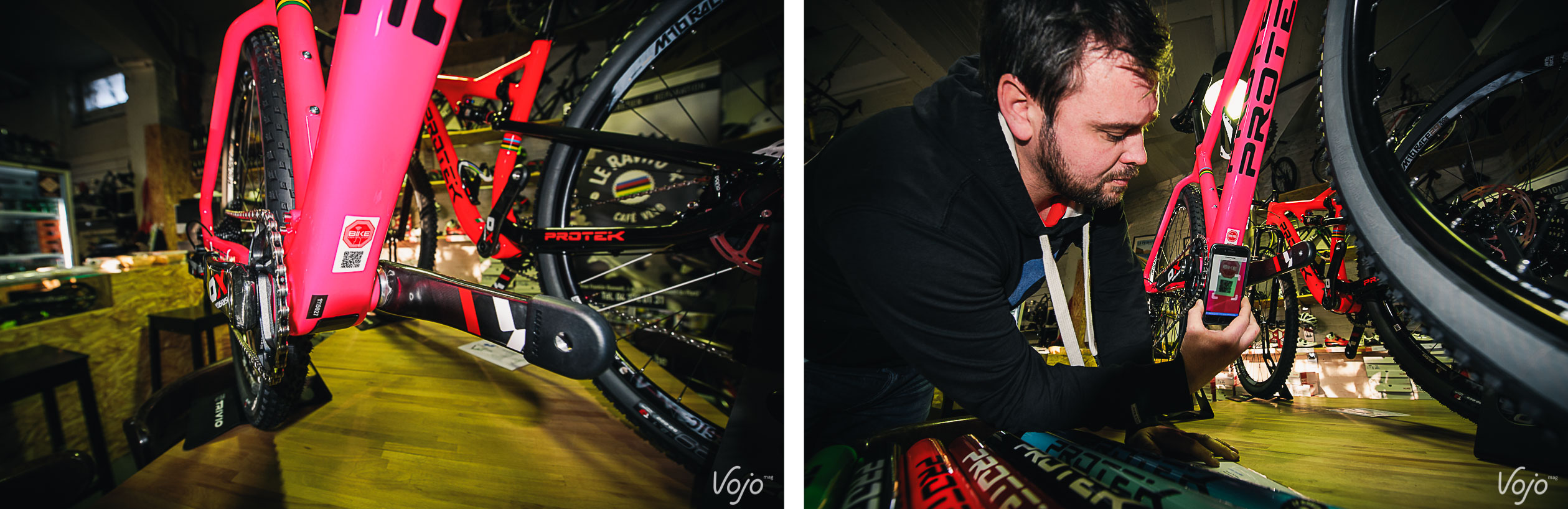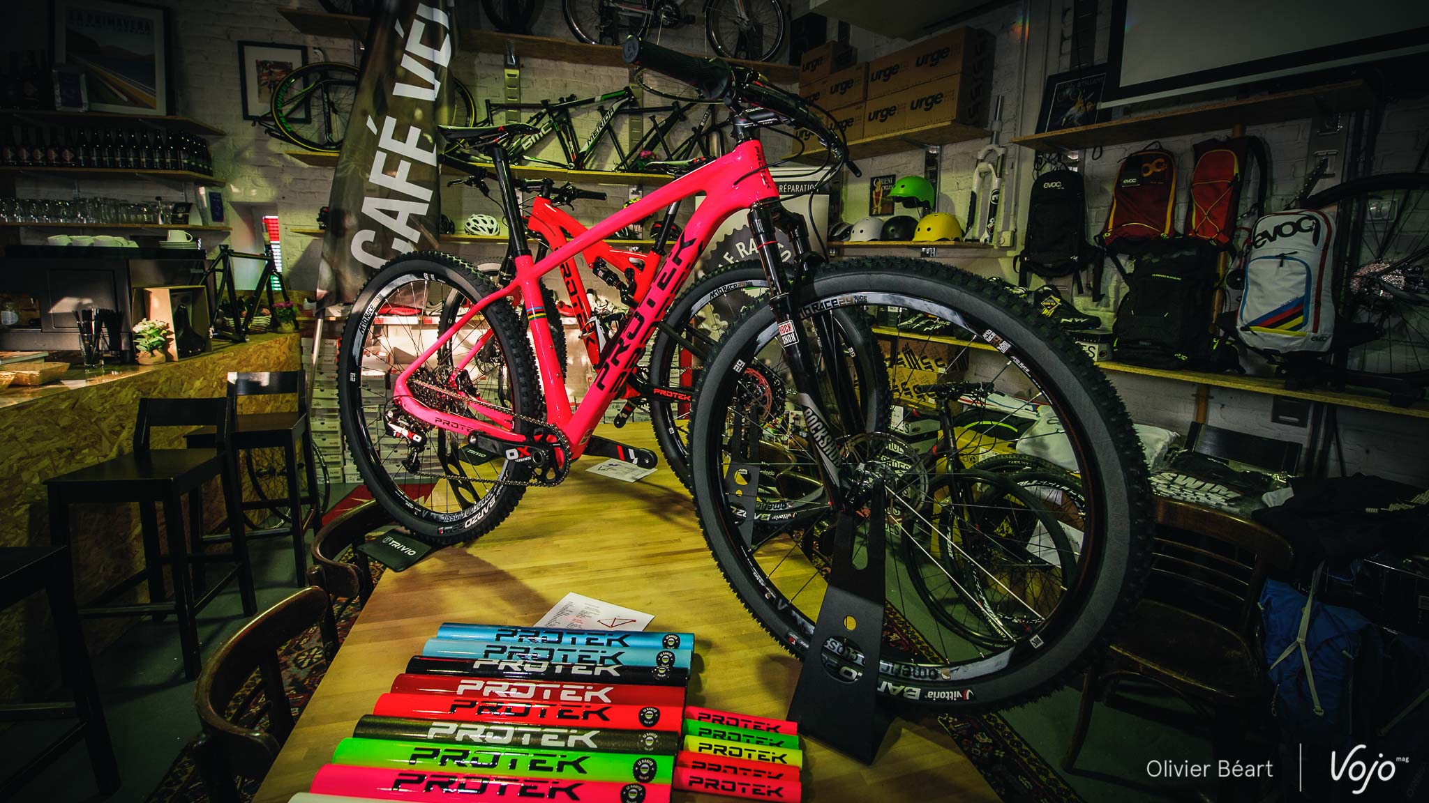 Sur une table disposée sur un tapis sans âge du plus bel effet, une bâche cache l’objet de ma visite « en voisin », puisque la rédaction de Vojo n’est pas bien loin. Les deux gaillards sont assez fiers de cette nouvelle petite marque qui vient compléter leur assortiment et qui, à terme, devrait être vendue également dans quelques magasins belges et français sélectionnés. Sourire aux lèvres, ils lèvent le voile sur deux cadres aux couleurs… flash ! « C’est volontaire! On ne veut pas que ces vélos passent inaperçus. Quand les gens les verront, on veut qu’ils se demandent de quelle marque il s’agit et qu’on puisse entamer la discussion. C’est aussi une façon de montrer les possibilités de personnalisation du cadre, puisque chez Protek, on peut choisir sa couleur sans supplément de prix ».