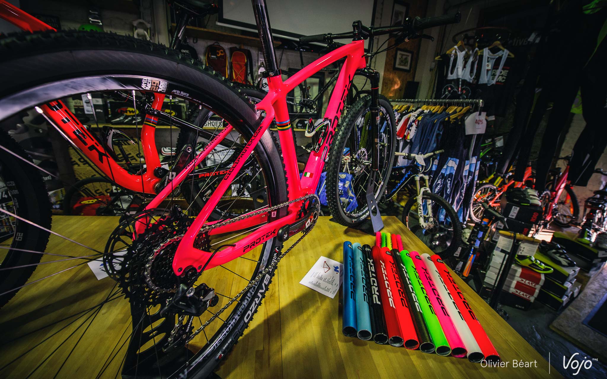 Le full a un air de déjà-vu. Normal, il s’agit d’un cadre générique inspiré du Scott Spark. A défaut d’originalité (on le retrouve sous de nombreuses autres marques), c’est une valeur sûre. « Il permet de proposer un full léger (10,1kg tel que montré ici) et personnalisable à un tarif correct (2399€ le cadre). Mais nous savons qu’Antonio Carotta est en train de finaliser un full suspendu maison qui devrait sortir courant 2016. Nous l’attendons avec impatience. Il nous a aussi montré une ligne de composants, avec notamment des cintres et des tiges de selle en carbone et kevlar qui s’annoncent très légers et qui viendront compléter l’offre ».