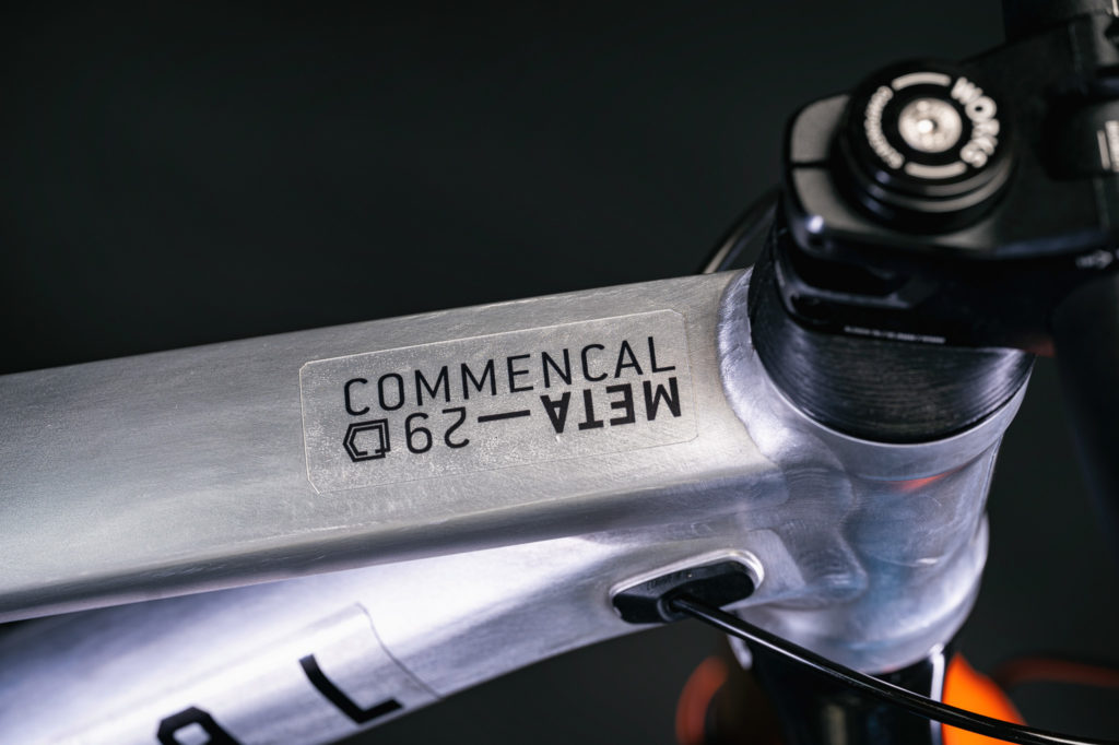 Etant donné que le vélo sera roulé en compétition, la finition est un minimum travaillée mais plusieurs indices montrent que Commencal n’a pas encore arrêté tous ses choix : le support d’amortisseur sur le tube supérieur est vissé plutôt que moulé ou soudé pour être changé facilement, on aperçoit un drôle de bosselage au-dessus de l’amortisseur…