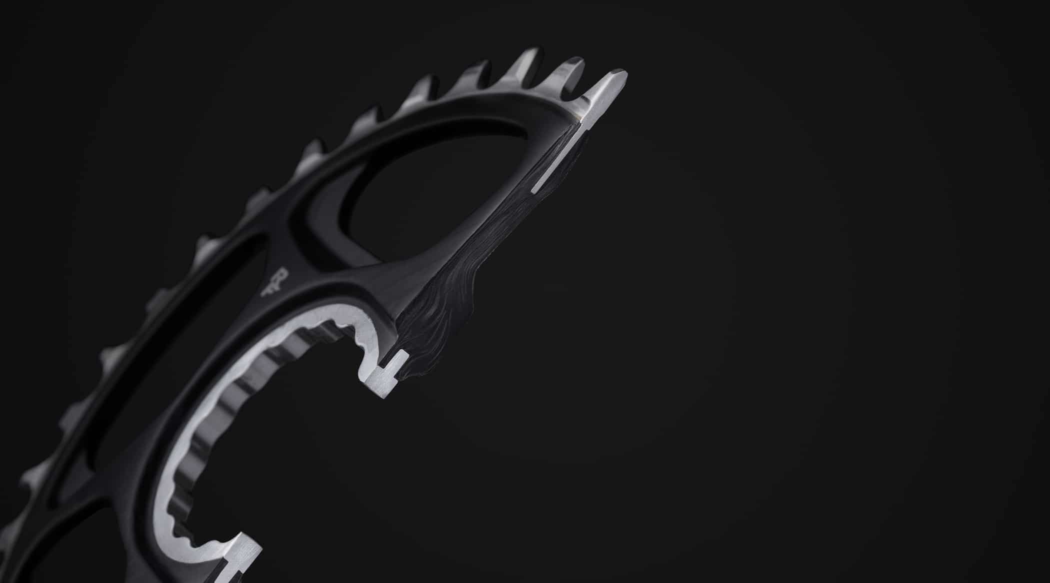 On trouve donc de l’acier pour les dents, plus lourd mais dont la durabilité est incomparable pour cette partie en contact avec la chaîne. Race Face annonce une durabilité au moins trois fois supérieure à l’aluminum. Pour contrecarrer le désavantage de son poids supérieur, l’acier n’est utilisé que pour les dents et une fine couronne externe qui vient se fondre dans l’étoile qui est, elle, réalisée en carbone moulé. Rigide et léger, le carbone est en effet parfait pour cette partie du plateau. Enfin, l’interface avec la manivelle est assuré via une étoile en aluminium.