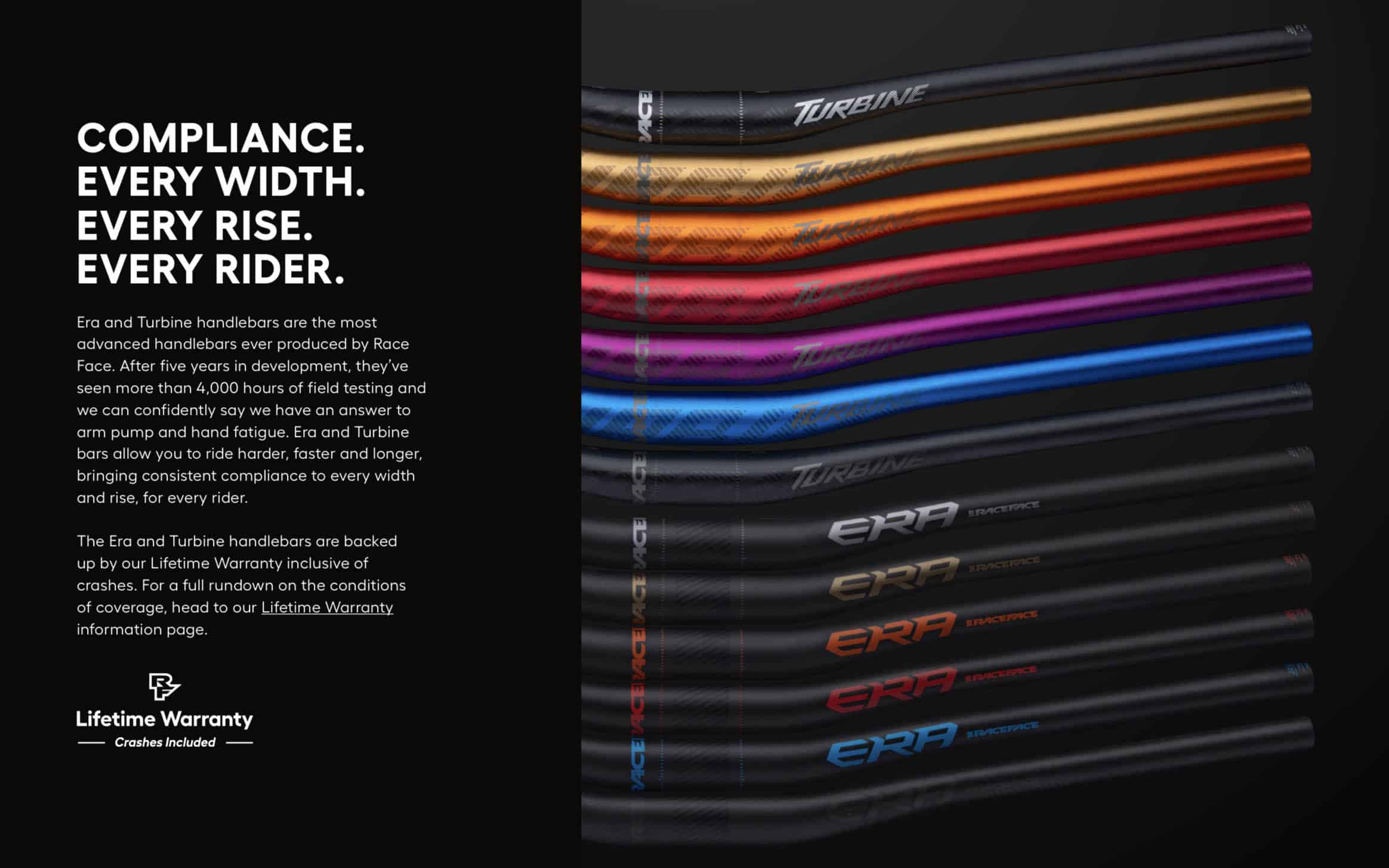Dans le même esprit, et pour coller aux goûts de tous les pilotes, Race Face propose des options de rise 10, 20 et 40 mm, chacune avec une conception qui vise à apporter la même tolérance verticale. Ajoutez à cela les différentes options de couleurs et vous obtenez une gamme extrêmement vaste… qui donne beaucoup de choix au consommateur, mais qui risque aussi de donner des cheveux gris aux gestionnaires des stocks ! Les tarifs sont de 149€ pour le modèle carbone et 119€ pour l’alu. A noter que Race Face offre une garantie à vie sur ses cintres, crashes compris !